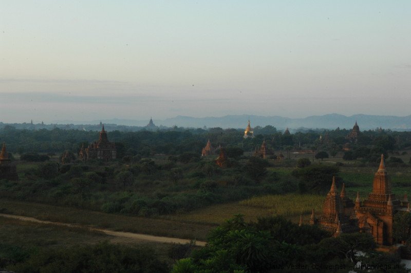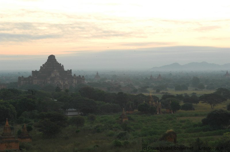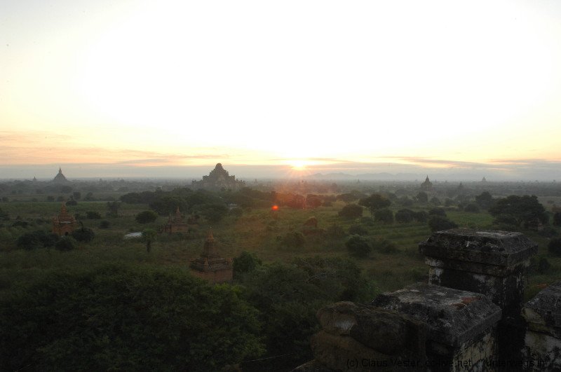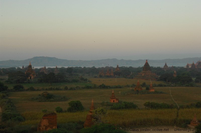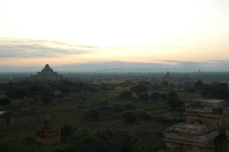 Morgens um 5.30 Uhr sind es nur eine Handvoll Touristen, die auf der obersten Ebene der Shwesandawn Pagode den Sonnenaufgang erleben wollen. Neben dem deutschen Autor dieser Zeilen warten ein Amerikaner nebst Freundin, ein junger Russe, ein Chinese und ein Einheimischer aus Yangon mit ihren Kameras darauf, dass es allmählich hell wird. Der Birmane erzählt, dass er jedes Jahr um diese Zeit hier her kommt, um das Ananda Pagoda Festival zu besuchen. Von dort kündigt der Uhrturm im klassischen Big-Ben-Stil die volle Stunde an. Ebenfalls lautsprecherverstärkt weht der morgendliche Gebetsgesang des Vorbeters zu uns herüber. Ganz langsam kämpft sich die Sonne über eine Wolkenbank am Horizont und taucht die Ebene vor uns in ein zartgoldenes Licht. Deshalb kamen wir hierher, vereint aus allen Himmelsrichtungen…
