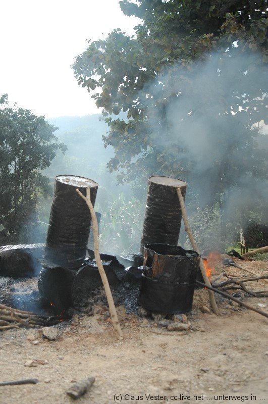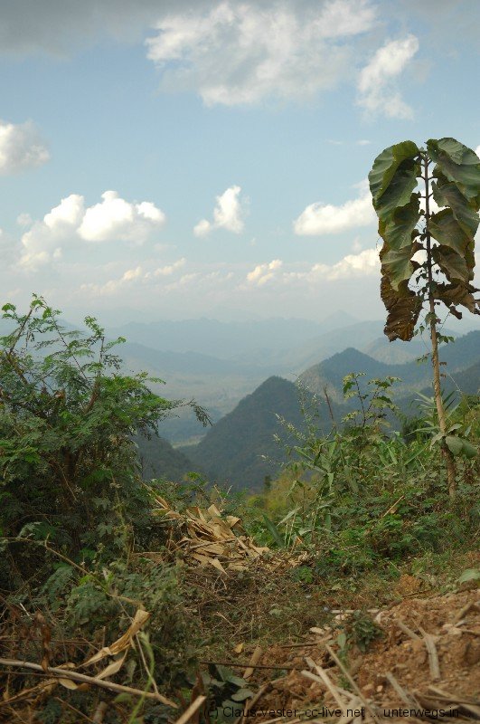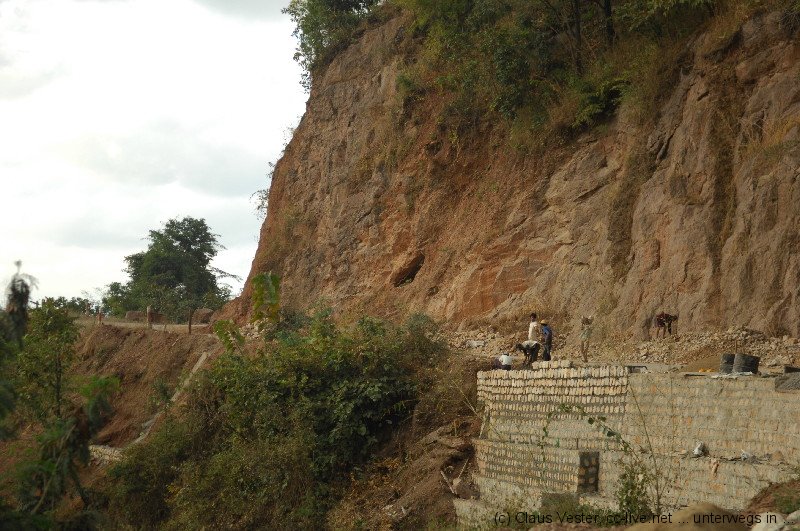 Immer wieder passieren wir kurze Baustellen, an denen die Straße neu geteert und verbreitert wird. Vor einer Kehre müssen wir kurz halten, da um die Ecke gerade gesprengt wird. Ein dumpfer Knall, etwas Gerumpel und schnell rennen die Arbeiter los, um das Geröll von der Straße zu räumen. Es ist überhaupt viel Handarbeit im Spiel bei dieser Art des Straßenbaus. Die Arbeiter werden einfach in den umliegenden Dörfern rekrutiert.