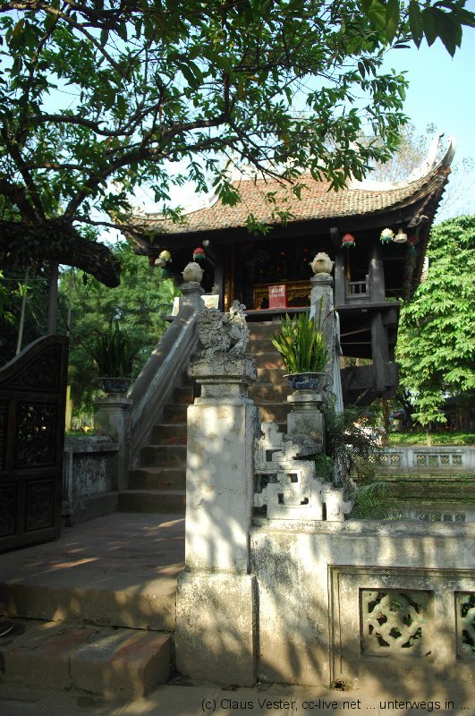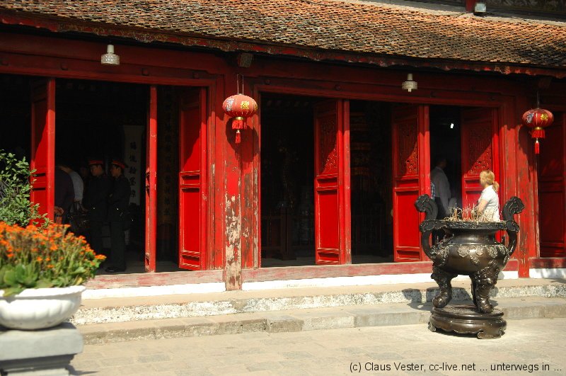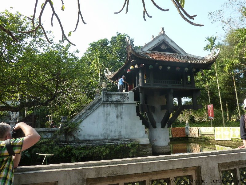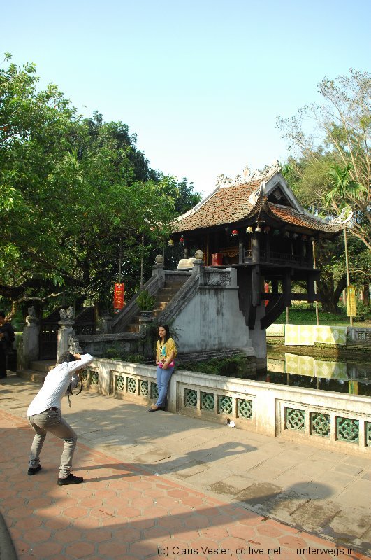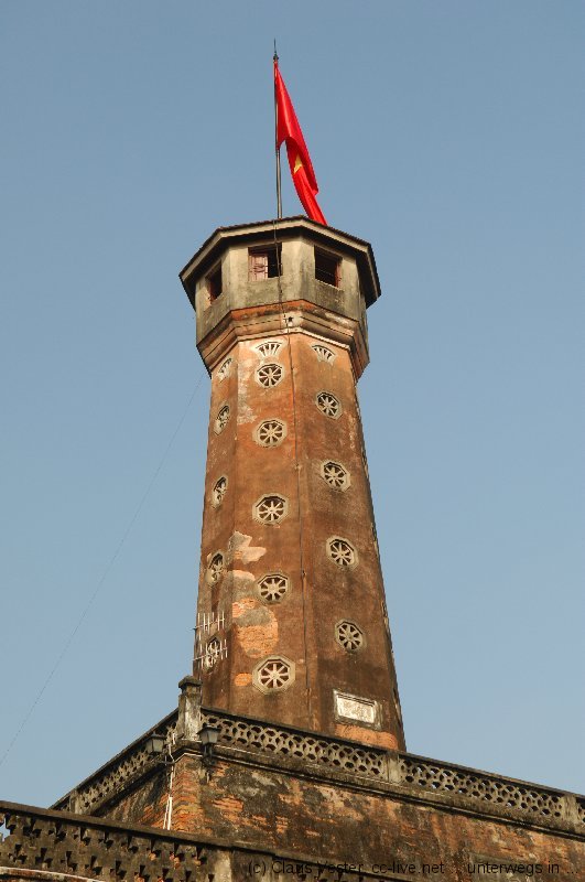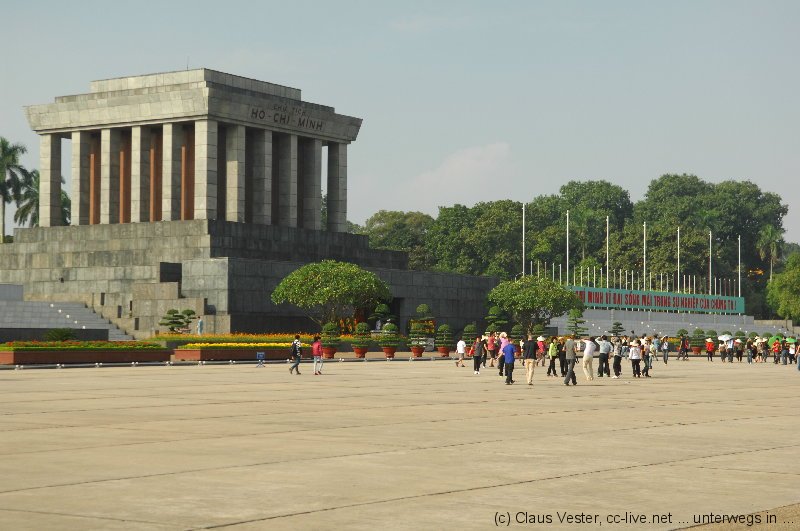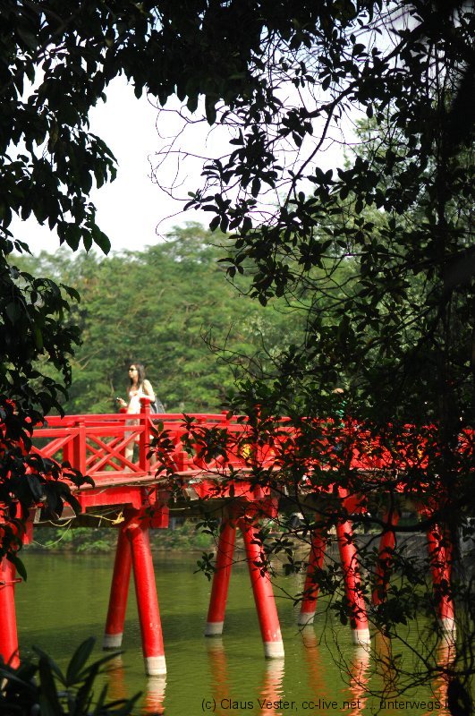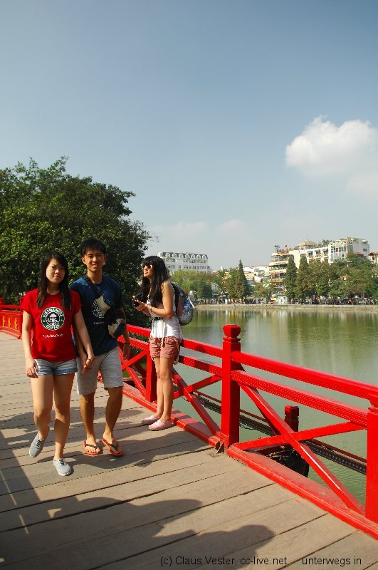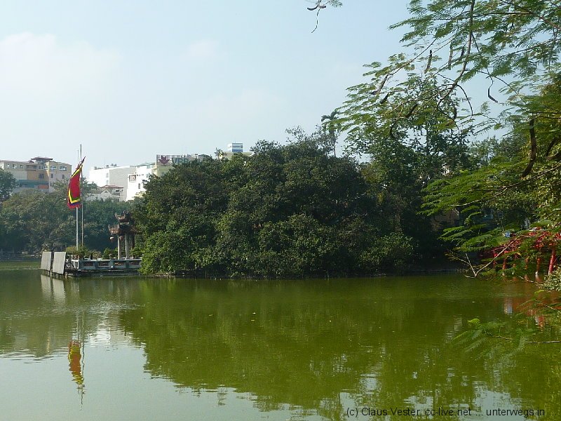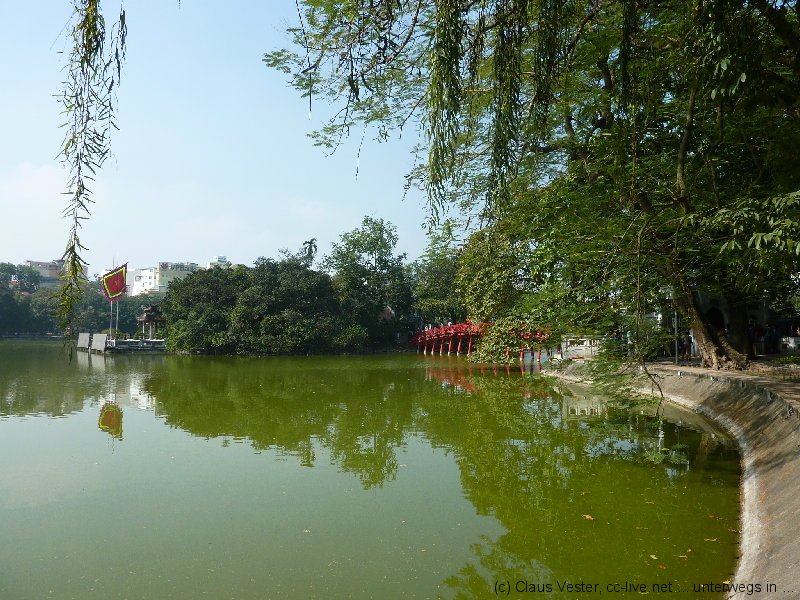Praktischerweise liegen viele Sehenswürdigkeiten gleich um die Ecke, wenn man in der Altstadt wohnt. Zwei Blocks entfernt ist man bereits am Hoan-Kiem-See. Dort führt die rote The-Huc-Brücke zum Jadeberg-Tempel auf einer kleinen Insel. Vorbei am Flaggenturm marschierten wir dann weiter zum Ho-Chi-Minh-Mausoleum. Für eine Besichtigung war es jedoch schon zu spät. Die einbalsamierte Leiche des einstigen vietnamesischen Präsidenten kann nur zwischen 8 und 10 Uhr besucht werden.