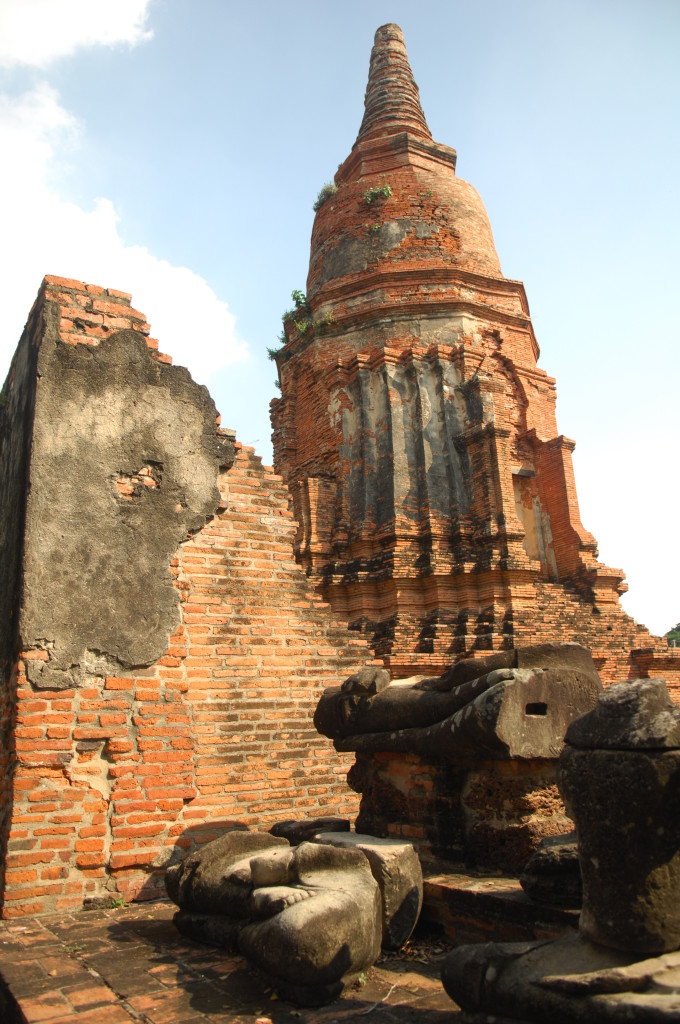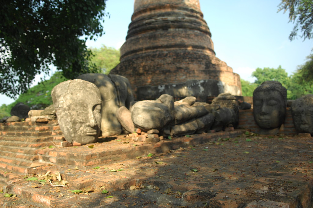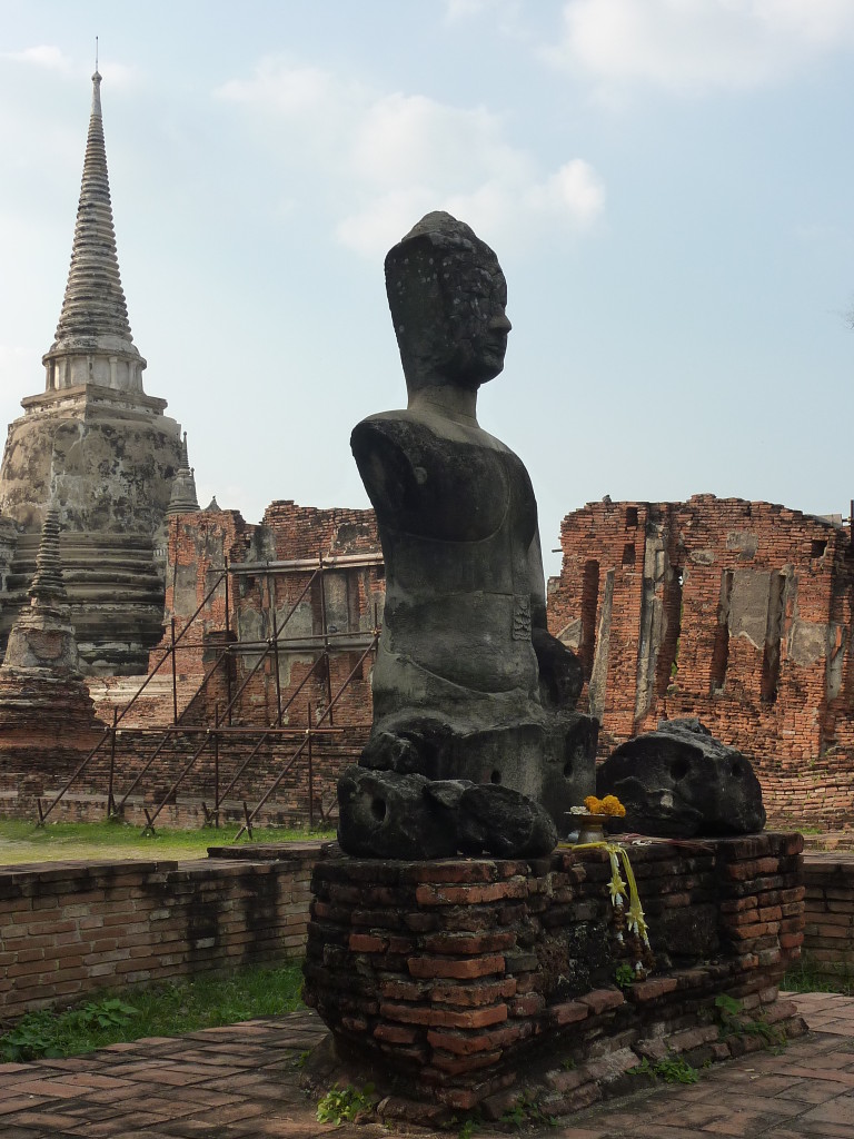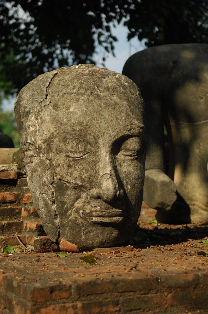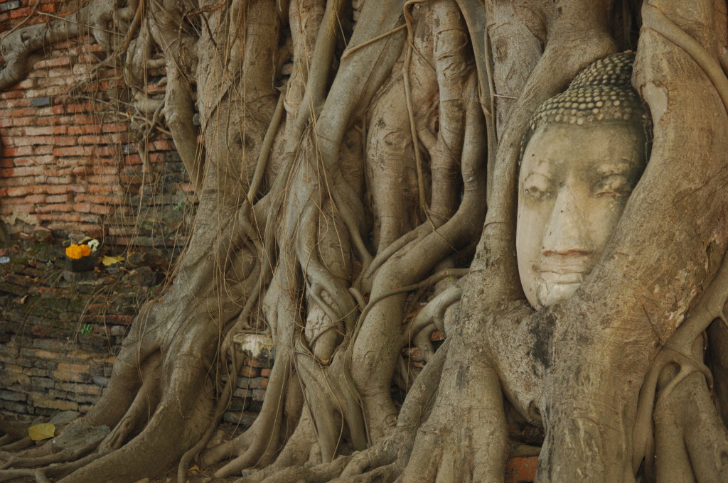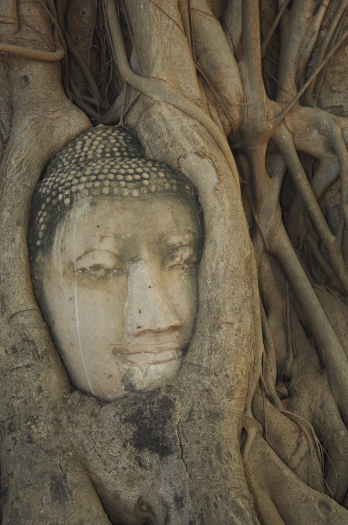 Der Budhhakopf verbirgt sich zwischen dem Wurzelwerk. Das heimliche Wahrzeichen von Ayutthaya befindet sich auf dem Gelände des Wat Maha That, einer der zahlreichen Ruinen der alten Königstadt. Sie befindet sich auf einem Areal, das vom Chao Praya umflossen wird. Die Spuren der schweren Überschwemmung von vor drei Jahren sind nahezu beseitigt.