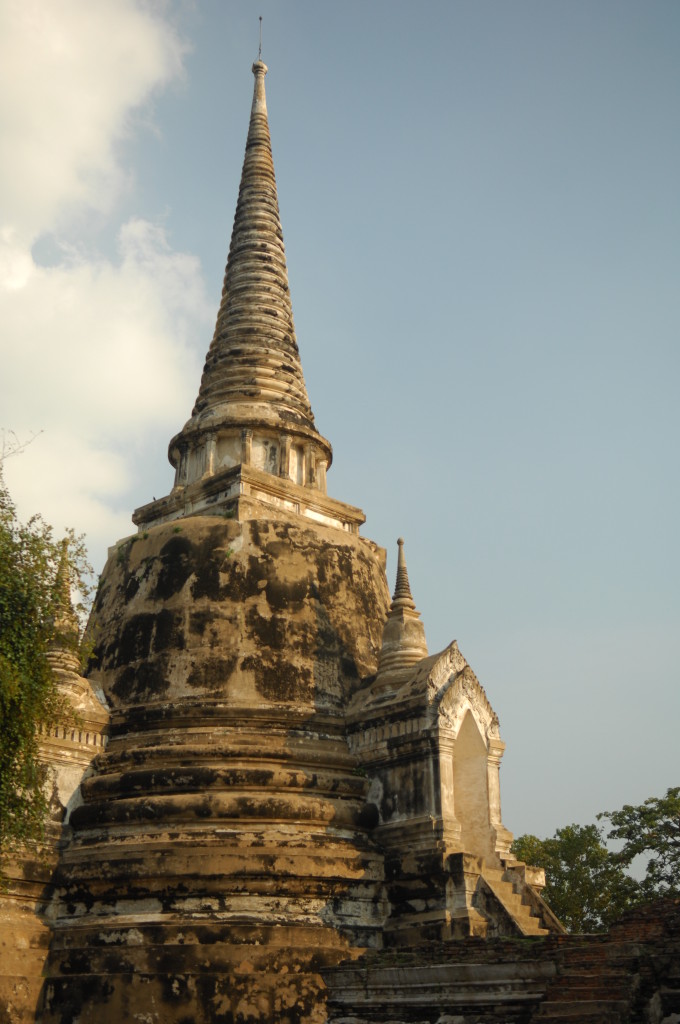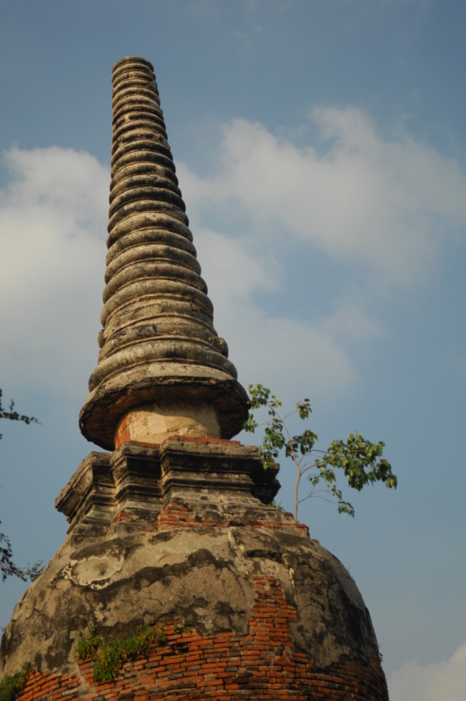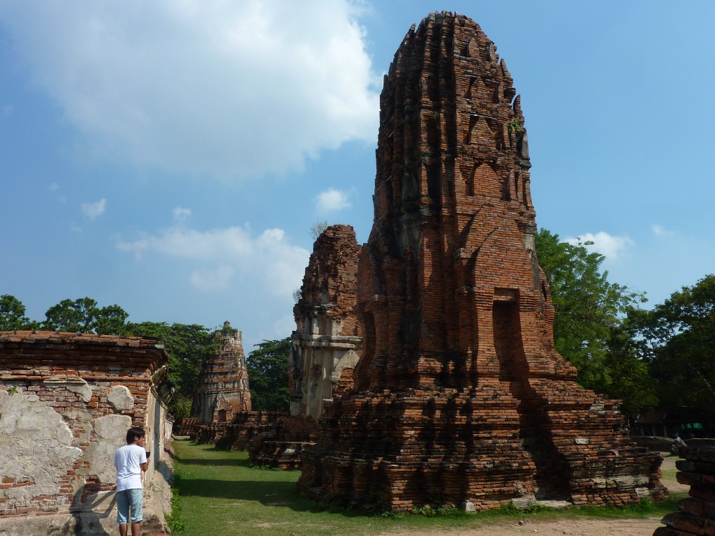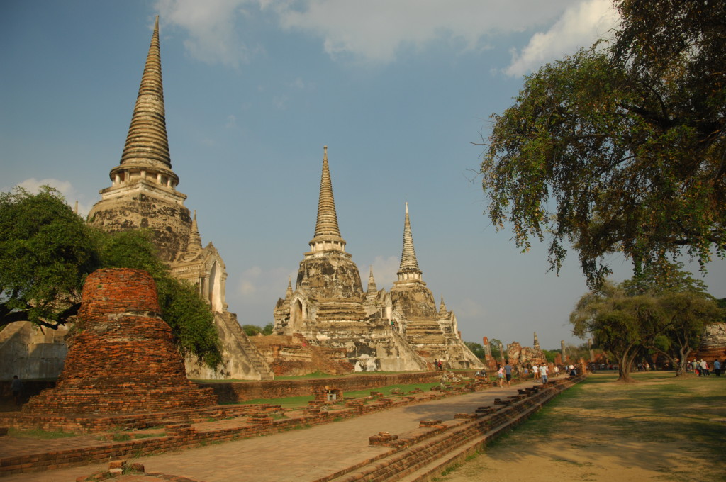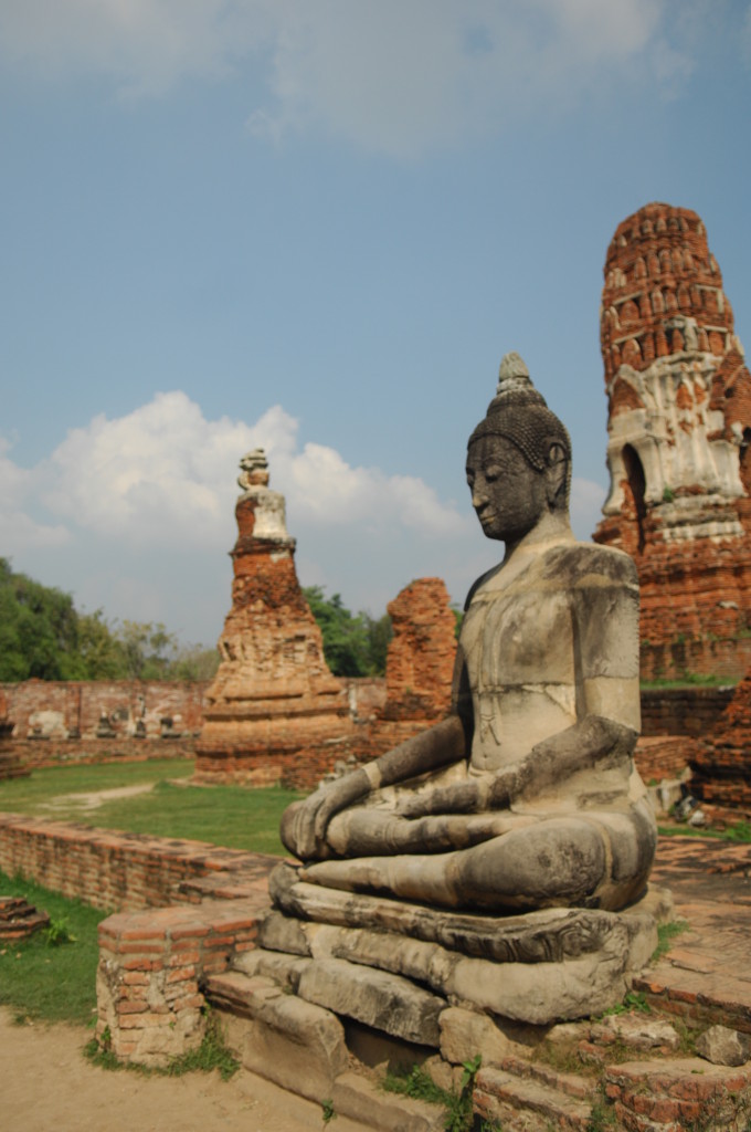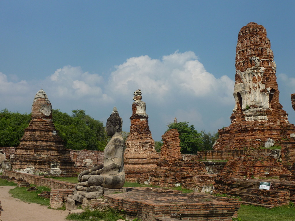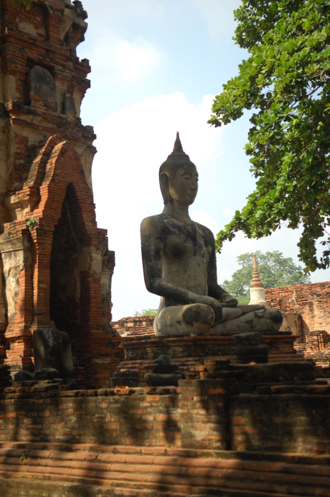 Der Budhhakopf verbirgt sich zwischen dem Wurzelwerk. Das heimliche Wahrzeichen von Ayutthaya befindet sich auf dem Gelände des Wat Maha That, einer der zahlreichen Ruinen der alten Königstadt. Sie befindet sich auf einem Areal, das vom Chao Praya umflossen wird. Die Spuren der schweren Überschwemmung von vor drei Jahren sind nahezu beseitigt.