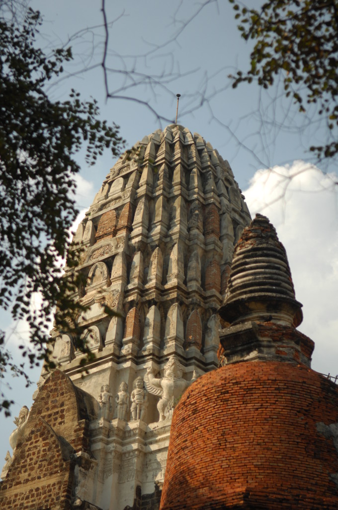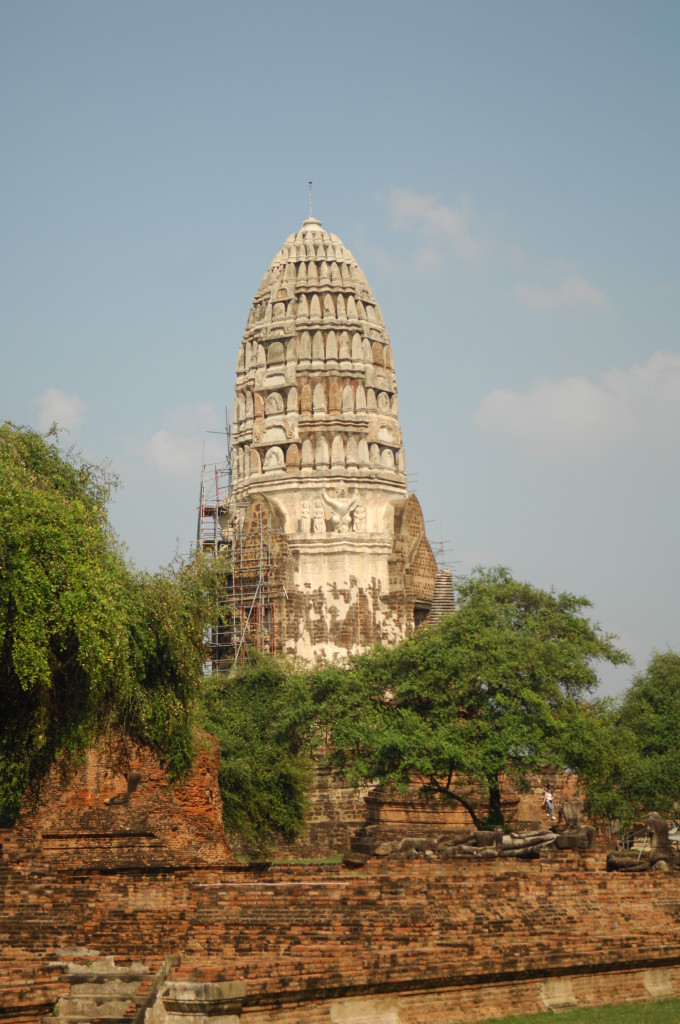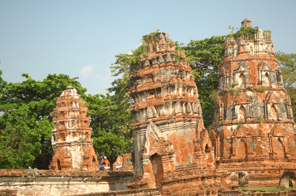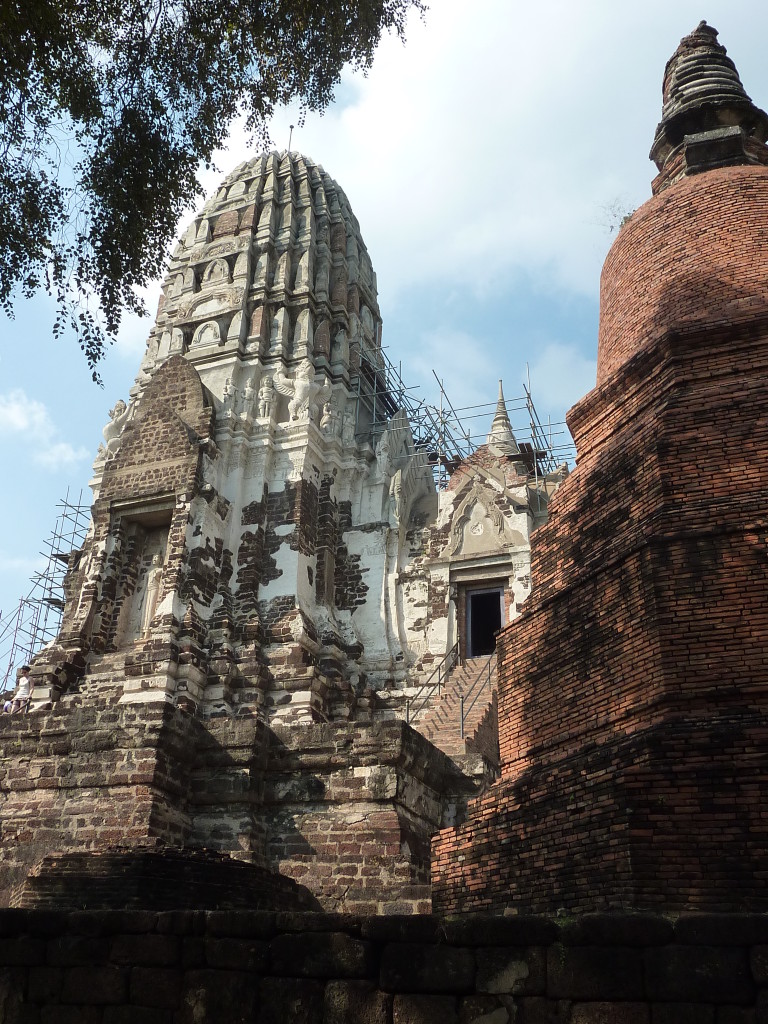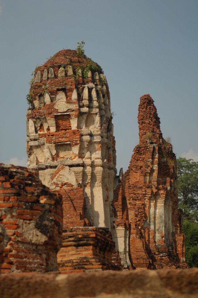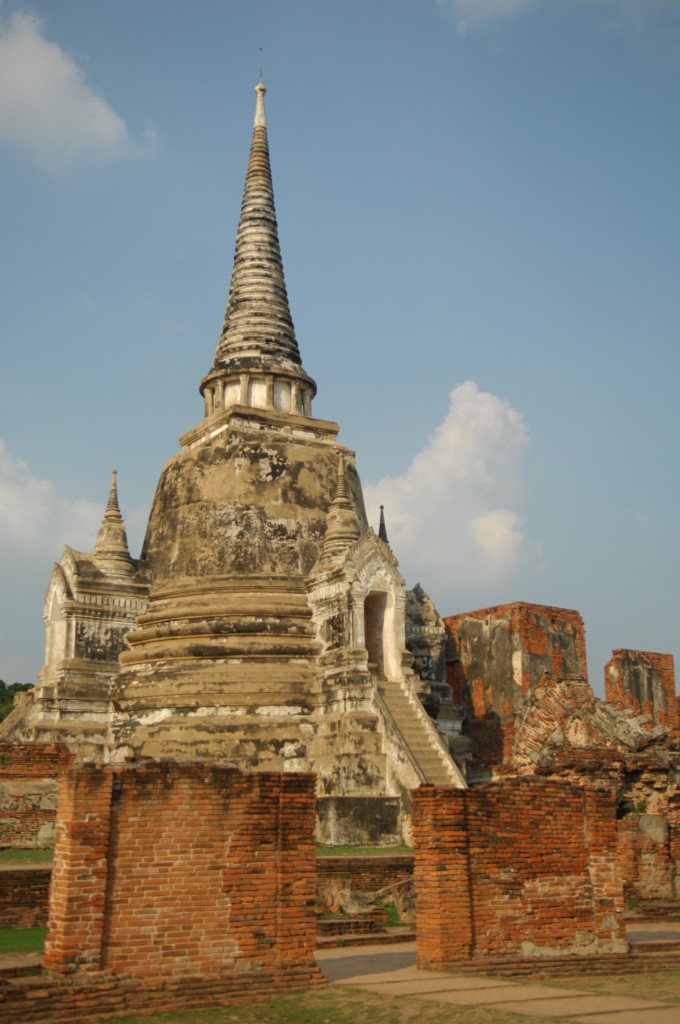 Der Budhhakopf verbirgt sich zwischen dem Wurzelwerk. Das heimliche Wahrzeichen von Ayutthaya befindet sich auf dem Gelände des Wat Maha That, einer der zahlreichen Ruinen der alten Königstadt. Sie befindet sich auf einem Areal, das vom Chao Praya umflossen wird. Die Spuren der schweren Überschwemmung von vor drei Jahren sind nahezu beseitigt.