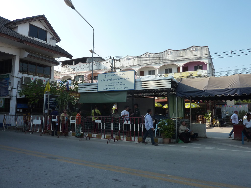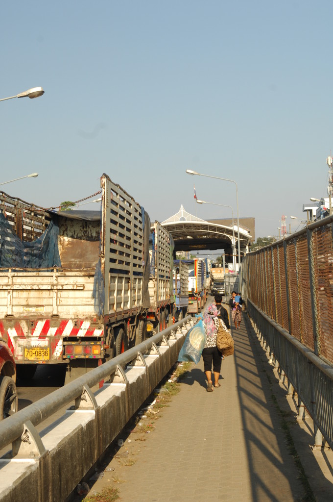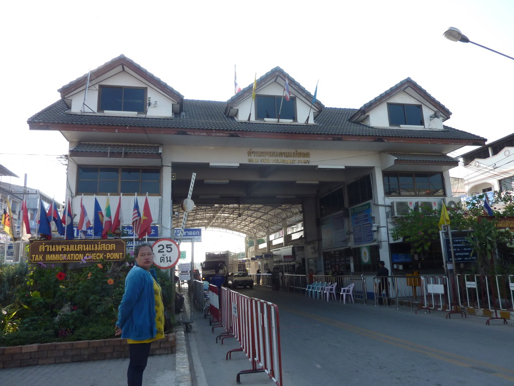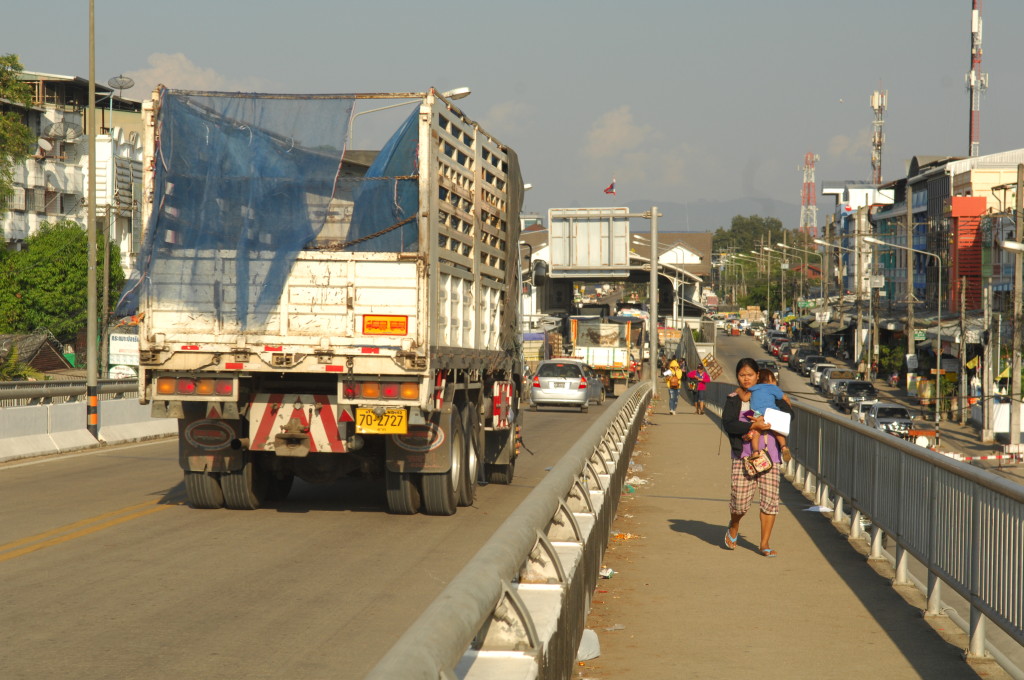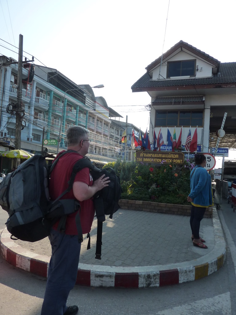 So einfach hatten wir es uns dann doch nicht vorgestellt. Am Busbahnhof müssen wir zwar zunächst noch 2 Stunden warten, weil der im Internet angekündigte stündliche Bus erst um zehn vor 12 Uhr planmäßig abfährt. Doch dann geht es Schlag auf Schlag: Mit dem Bus von Sukhothai in die Provinzhauptstadt Tak und dort ohne weiteren Aufenthalt gleich weiter mit einem Mini-Van zur thailändischen Grenzstadt Mae Sot. Der Kleinbus entlässt uns am Rand eines verwaisten Fleischmarkts, von Sammeltaxis oder Tuk Tuks für den Transport zur Grenze erstmal keine Spur. Diese wären jetzt an einem anderen Markt, 2-3 Blocks entfernt zu finden. Also Rücksäcke auf die Schultern und ab durch die Hitze.
