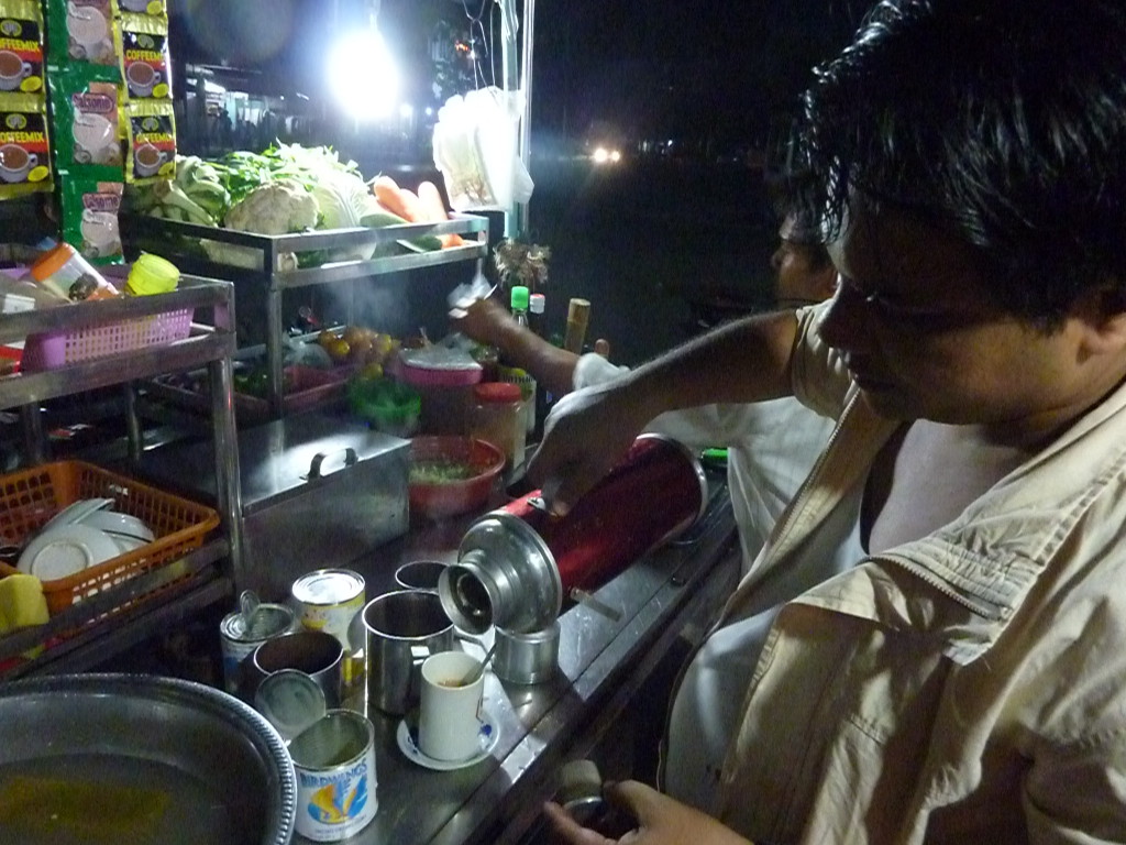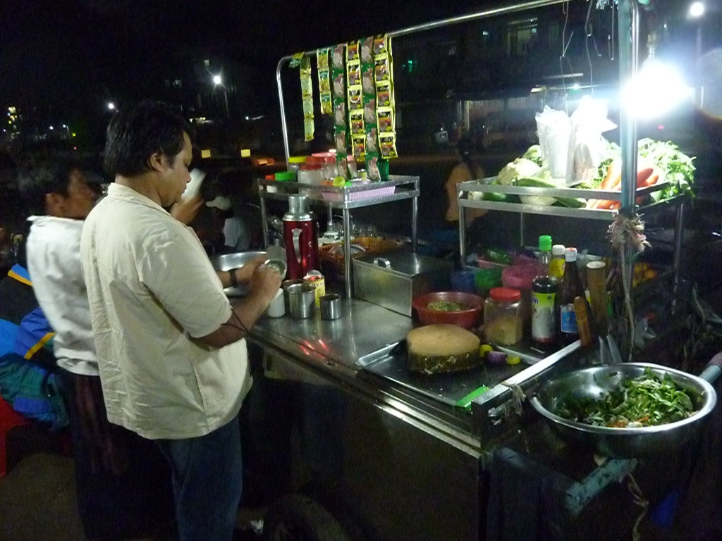 Nach einem kurzen Essensstopp auf halber Strecke erreichen wir gegen 20.30 Uhr Hpa An. Das Soe Brothers, das Lieblings-Hostel der Backpacker, ist erwartungsgemäß ausgebucht. Kein Problem, denn zwei Blocks weiter sind noch drei weitere Guest Houses. Jetzt müssen wir nur noch einen Geldautomaten zum Wechseln finden. Das gestaltet sich allerdings schwieriger als erwartet. Die erste ATM mag keine westlichen Kreditkarten, die zweite würde sie zwar akzeptieren, ist aber offensichtlich leer. Wir sind hungrig und müde. Es soll noch eine dritte Bank geben. Die Richtungsangaben sind freilich nicht eindeutig. Beim dritten Nachfragen an einer kleinen Garküche vor den geschlossenen Geschäften einer Hauptstraße siegt der Hunger. Konge, der Betreiber des fliegenden Restaurants nimmt auch thailändisches Geld.