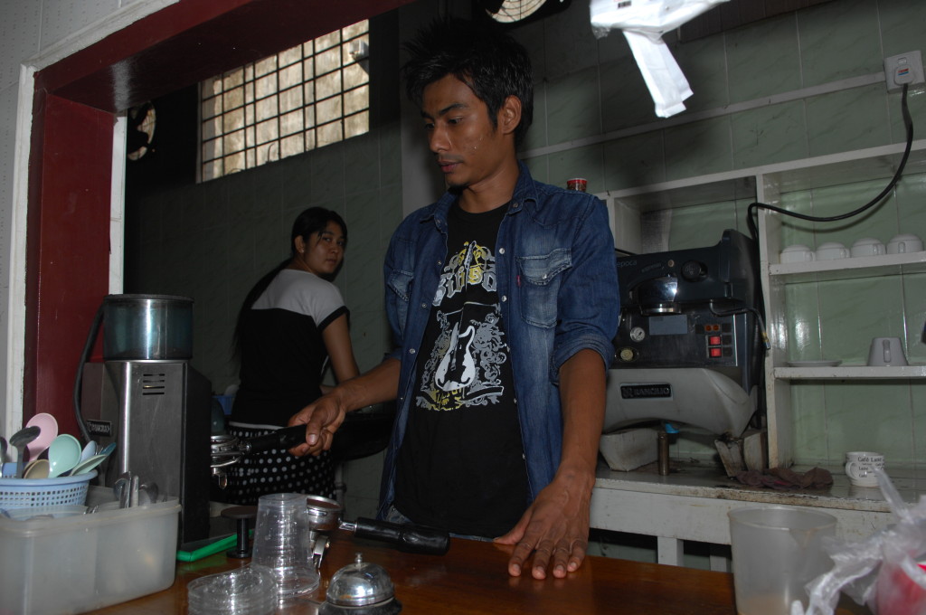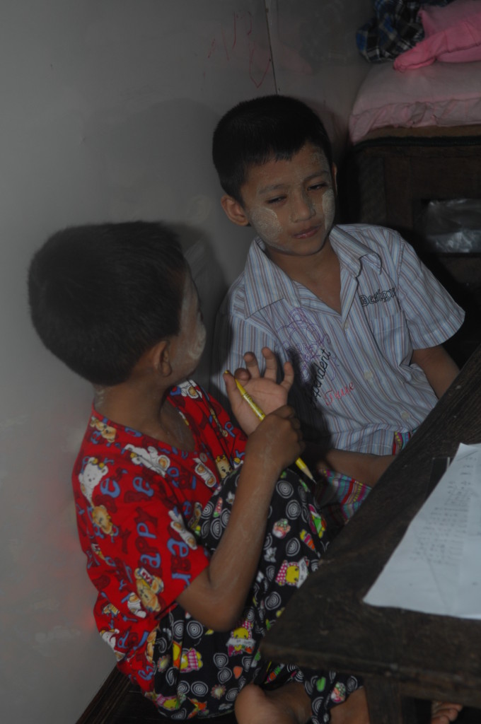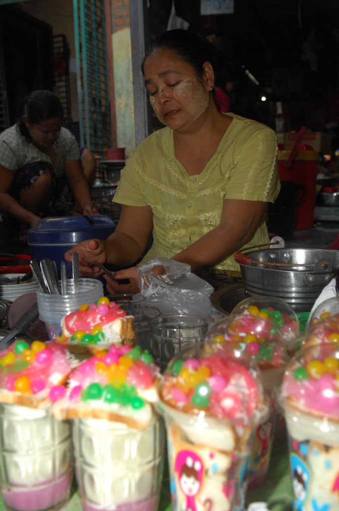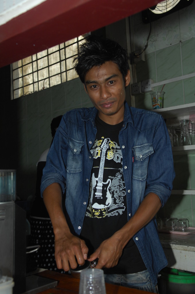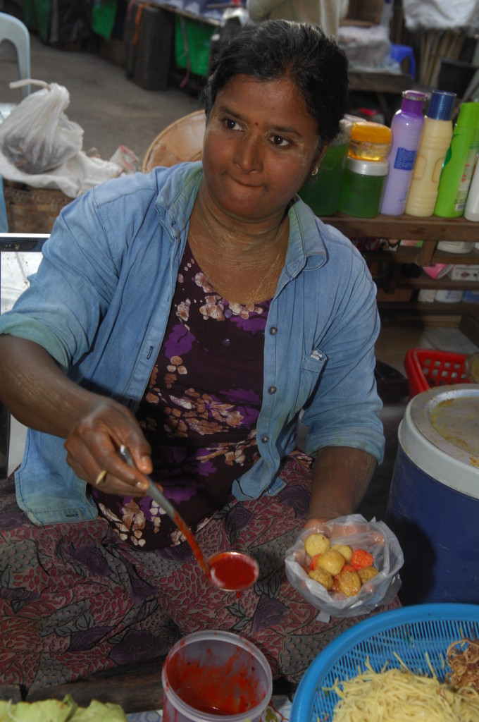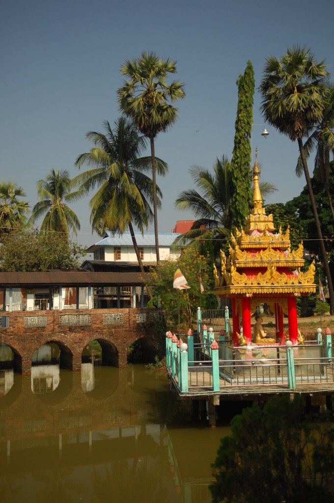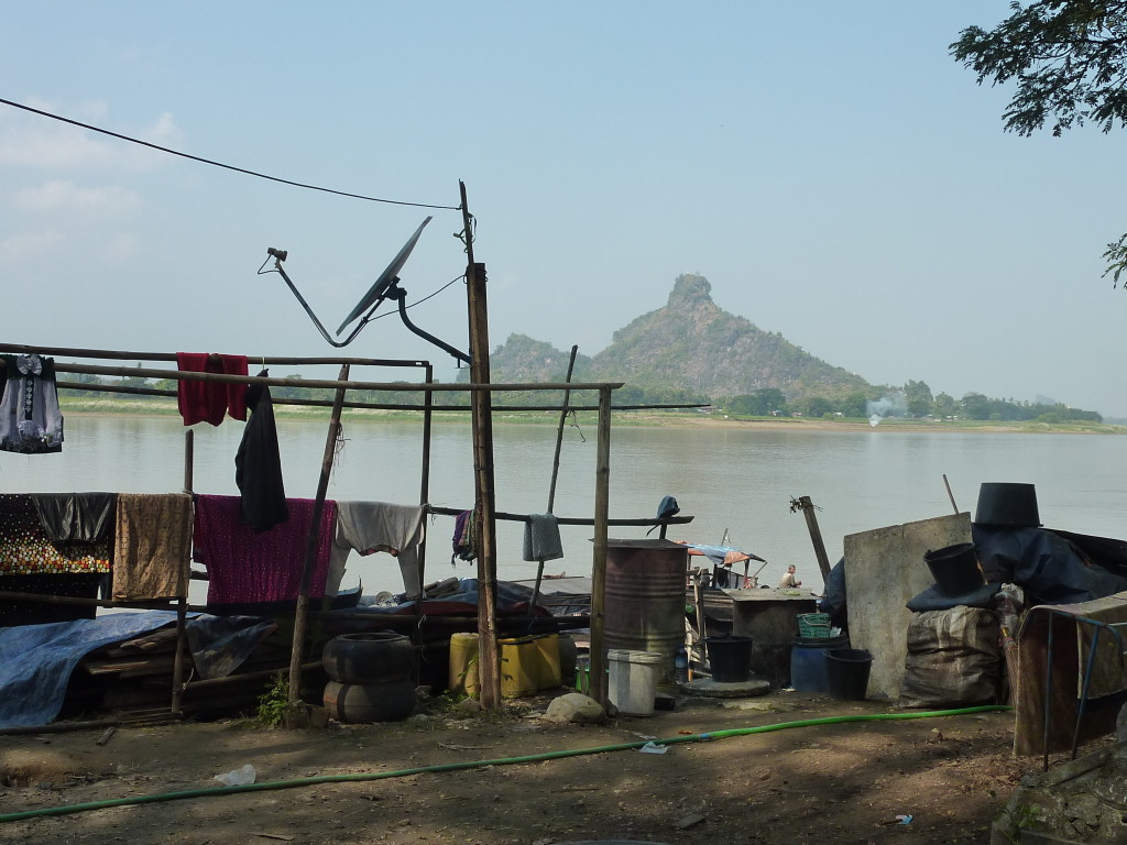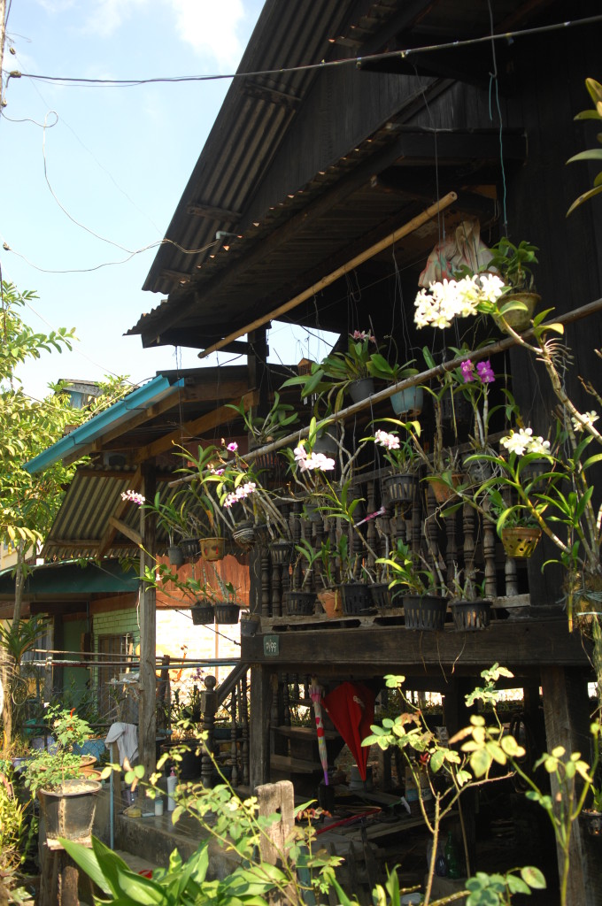 Entlang der parkähnlichen schmalen Uferpromenade mit Bohnenplantagen an der steilen Uferböschung wandern wir ein wenig stadtauswärts und biegen schließlich in eine Wohnsiedlung mit traditionellen Holzhäusern ab. Hier hat sich seit Jahren nichts verändert. Auffällig, wie sauber und gefegt hier die Straßen und Wege im Vergleich zu den öffentlichen Anlagen sind. Von allen Seiten schallt uns ein freundliches Mingalaba entgegen. Die Menschen sitzen auf den Terrassen oder unter den Stützpfählen und gehen ihrem jeweiligen Handwerk nach. Bleiben wir irgendwo länger stehen, um zum Beispiel die üppigen Orchideen an den Balkonen zu bewundern, wird das neugierig und mit freundlichem Lachen begleitet. Touristen scheinen sich nicht sehr häufig hier zu verirren.