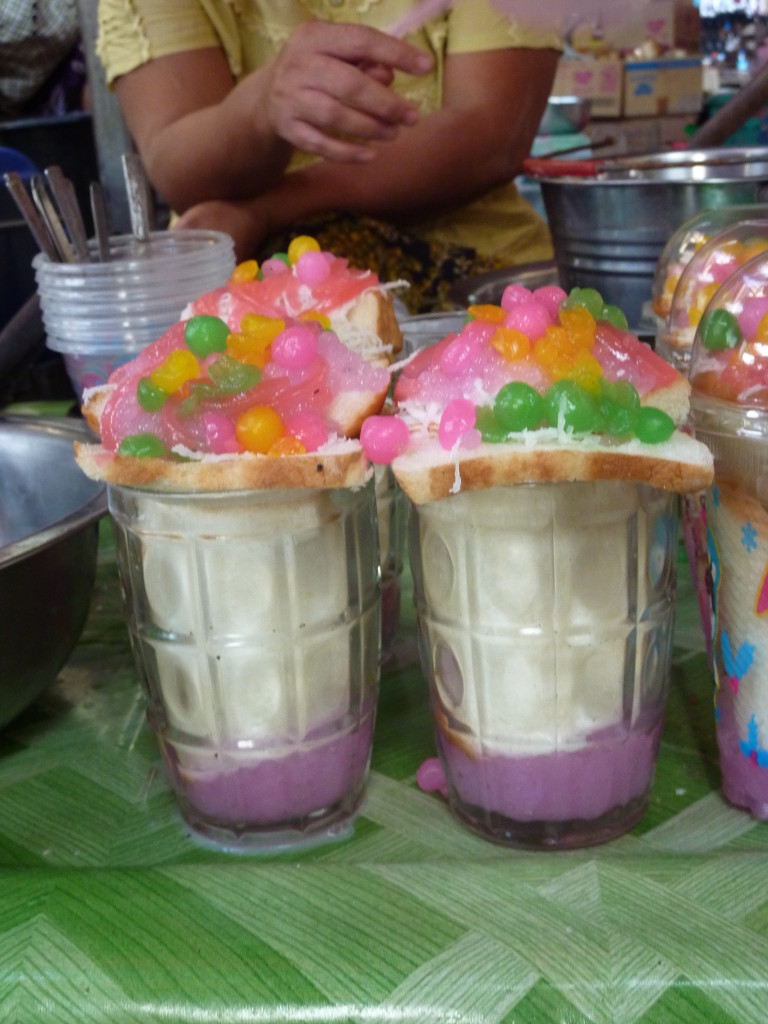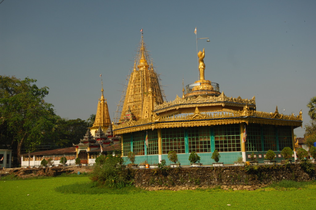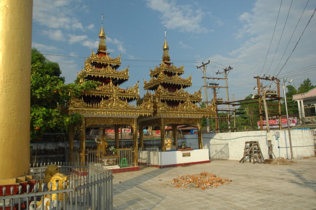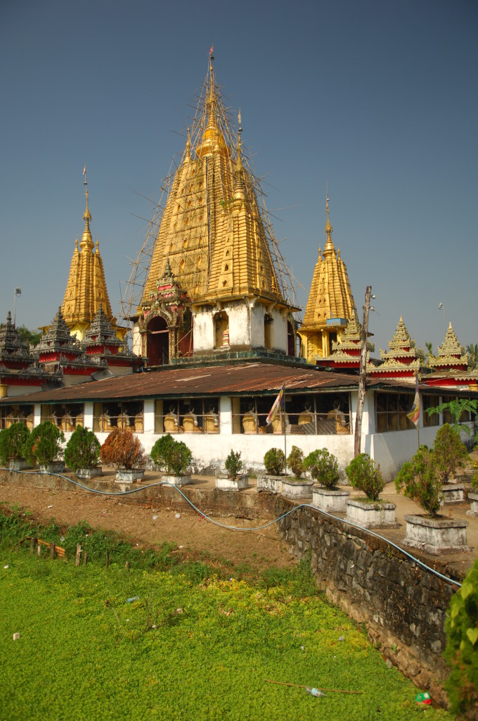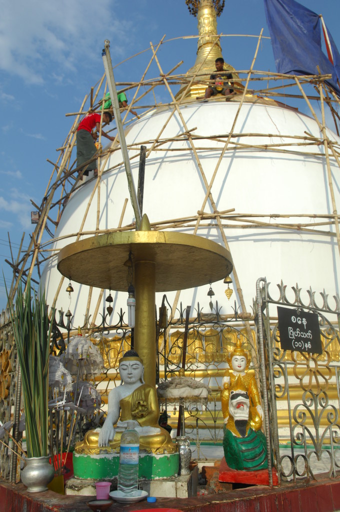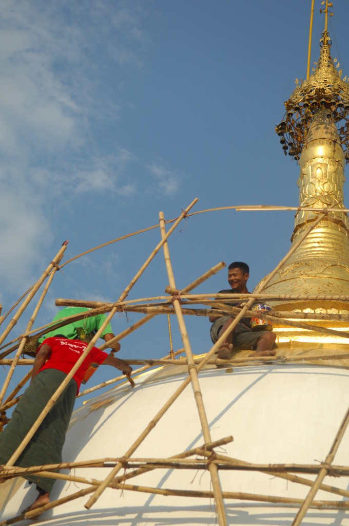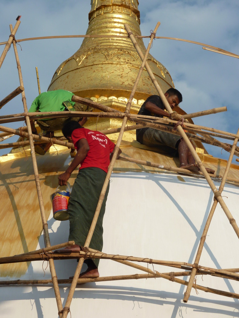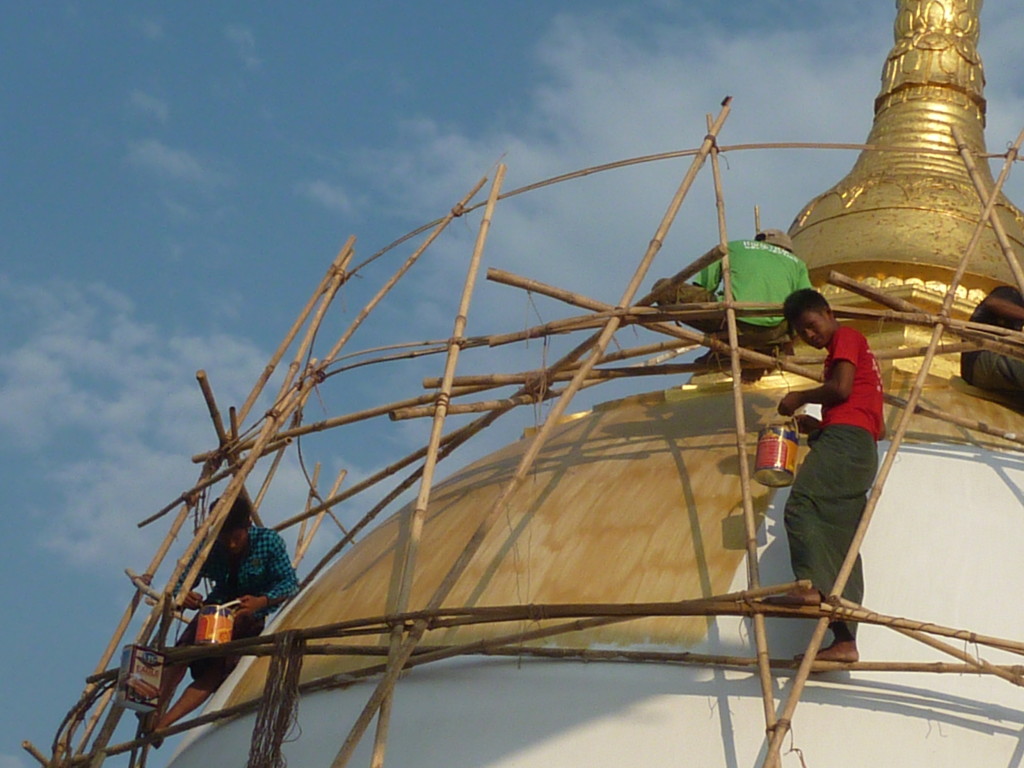Zurück in der Innenstadt beuchen wir zunächst ein Wat, in dem gerade eine Stupa vergoldet wird. Die Arbeiter turnen behände und völlig ungesichert über schmale Bambusstangen rund um die noch weiße Kuppel. Gleich um die Ecke wird einem jungen Mönch die Glatze geschoren. Alltag in einem buddhistischen Heiligtum.