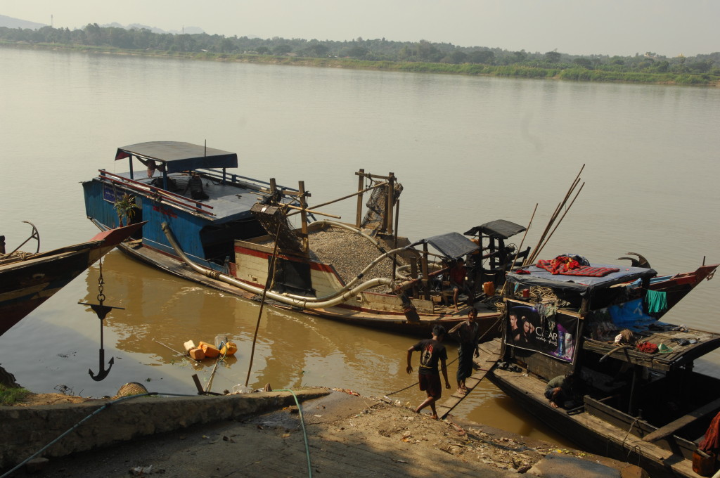 Am Fluss wird mit großen Rohren Kies vom Grund gesaugt und die Uferböschung hochgepumpt. In Becken werden Sand, Kies und Gold getrennt und das Wasser rinnt zurück in den Fluss. Ob sich der Aufwand lohnt? Den Eingang der Niederlassung der hier tätigen Firma ziert zumindest ein vergoldeter Steinbrocken.
