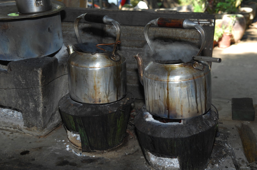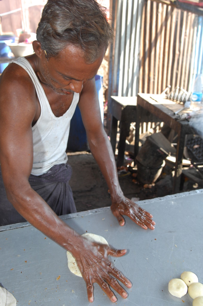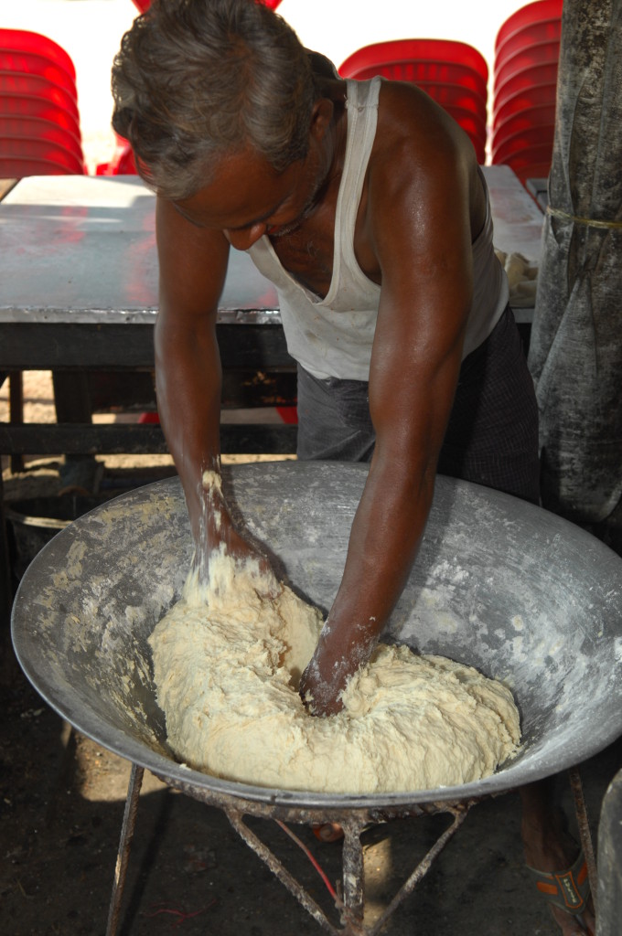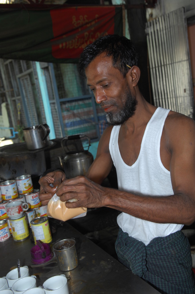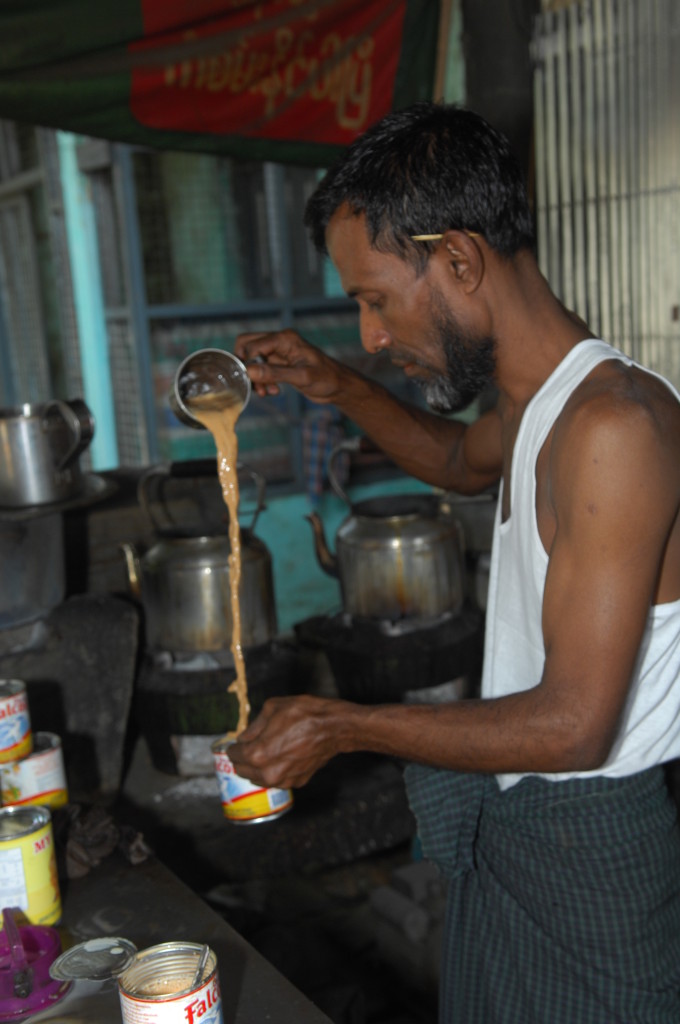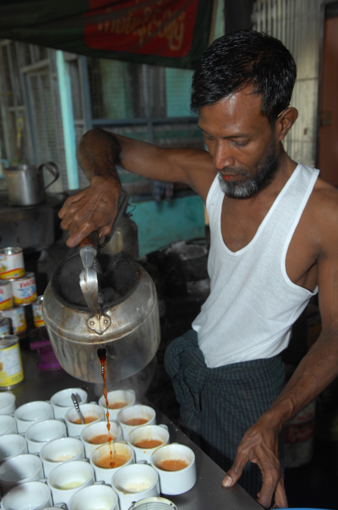 Vor der Flussbiegung am nördlichen Ende der Stadt lädt eine Teestube zum Verweilen ein. Hier gibt es den typisch burmesischen Kaffee – aufgegossen über einer beachtlichen Portion süßer Kondensmilch. Dazu stellt man uns gleich noch ein paar Schälchen mit unterschiedlichen fettgebackenen Teigtaschen auf den Holztisch: Die herzhaften und süßen Samosas sind frisch frittiert und schmecken köstlich.