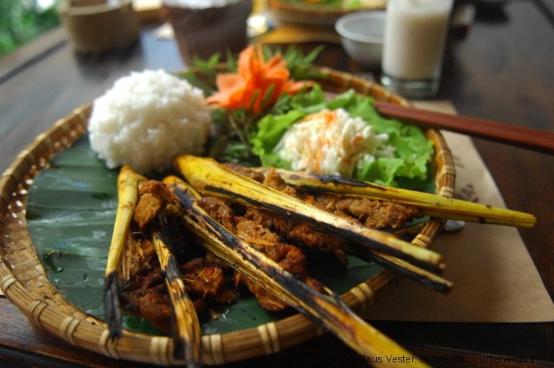 Nach einem köstlichen Mittagessen – in Zitronengras gegrilltes Rindfleisch mit Reis und Salat – im 96 Restaurant unweit unseres Hotels heißt es Abschied nehmen von Hanoi. Nächstes Ziel: Hue in Zentralvietnam. Das Taxi zum Flughafen (ca. 400.000 Dong = 20 US$) spendiert das Reisebüro, bei dem wir die Tour In den Norden gebucht hatten. Zum vereinbarten Zeitpunkt halten 2 Wagen vor dem Hotel, schnell verstaut das Hotelpersonal nach kurzer Diskussion mit dem Fahrer unsere beiden Rucksäcke im vorderen Wagen., um den Verkehr in der engen Gasse nicht unnötig lang zu blockieren. Merkwürdig nur, dass der Fahrer bei der Abfahrt zusätzlich noch etwas für den Sprit haben möchte. Um Missverständnissen vorzubeugen, geben wir im die Handynummer des Reisebüros und bitten den Hotel-Manager um Vermittlung . Ein Anruf und alles scheint okay, das Taxi wirft sich ins Verkehrsgetümmel Richtung Flughafen.