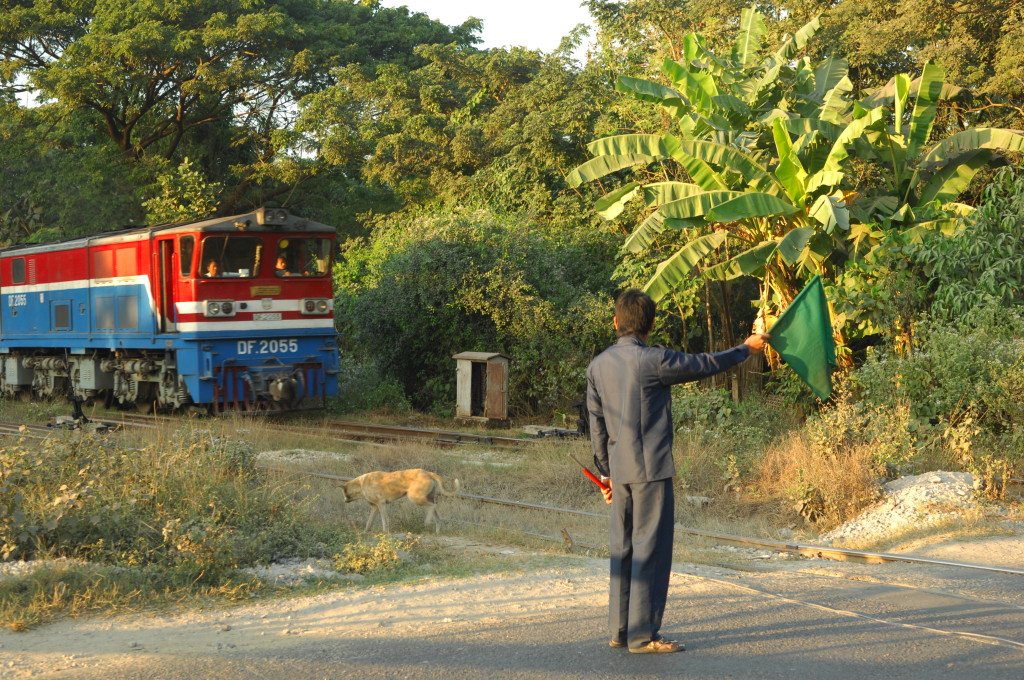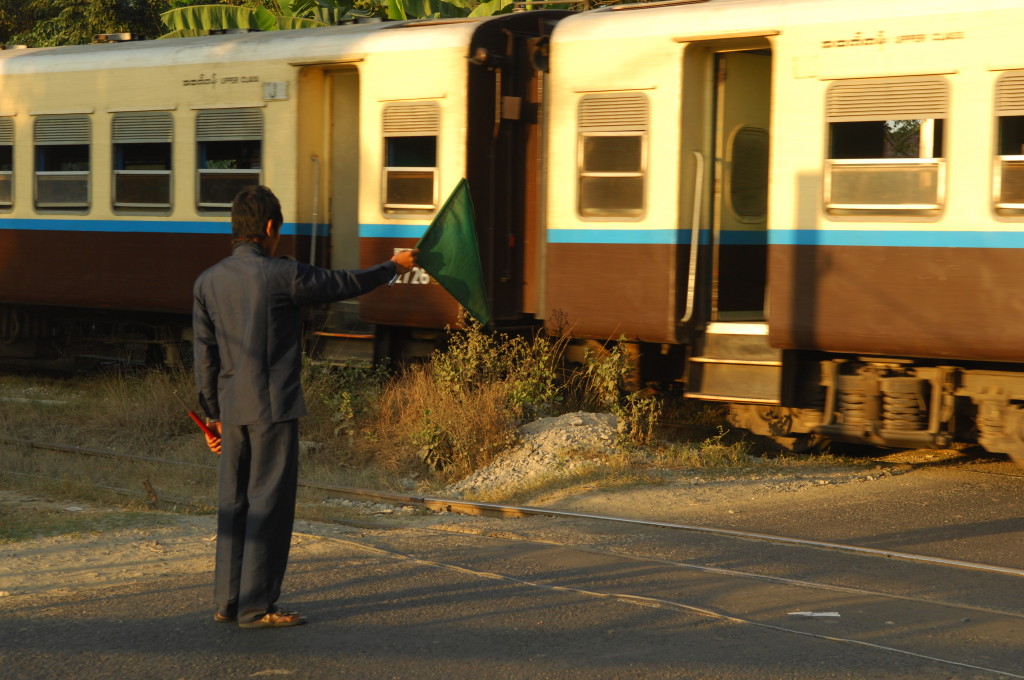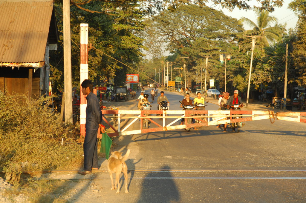 Kurz vor Sonnenuntergang erwartet uns ein seltener Zwischenstopp. Mehrfach zuvor hatten wir die Gleise der Bahnlinie Yangon – Mandalay überquert, die mal einspurig, mal zwei- oder sogar an einigen Stellen vierspurig nach Norden führt. Ein Bahnwärter schwenkt die grüne Fahne und schließt die Schranken. Kurz darauf rattert gemächlich der Personenzug vorbei. Wirklich schnell ist er nicht unterwegs, wie wir kurz darauf feststellen können. Wir überholen ihn auf freier Strecke. Er bleibt schnell hinter uns zurück, auch wenn wir nur mit 60-80 Sachen unterwegs sind.