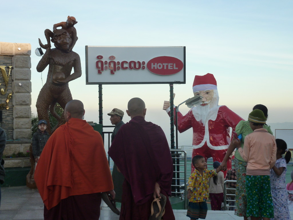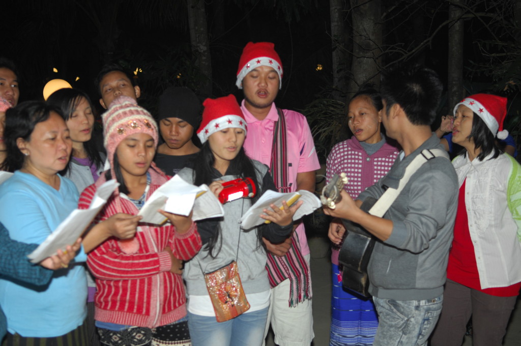 Es ist schon dunkel, als wir das Myanmar Beauty Hotel erreichen, eine idyllische Anlage mittlerweile mehrerer Holzhäuser am Stadtrand von Taungoo mit Blick auf die angrenzenden Reisfelder. Und da sind sie auch schon. Die Weihnachtssänger kommen just um die Ecke, als wir unser Zimmer bezogen haben. Hier ist es zwar nicht winterlich kalt, aber bei den inbrünstig geschmetterten Liedern ist die Stimmung gleich richtig weihnachtlich…