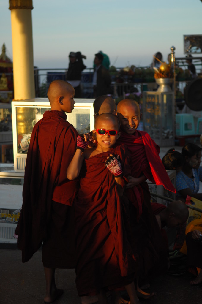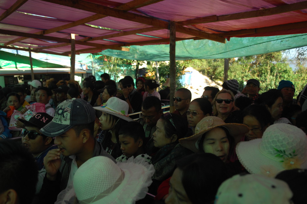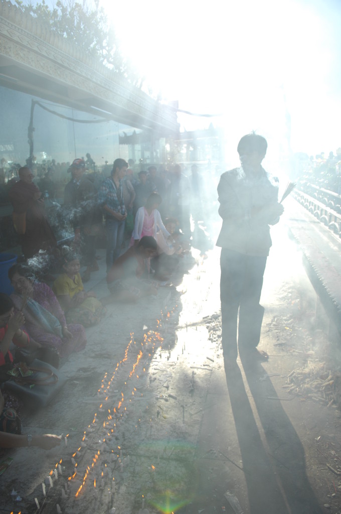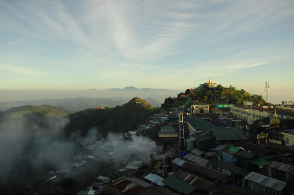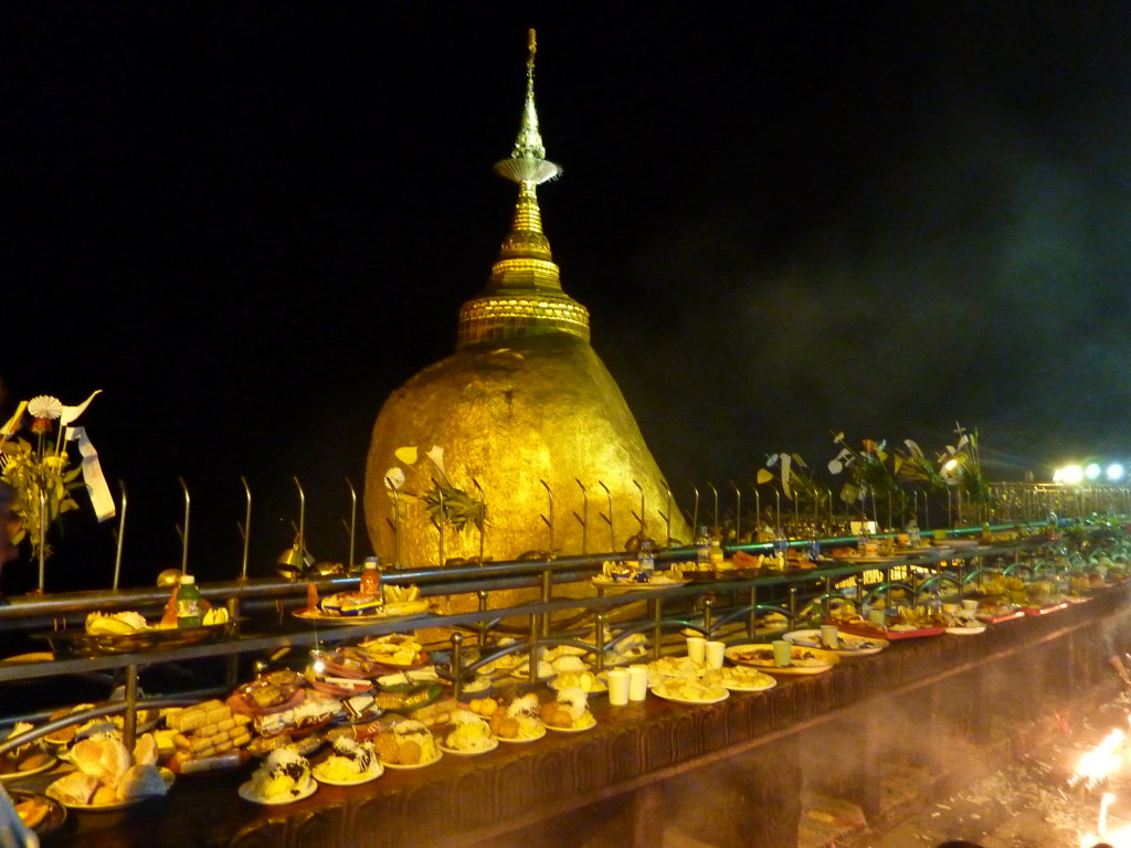 Morgens um Fünf werden die Pilger geweckt. Die allgemeine Aufbruchsstimmung ist nicht zu überhören, wir brauchen keinen Wecker. Als wir die marmorgeflieste Plattform erreichen, ist es noch dunkel. Auch hier sind die Pilger, die die Nacht auf dem Platz verbracht haben, schon auf den Beinen. Jetzt werden Tabletts mit frischen Früchten und Getränken auf die Opfertische vor dem goldenen Felsen gebracht: Frühstück für den Buddha. Die Gaben vom Vortag wurden zuvor in Eimern entsorgt.