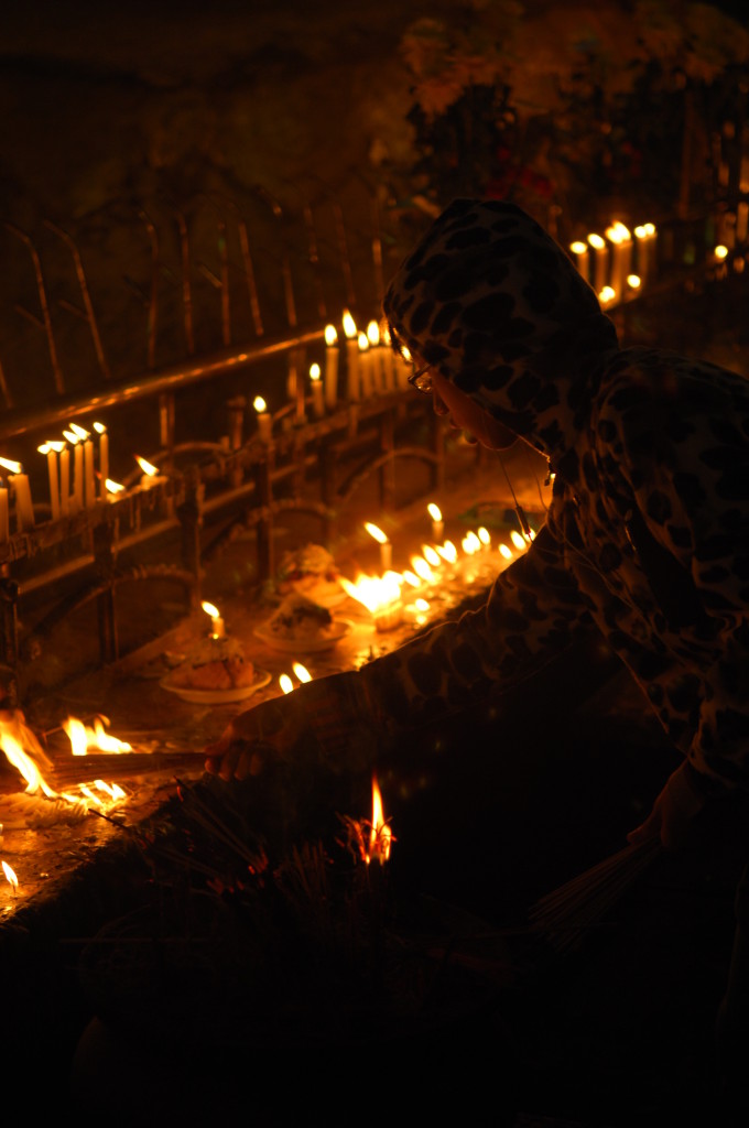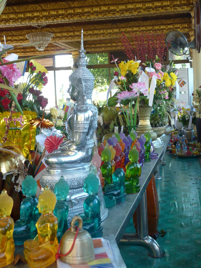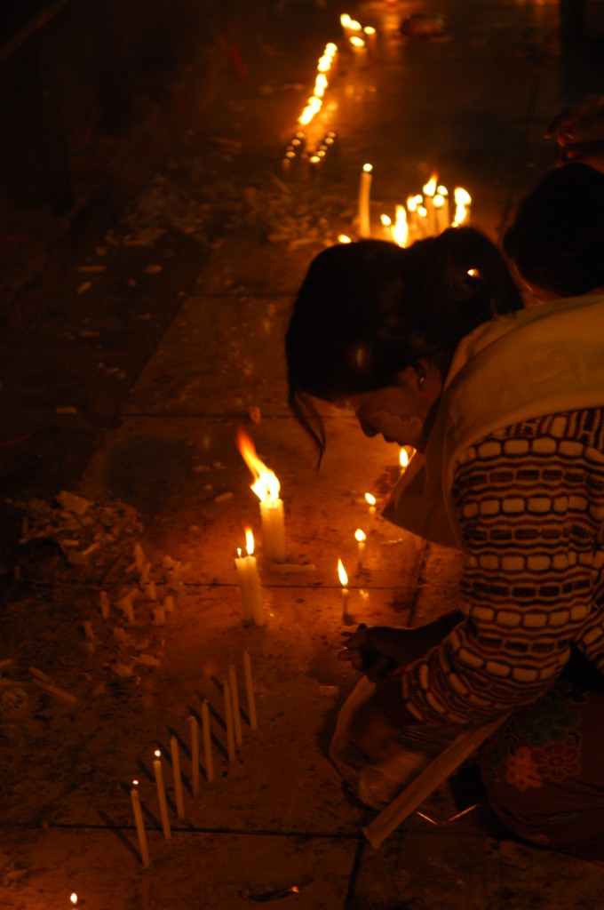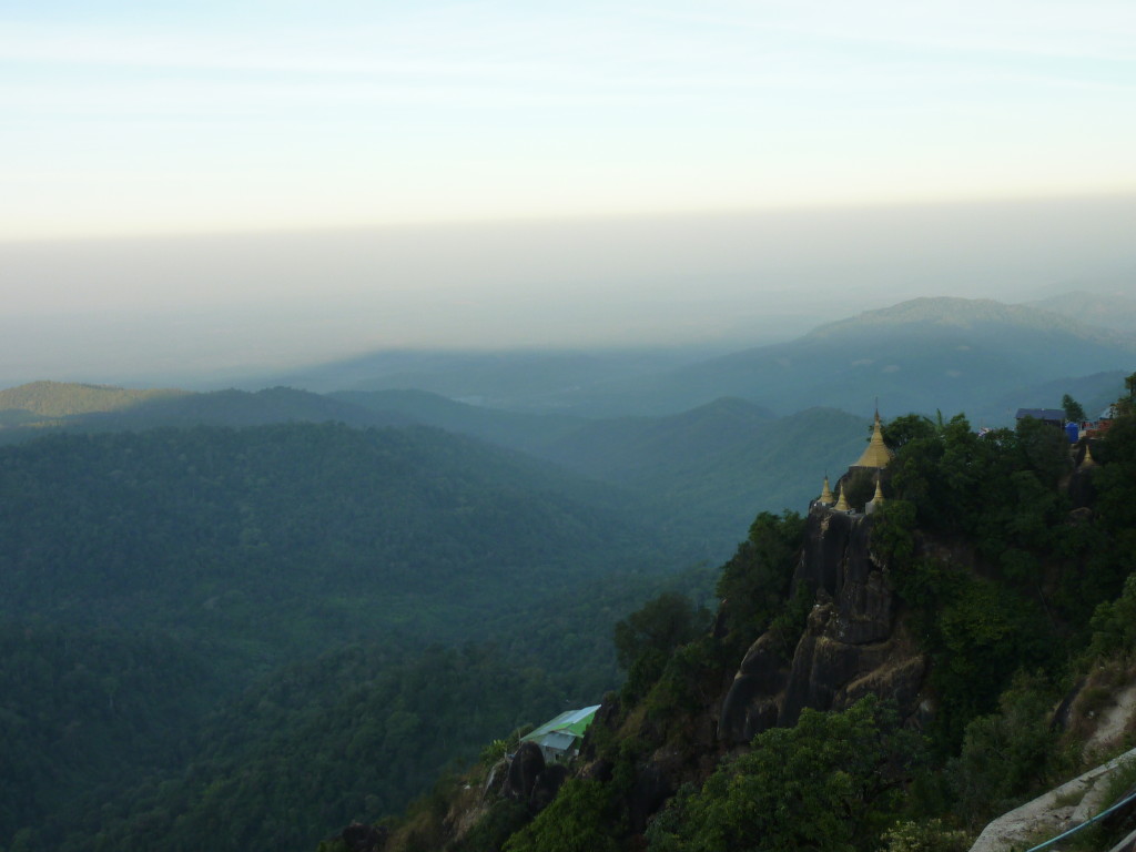 Morgens um Fünf werden die Pilger geweckt. Die allgemeine Aufbruchsstimmung ist nicht zu überhören, wir brauchen keinen Wecker. Als wir die marmorgeflieste Plattform erreichen, ist es noch dunkel. Auch hier sind die Pilger, die die Nacht auf dem Platz verbracht haben, schon auf den Beinen. Jetzt werden Tabletts mit frischen Früchten und Getränken auf die Opfertische vor dem goldenen Felsen gebracht: Frühstück für den Buddha. Die Gaben vom Vortag wurden zuvor in Eimern entsorgt.