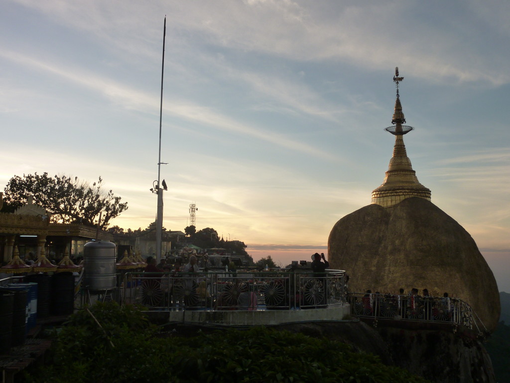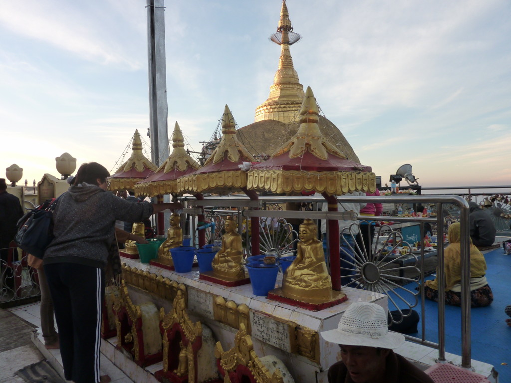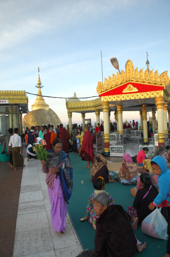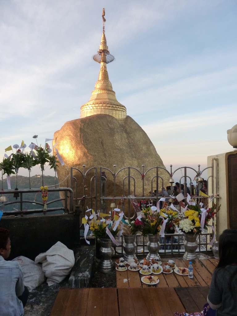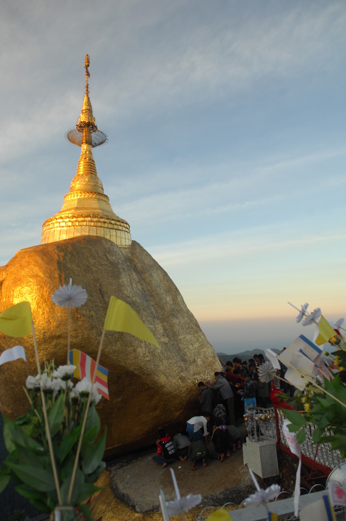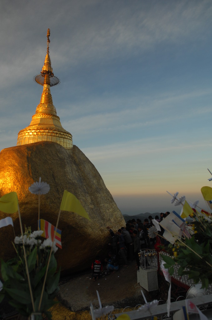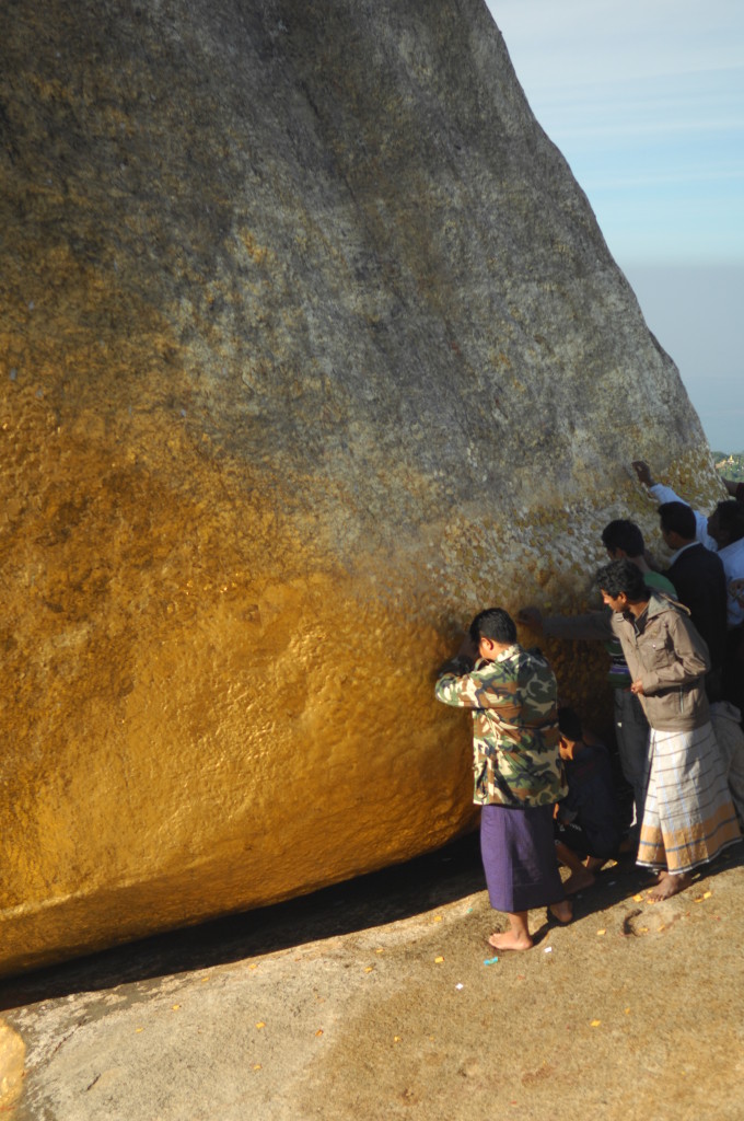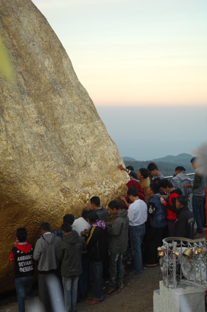Der Platz ist erfüllt vom unablässigen Gemurmel der Gebete und Klingeln der Glöckchen, die als Votivgaben an den Geländern angebracht sind. Die Stimmung kurz vor Sonnenaufgang hat etwas Magisches. Ununterbrochen wird neues Blattgold an den goldenen Felsen geklebt. Auf die Empore am Stein dürfen allerdings nur Männer. Frauen ist es nur erlaubt, Kerzen und Räucherstäbchen an den Opfertischen unterhalb und gegenüber der Rückseite des überhängenden Felsen zu opfern. Wollen sie ebenfalls an der Vergoldung teilhaben, müssen sie einem Mann das Blattgold mitgeben. Die Briefchen mit den quadratischen kleinen Goldfolien kann man praktischerweise an der gegenüberliegenden Seite des Platzes für 1.600 Kyat (ca. 1,15 EUR) kaufen.