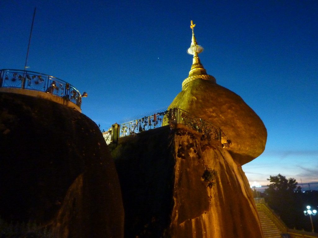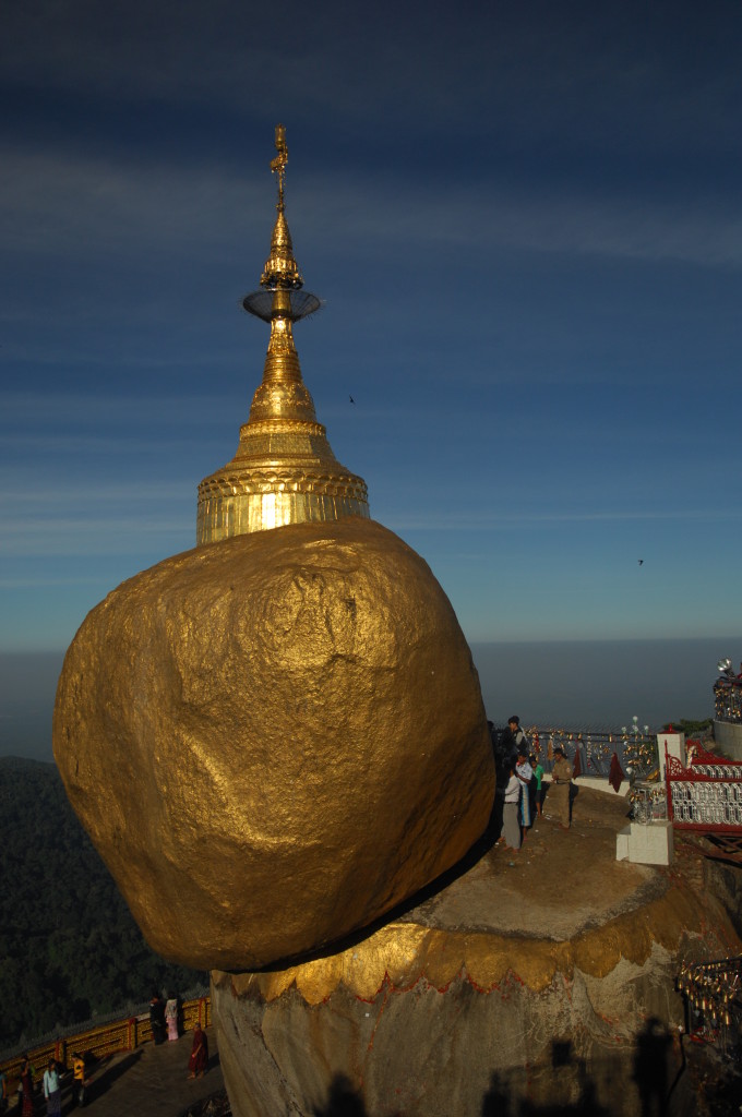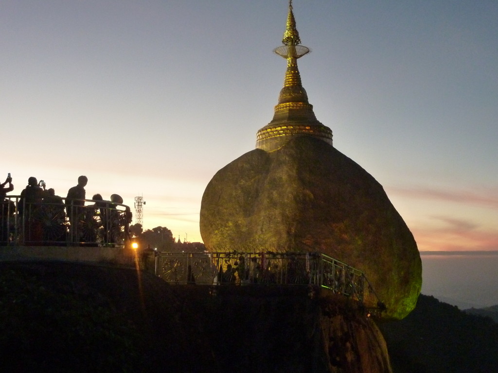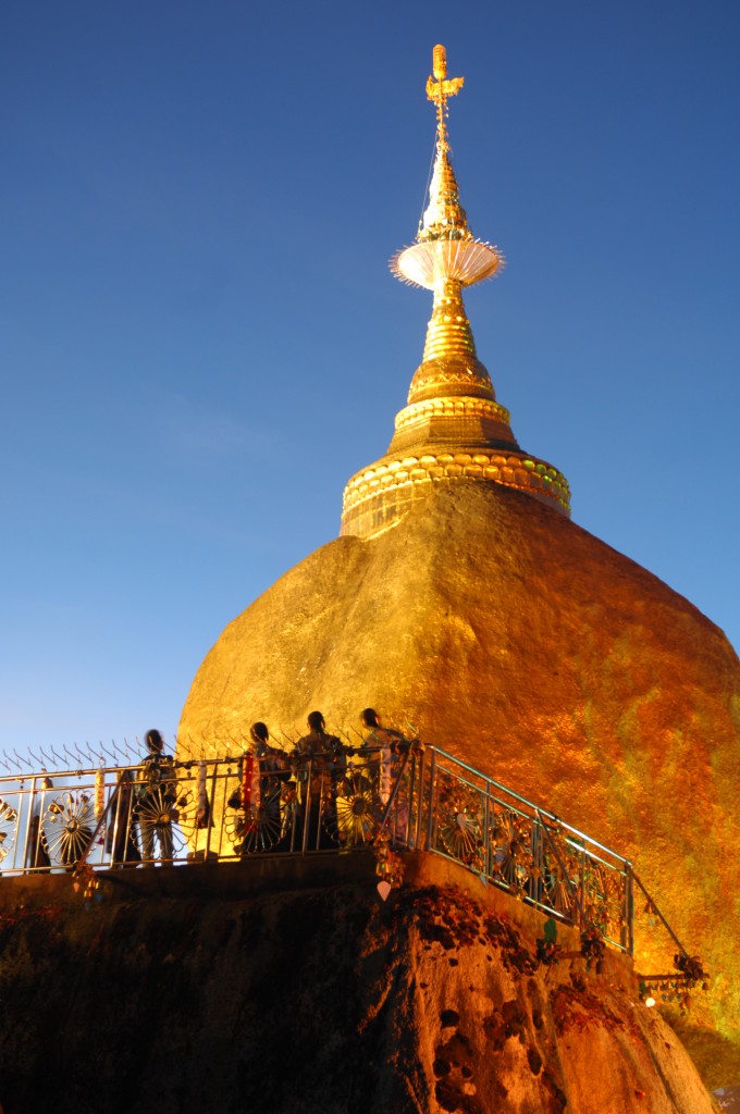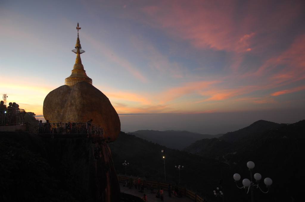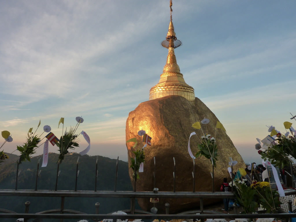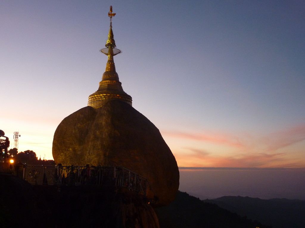 Der Platz ist erfüllt vom unablässigen Gemurmel der Gebete und Klingeln der Glöckchen, die als Votivgaben an den Geländern angebracht sind. Die Stimmung kurz vor Sonnenaufgang hat etwas Magisches. Ununterbrochen wird neues Blattgold an den goldenen Felsen geklebt. Auf die Empore am Stein dürfen allerdings nur Männer. Frauen ist es nur erlaubt, Kerzen und Räucherstäbchen an den Opfertischen unterhalb und gegenüber der Rückseite des überhängenden Felsen zu opfern. Wollen sie ebenfalls an der Vergoldung teilhaben, müssen sie einem Mann das Blattgold mitgeben. Die Briefchen mit den quadratischen kleinen Goldfolien kann man praktischerweise an der gegenüberliegenden Seite des Platzes für 1.600 Kyat (ca. 1,15 EUR) kaufen.