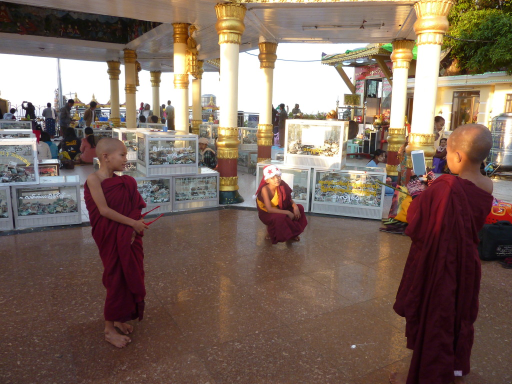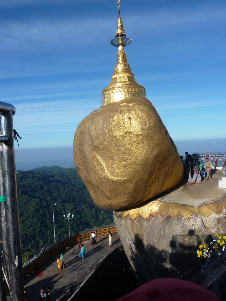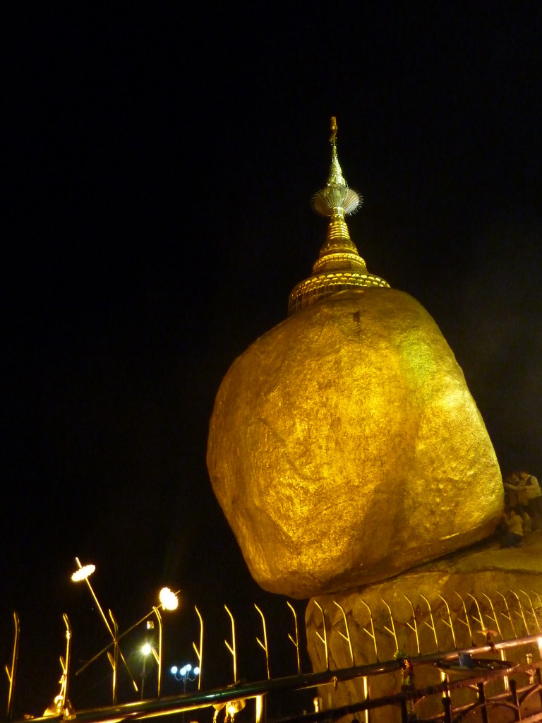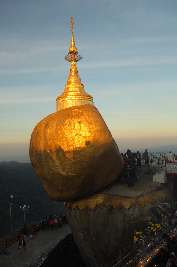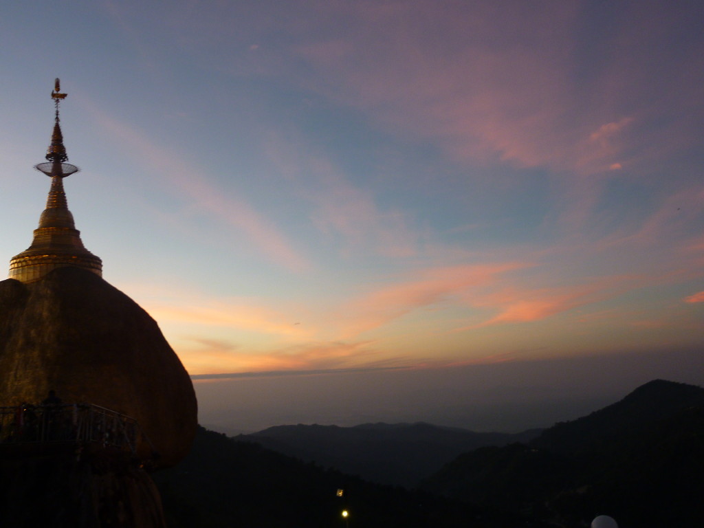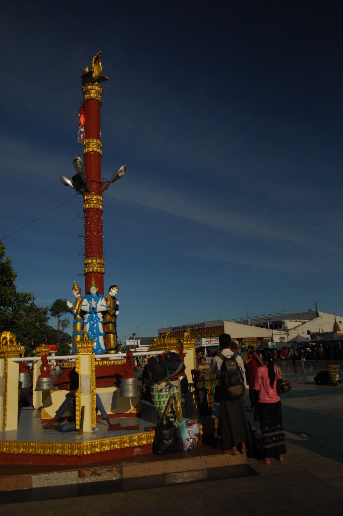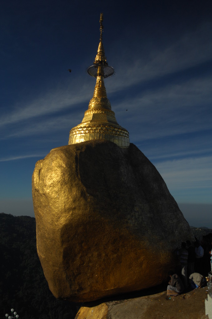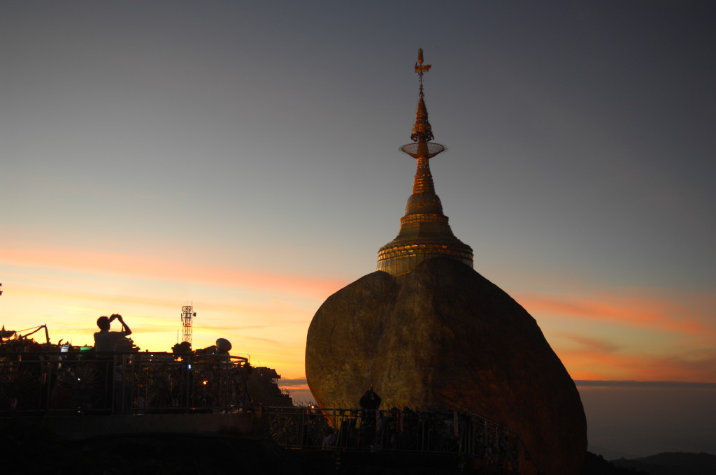 Der Platz ist erfüllt vom unablässigen Gemurmel der Gebete und Klingeln der Glöckchen, die als Votivgaben an den Geländern angebracht sind. Die Stimmung kurz vor Sonnenaufgang hat etwas Magisches. Ununterbrochen wird neues Blattgold an den goldenen Felsen geklebt. Auf die Empore am Stein dürfen allerdings nur Männer. Frauen ist es nur erlaubt, Kerzen und Räucherstäbchen an den Opfertischen unterhalb und gegenüber der Rückseite des überhängenden Felsen zu opfern. Wollen sie ebenfalls an der Vergoldung teilhaben, müssen sie einem Mann das Blattgold mitgeben. Die Briefchen mit den quadratischen kleinen Goldfolien kann man praktischerweise an der gegenüberliegenden Seite des Platzes für 1.600 Kyat (ca. 1,15 EUR) kaufen.