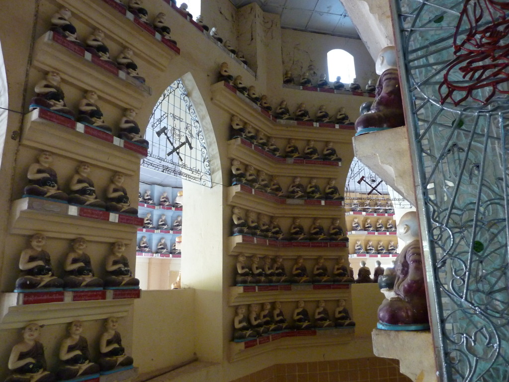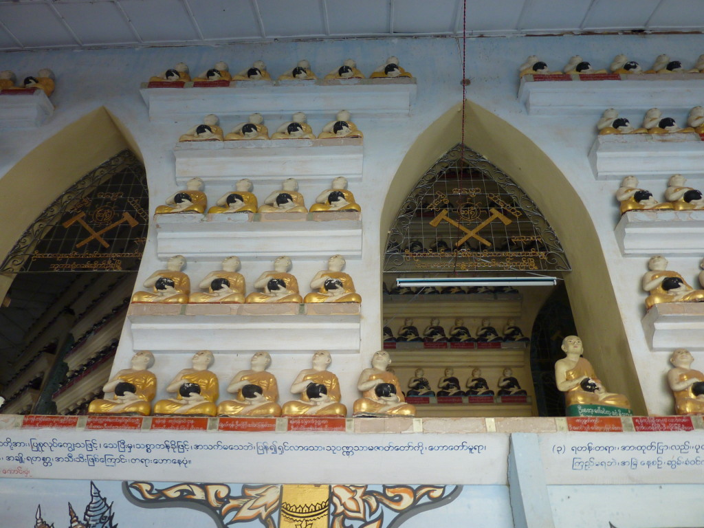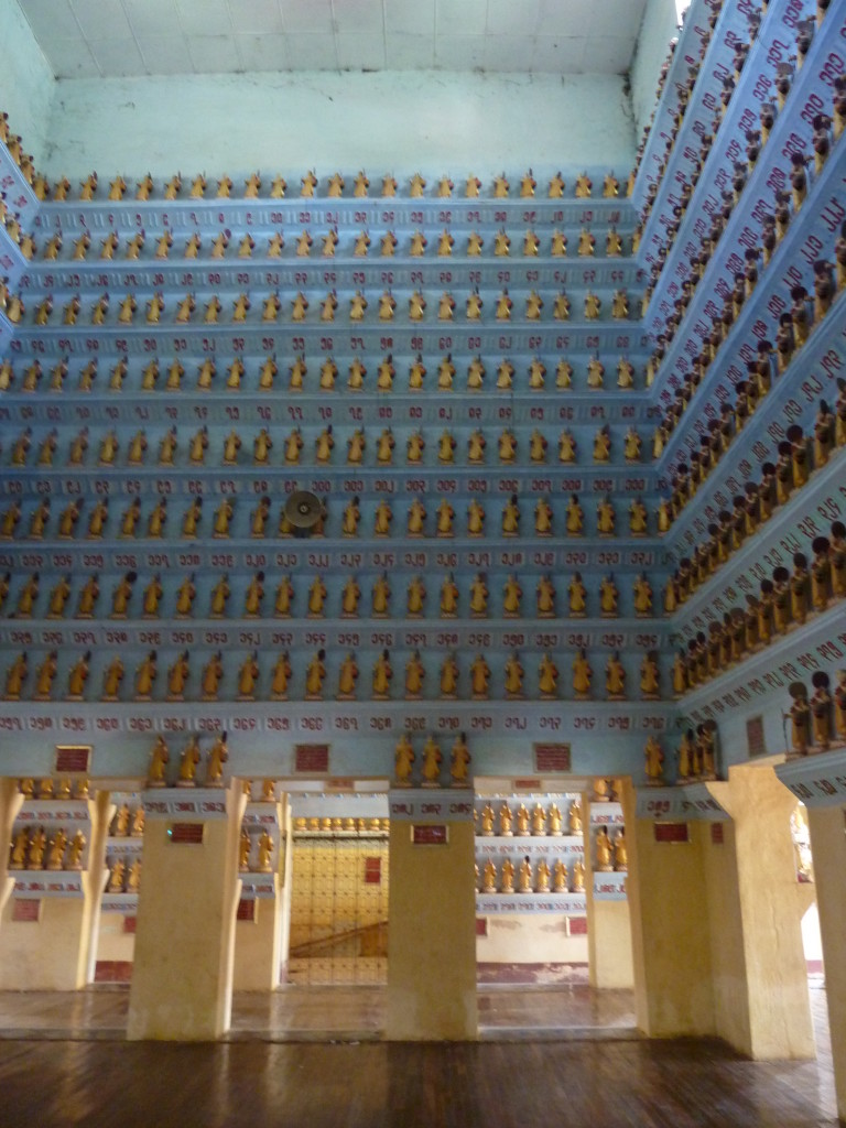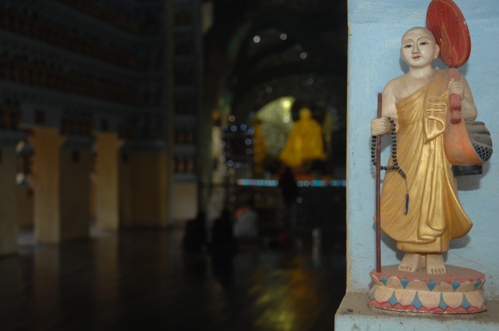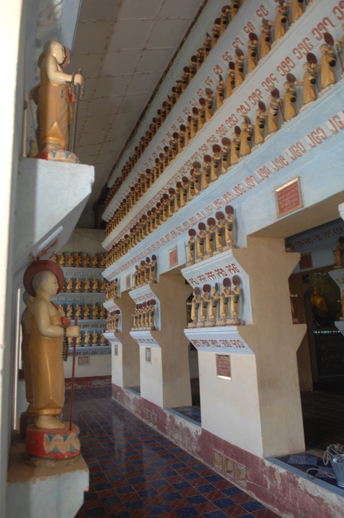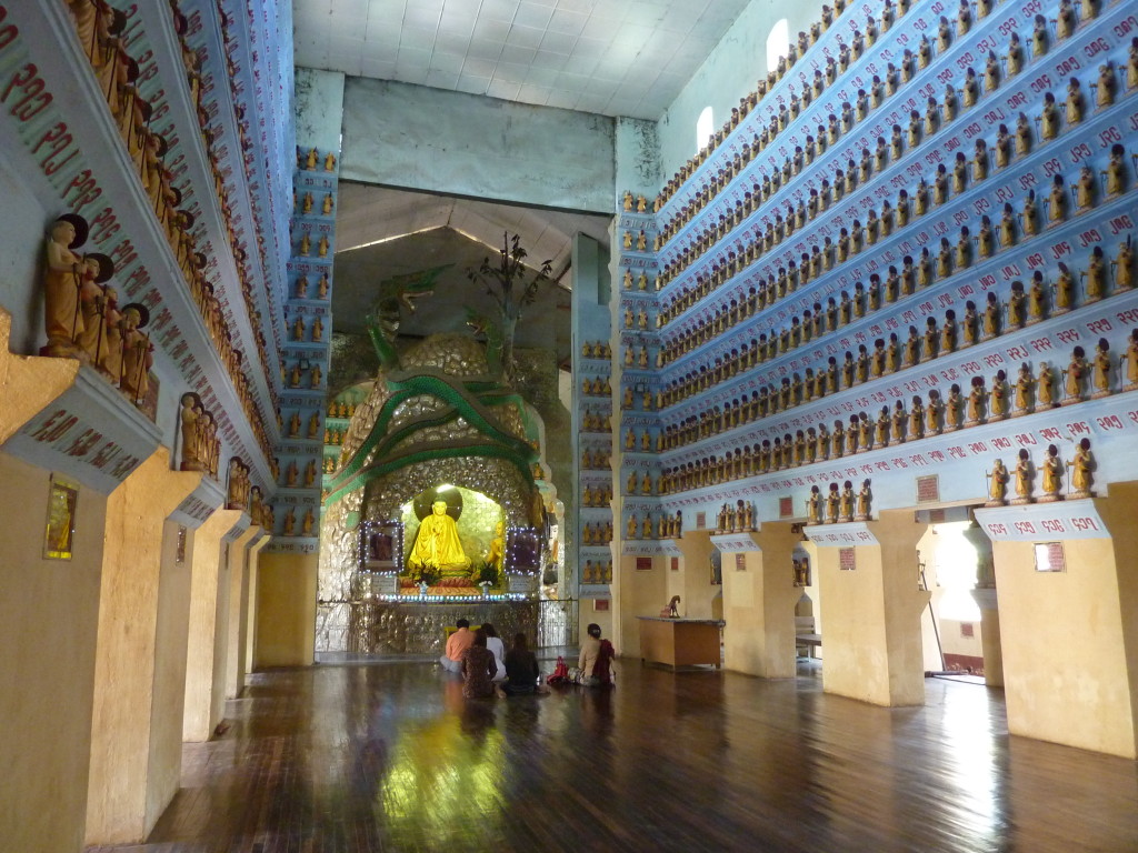 In einem Teich befinden sich zwei außergewöhnliche Tempel. Der eine in Form eines goldenen Schiffes erinnert an die Prozessionsboote, die anlässlich der Tempelfeste auf dem Inle-See zum Einsatz kommen. Die eigentliche Überraschung wartet im Inneren der beiden Tempel. In jedem bedecken 5.000 Mönchsfiguren die Wände vom Boden bis unter die Decke. Das weckt Erinnerungen an die Thanboddhay Pagode in Monywa. Dort waren es allerdings 582.357 kleine Buddha-Statuen und -Bildnisse, die innen und teils auch außen die Wände zierten.