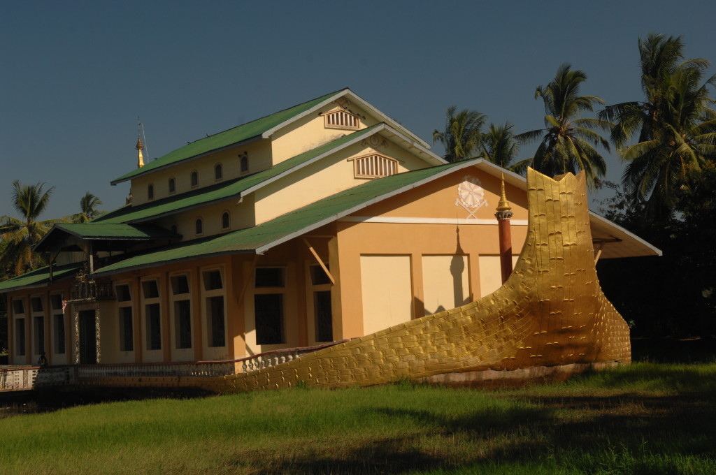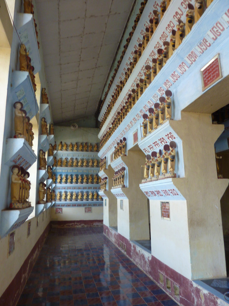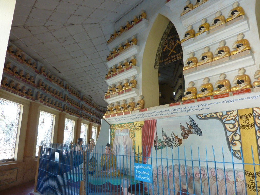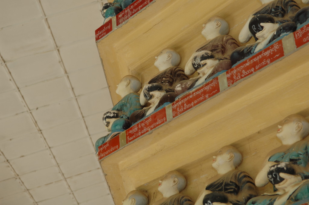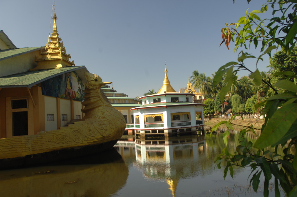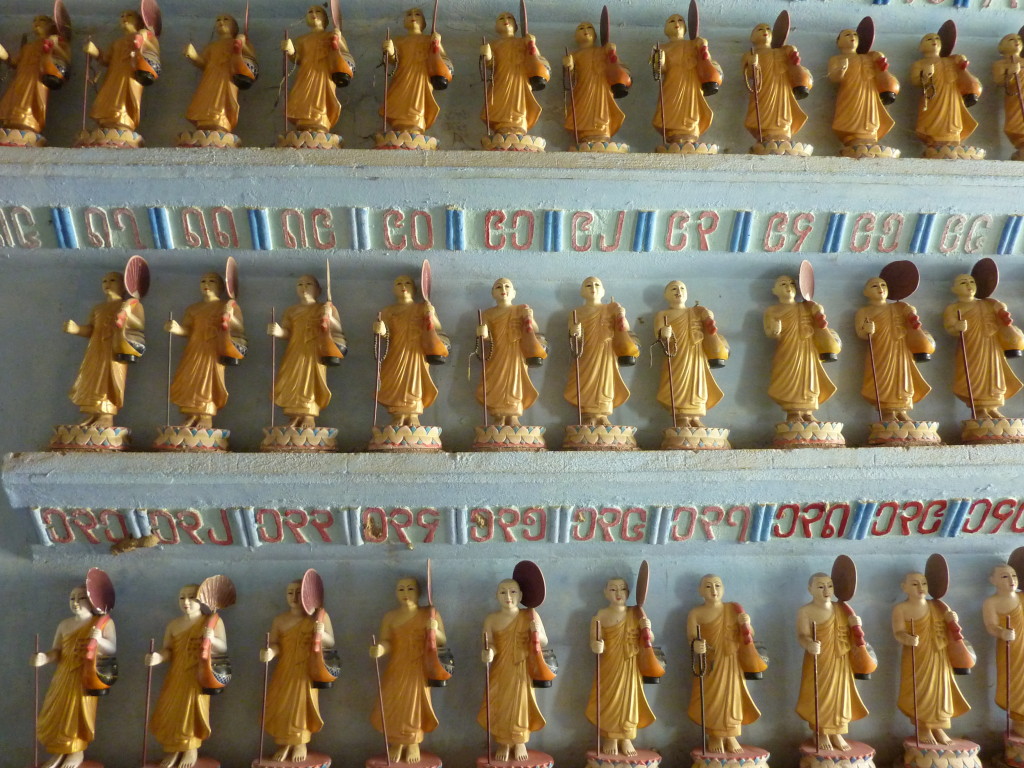 In einem Teich befinden sich zwei außergewöhnliche Tempel. Der eine in Form eines goldenen Schiffes erinnert an die Prozessionsboote, die anlässlich der Tempelfeste auf dem Inle-See zum Einsatz kommen. Die eigentliche Überraschung wartet im Inneren der beiden Tempel. In jedem bedecken 5.000 Mönchsfiguren die Wände vom Boden bis unter die Decke. Das weckt Erinnerungen an die Thanboddhay Pagode in Monywa. Dort waren es allerdings 582.357 kleine Buddha-Statuen und -Bildnisse, die innen und teils auch außen die Wände zierten.