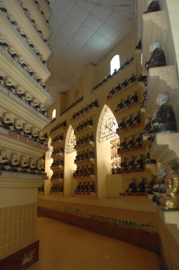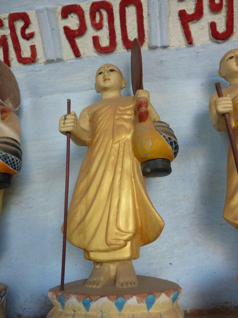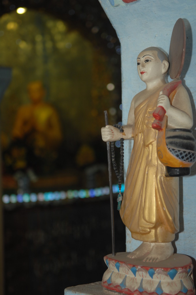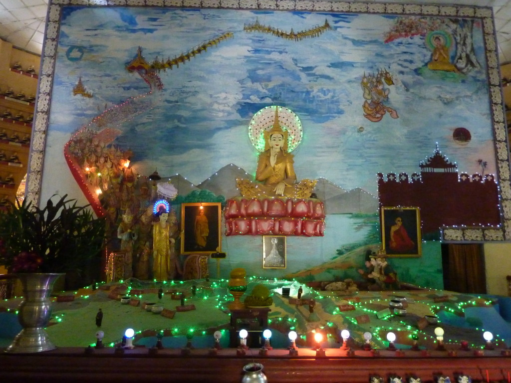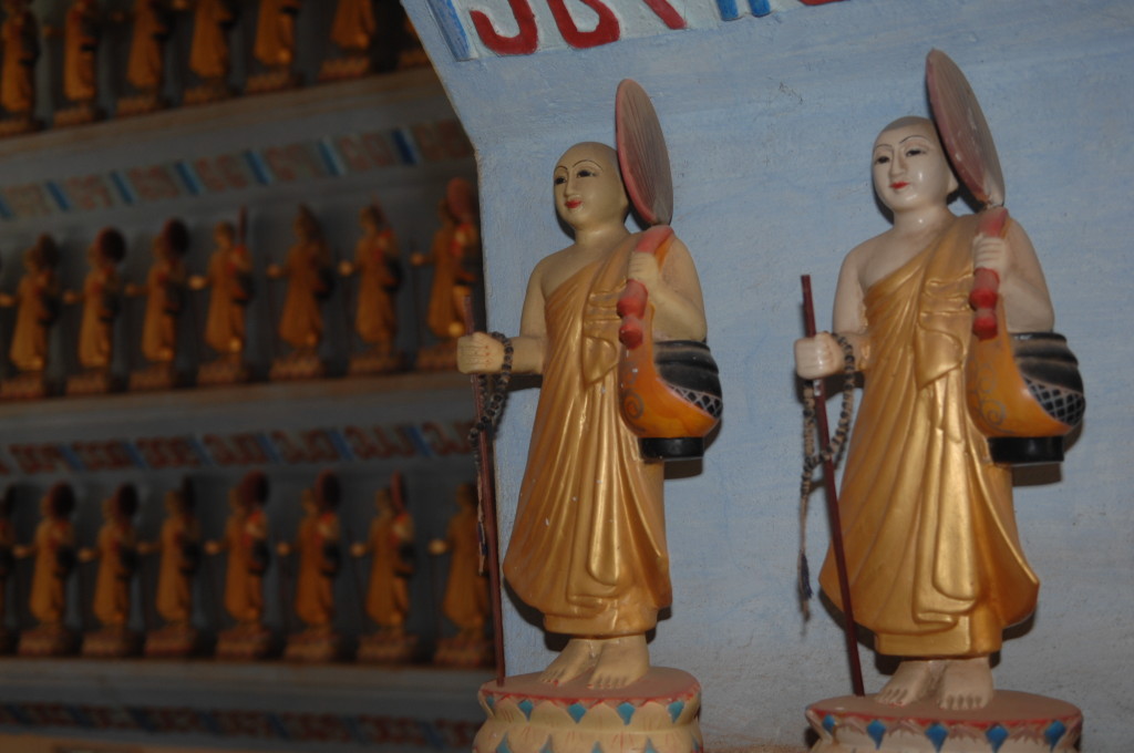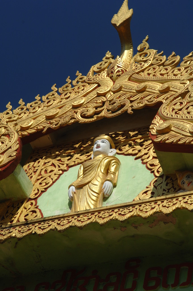 In einem Teich befinden sich zwei außergewöhnliche Tempel. Der eine in Form eines goldenen Schiffes erinnert an die Prozessionsboote, die anlässlich der Tempelfeste auf dem Inle-See zum Einsatz kommen. Die eigentliche Überraschung wartet im Inneren der beiden Tempel. In jedem bedecken 5.000 Mönchsfiguren die Wände vom Boden bis unter die Decke. Das weckt Erinnerungen an die Thanboddhay Pagode in Monywa. Dort waren es allerdings 582.357 kleine Buddha-Statuen und -Bildnisse, die innen und teils auch außen die Wände zierten.