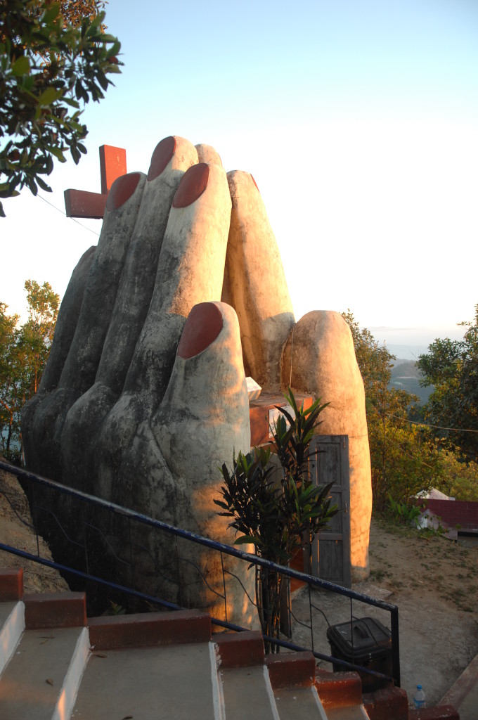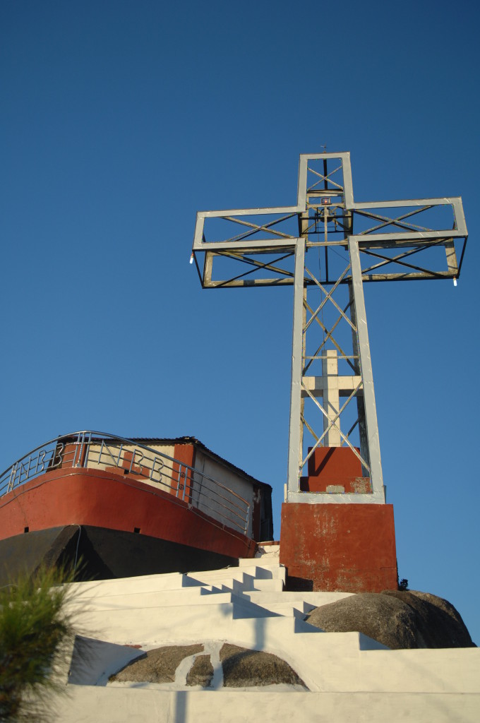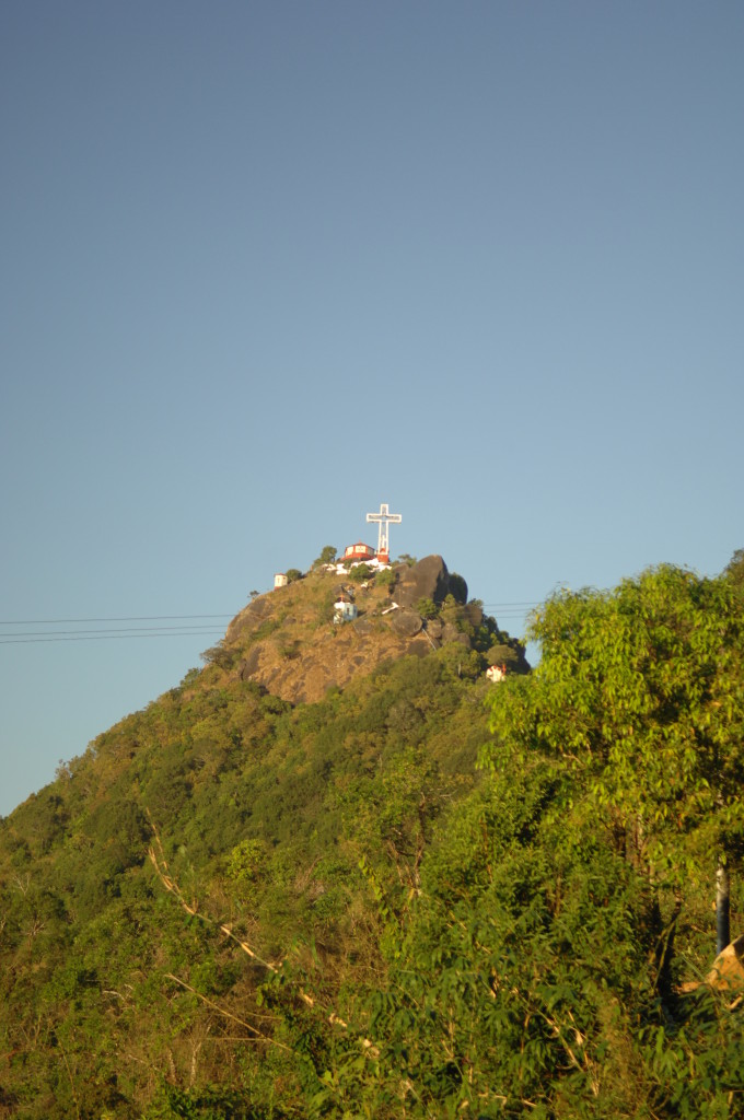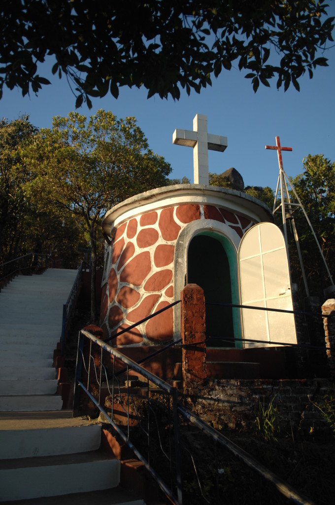Entlang der Treppe befinden sich noch weitere kleine Kapellen, die von einheimischen Familien gestiftet wurden. Das Gipfelkreuz ist gleichzeitig der Glockenturm einer Kapelle, die auf der bootsförmig zubetonierten Bergspitze errichtet wurde. Nachts ist es beleuchtet und strahlt weiß vom Berg.