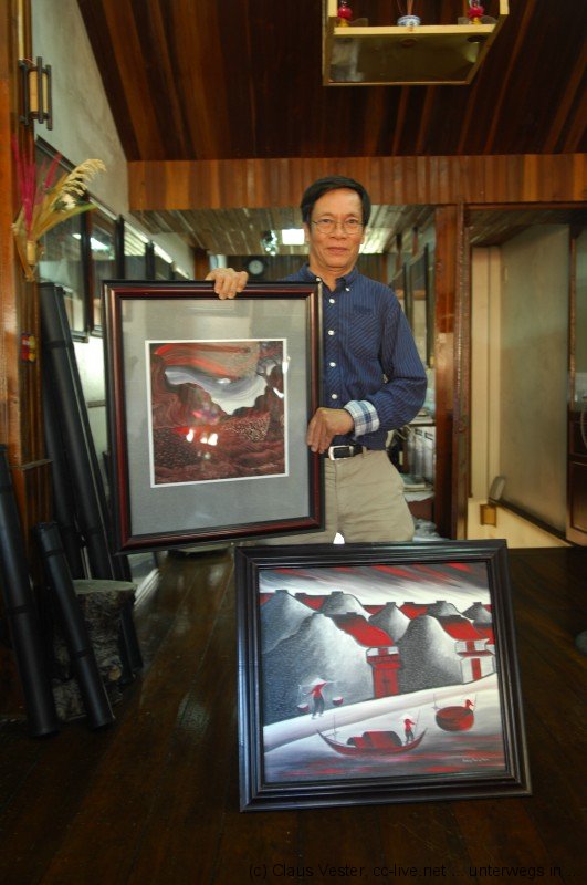 Weiter ging es zur Anprobe bei Madame B‘Lan. Auch hier gab es einen kleinen Nachschlag in Form einer passgenauen Fischerhose für mich. Und nicht weit entfernt stellte sich dann noch ein Künstler mit außergewöhnlichen Maltechniken in seiner Galerie in den Weg. Für die nächsten Tage haben wir uns vorgenommen, ohne Kreditkarten und monetärer Minimalausstattung und/oder Scheuklappen durch die Stadt zu gehen. Klugerweise haben wir die beiden für die nächsten 2 Tage geplanten Exkursionen im Voraus bezahlt 🙂
