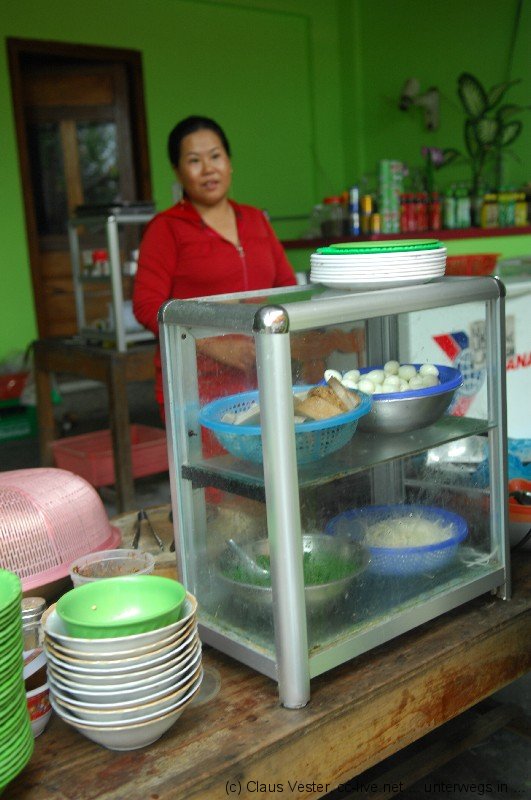 An der Rezeption kein Fahrer in Sicht. Auf Nachfrage, was der überhastete Aufbruch denn solle, gebetsmühlenhafte Wiederholung, er komme gleich und hätte gerade angerufen. Schließlich müsse er ja noch andere Hotels abfahren und Gäste einsammeln. Warum wir die ersten sind? Keine Antwort. Frühstück? Die im Vokabular recht beschränkte junge Dame weist zum Restaurant. Dort erhalten wir zwei Styroschachteln, die wir selber vom Büffet befüllen dürfen. Das ist schnell gemacht.