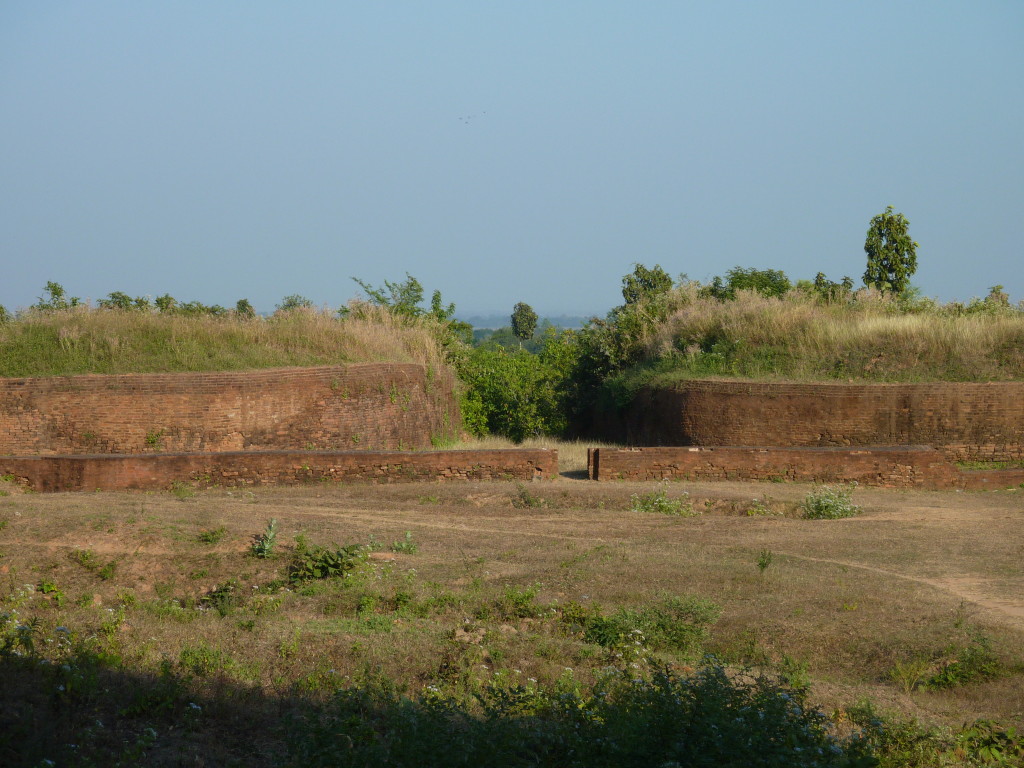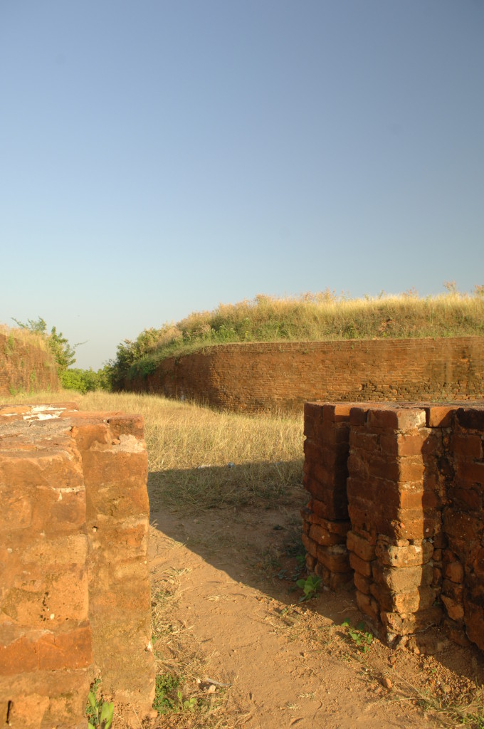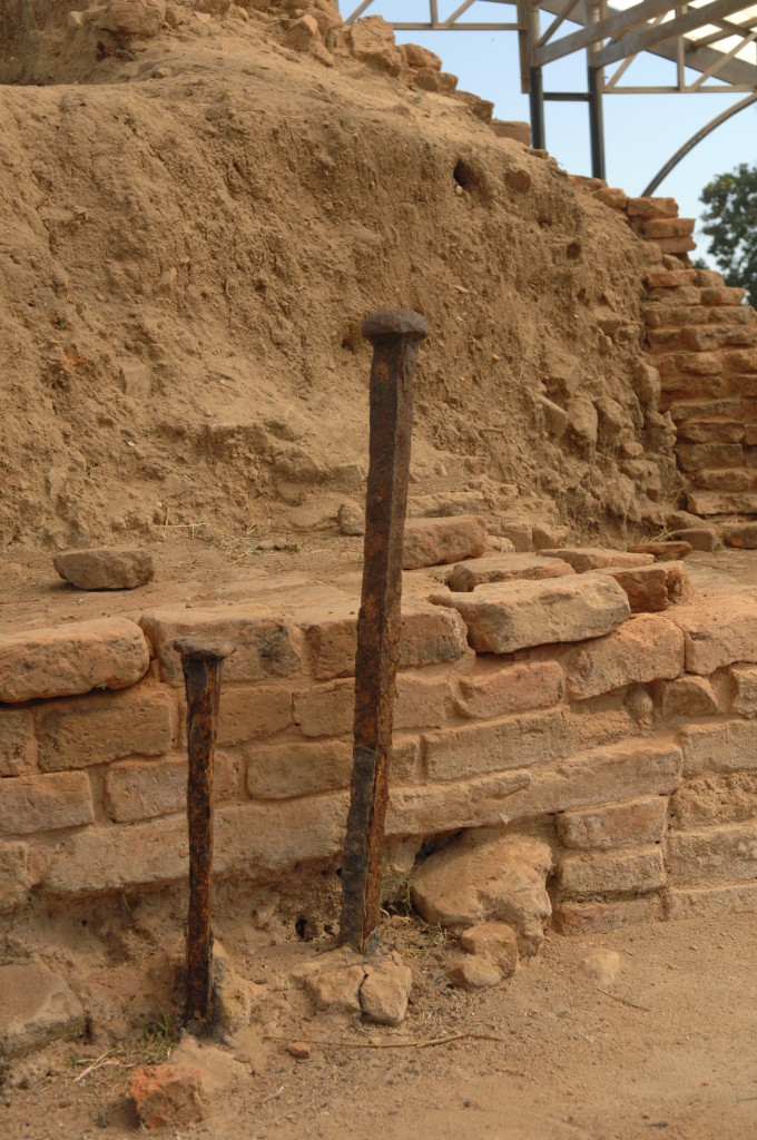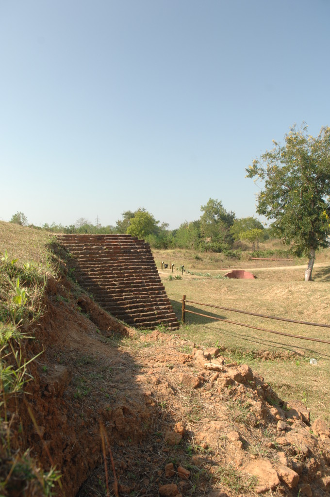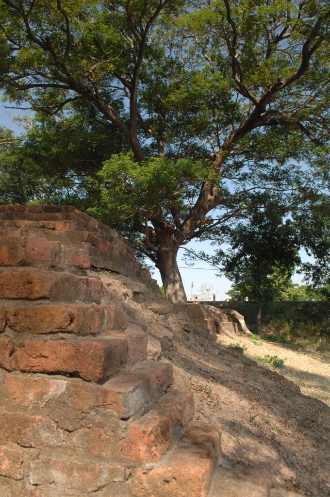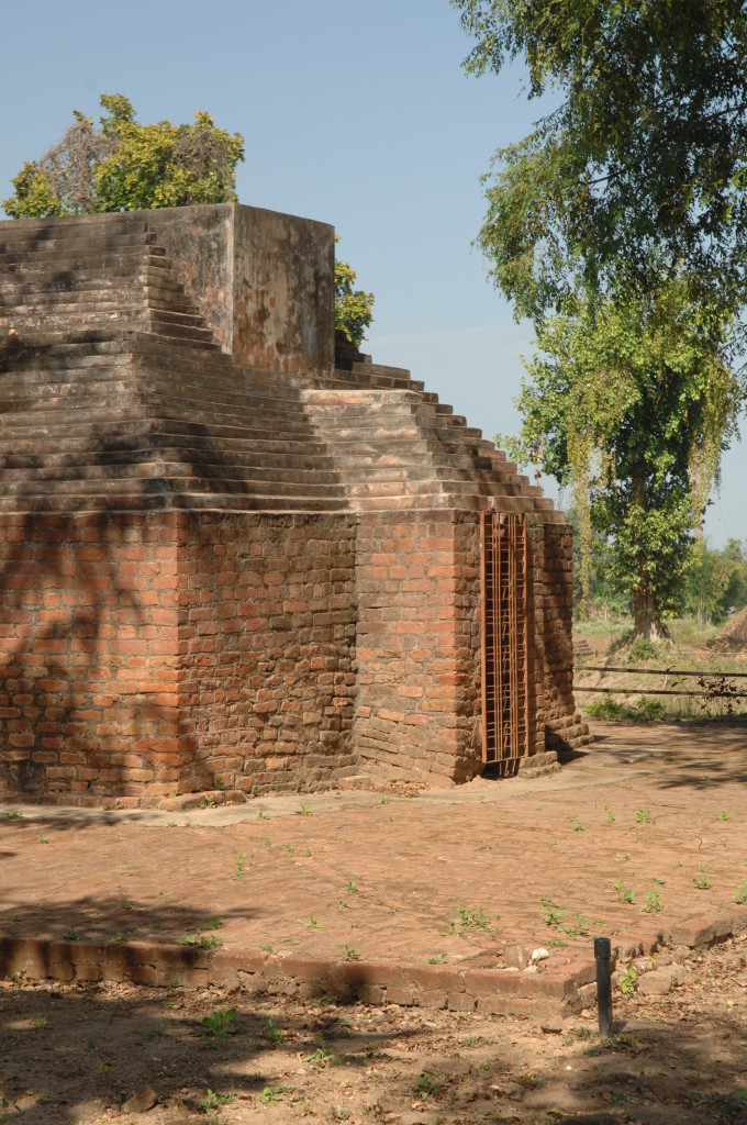 Von der Mathigya-Stupa ist nur das Fundament und die unteren Terrassen geblieben. Interessant daran: die Ziegel sind mal senkrecht, auf der nächsten Ebene dann wieder waagrecht verbaut worden. Derzeit finden hier weitere Ausgrabungen zur Freilegung tieferer Ebenen des Fundaments statt.
