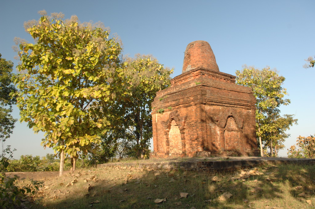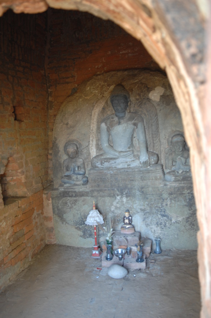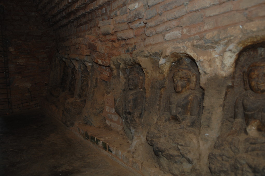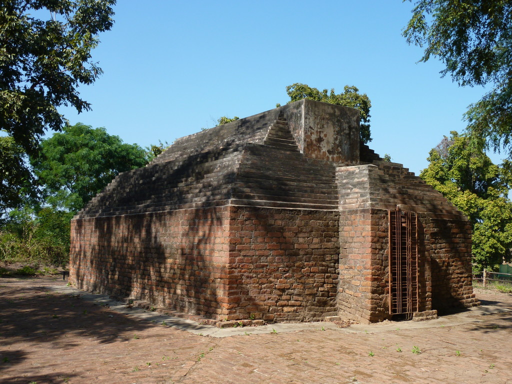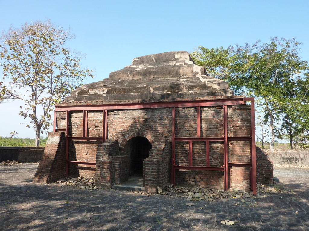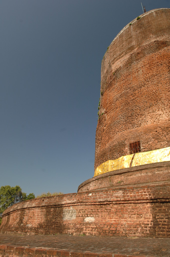 Von der Mathigya-Stupa ist nur das Fundament und die unteren Terrassen geblieben. Interessant daran: die Ziegel sind mal senkrecht, auf der nächsten Ebene dann wieder waagrecht verbaut worden. Derzeit finden hier weitere Ausgrabungen zur Freilegung tieferer Ebenen des Fundaments statt.