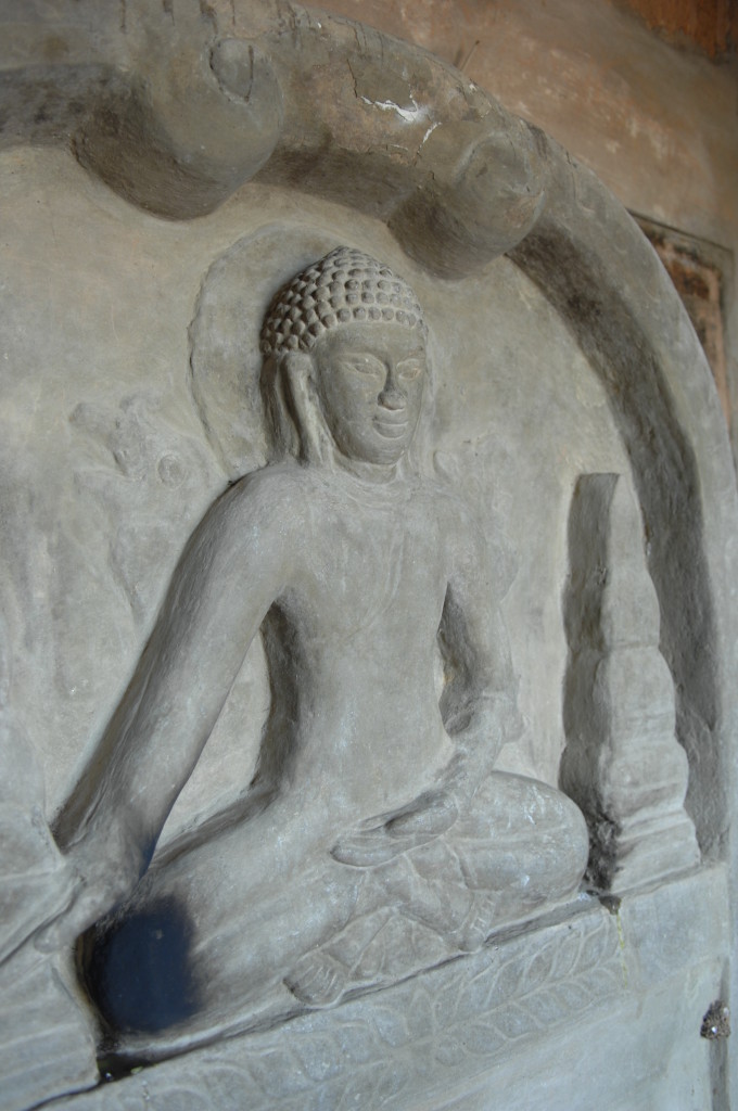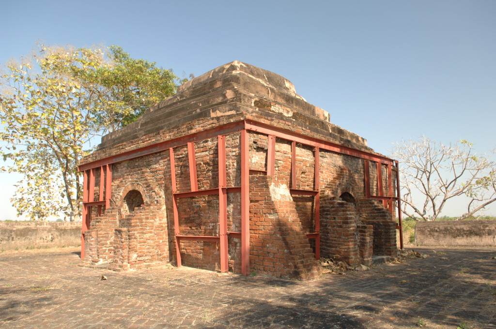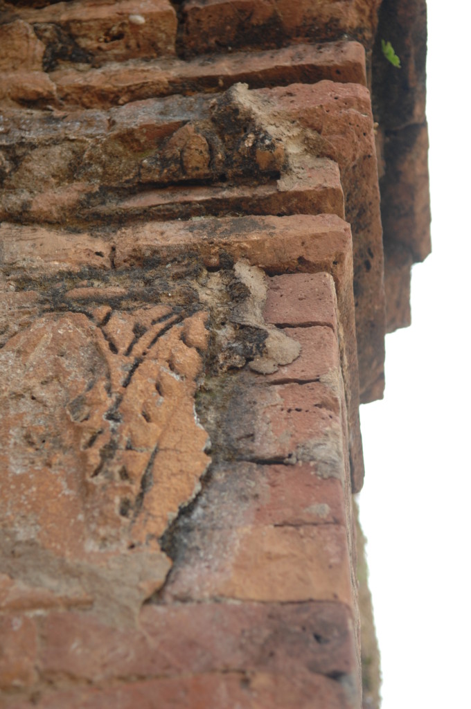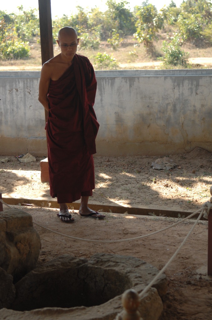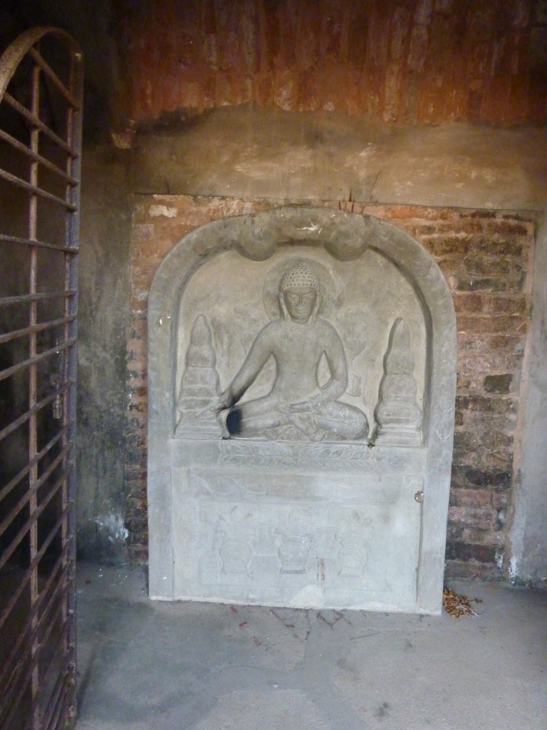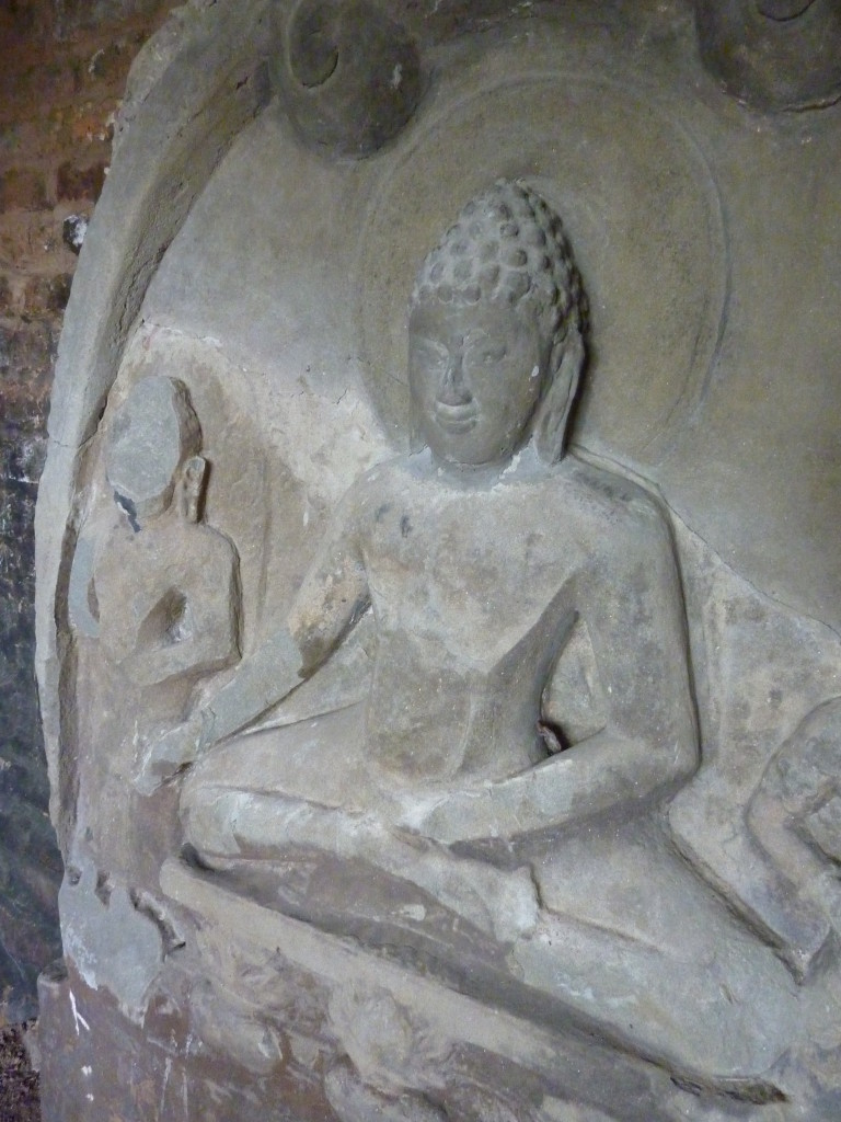 Von der Mathigya-Stupa ist nur das Fundament und die unteren Terrassen geblieben. Interessant daran: die Ziegel sind mal senkrecht, auf der nächsten Ebene dann wieder waagrecht verbaut worden. Derzeit finden hier weitere Ausgrabungen zur Freilegung tieferer Ebenen des Fundaments statt.