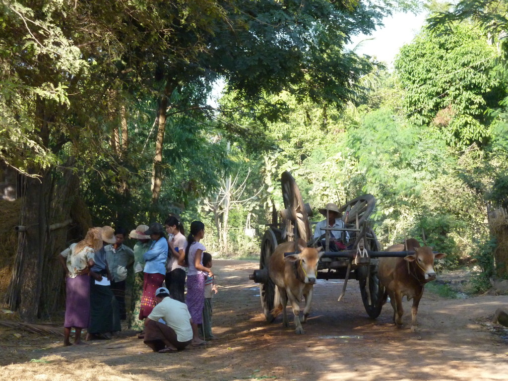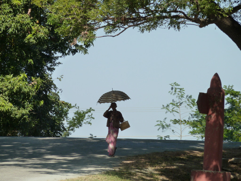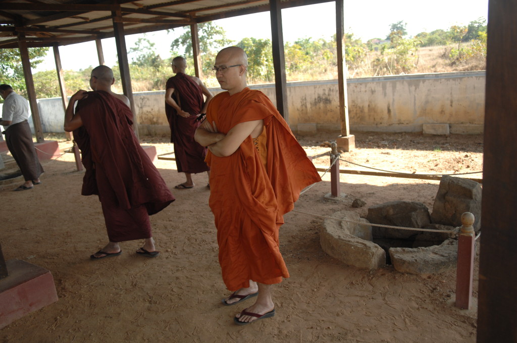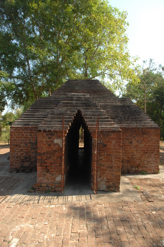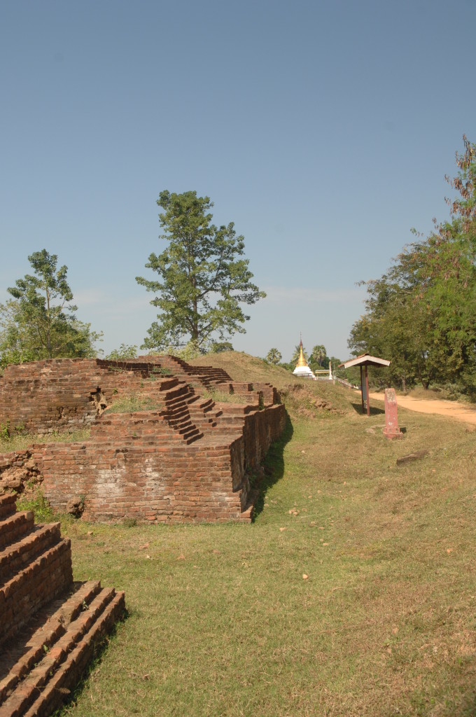 Wir folgen dem sandigen Feldweg zum Nat Pauk (Geister-Tor) im Norden von Sri Ksetra, das ebenfalls auf das 4. – 7. Jhdt. datiert wird. Von den Außenmauern des Durchgangs wurde nur die östliche freigelegt. Die 2009 – 2010 ausgegrabene Ziegelkonstruktion erstreckt sich über eine Länge von 30,6 m bei einer Breite von 11,3 m und einer Höhe von 4 m. Von der gegenüberliegenden Mauer ist nichts zu sehen. Sie dient noch immer als Fundament der Straße zum Dorf Hmawza.