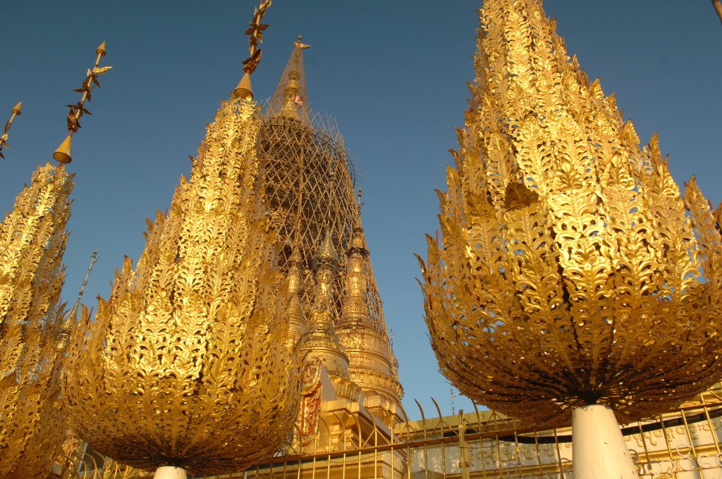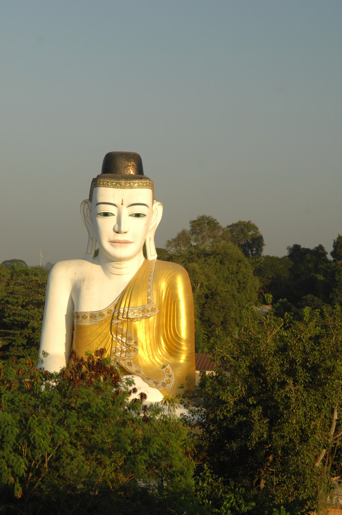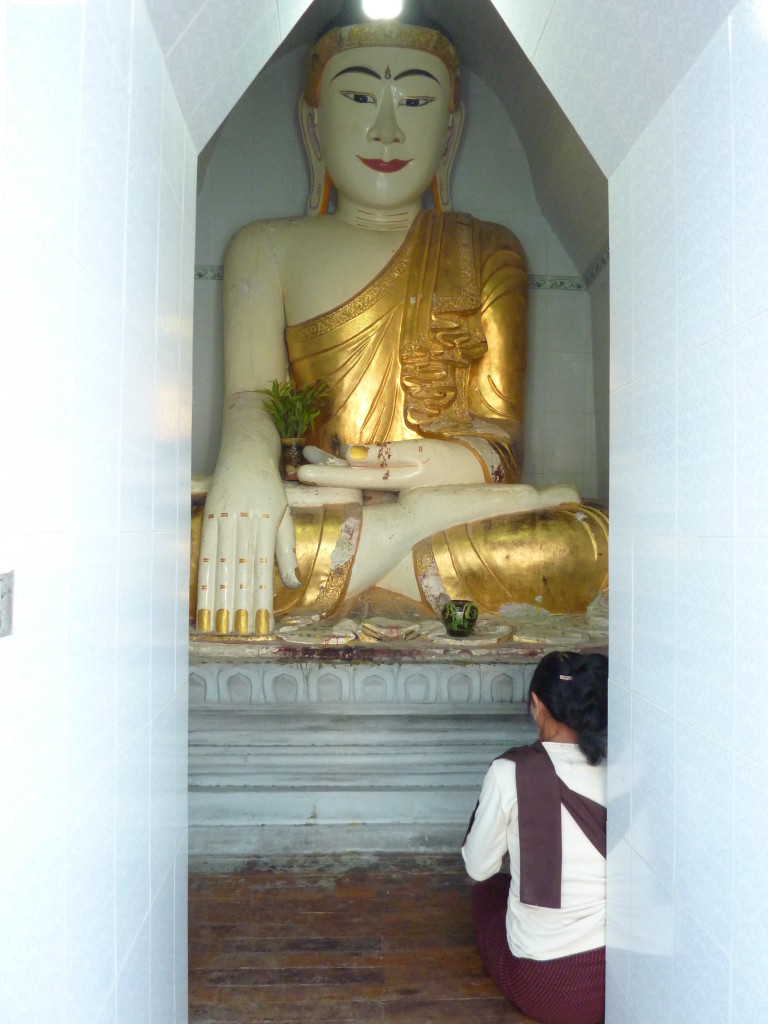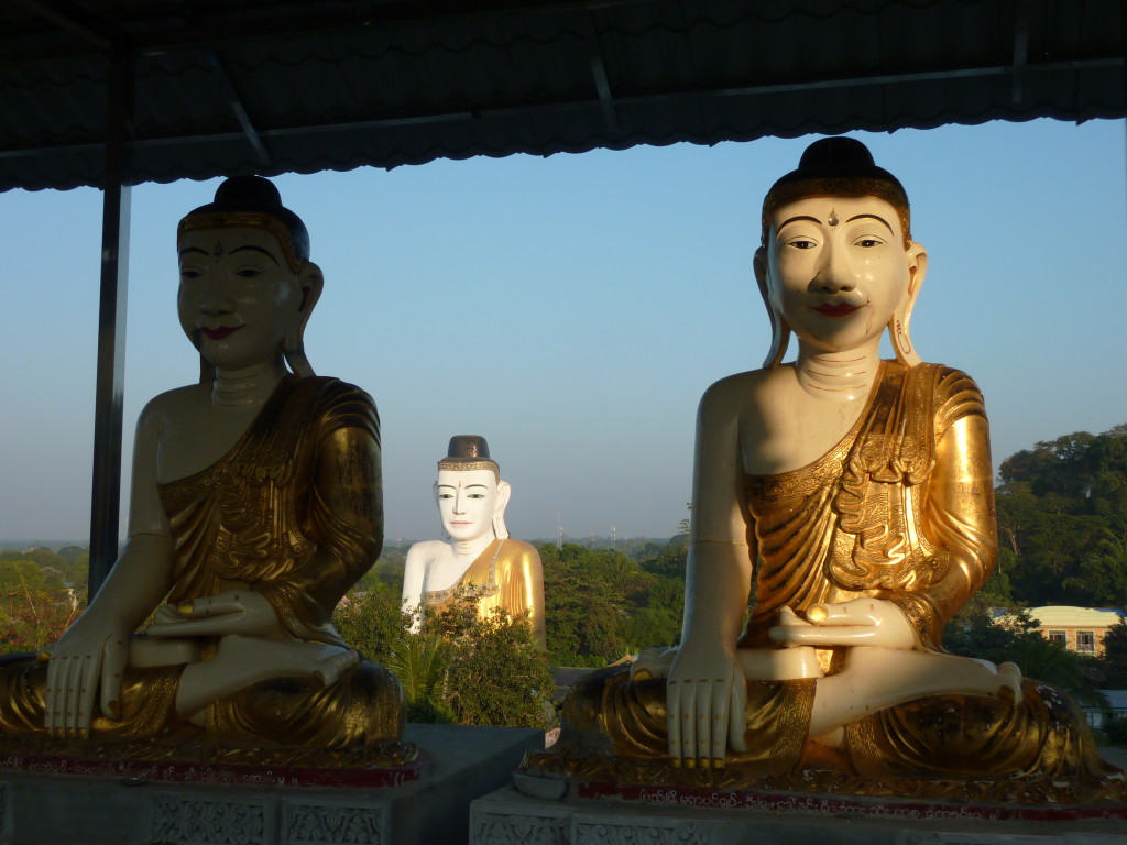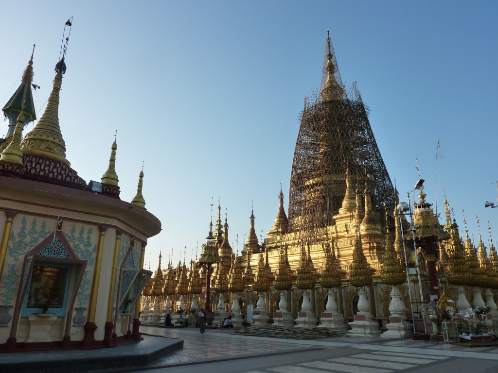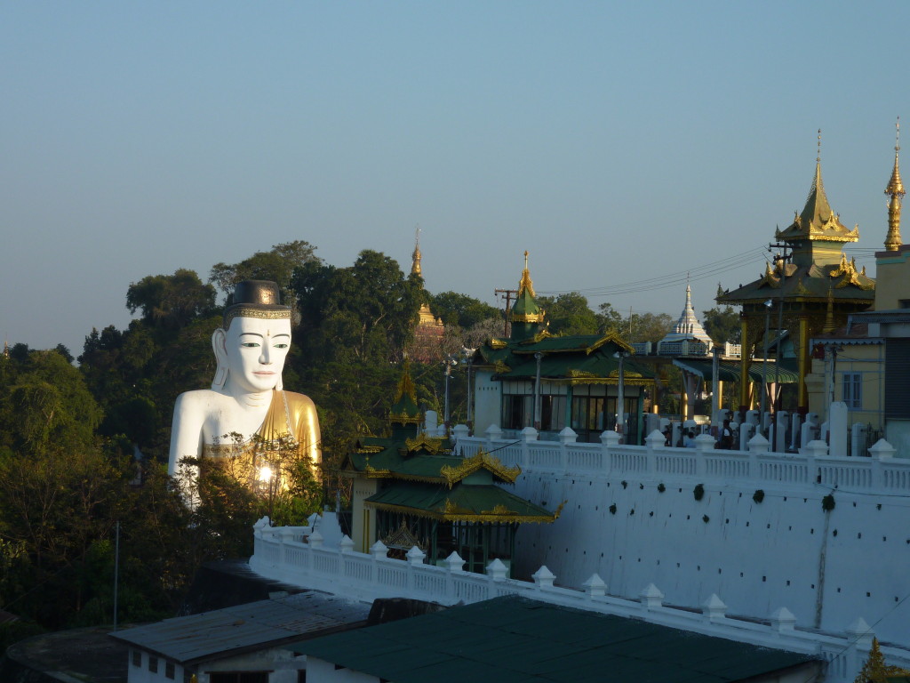 Kurz vor Sonnenuntergang sind wir wieder zurück in der Stadt und besuchen die Shwe Sandaw Pagode. Wir sparen uns den Weg zur Plattform über die vielen Stufen nach oben und leisten uns für 3.000 Kyat eine Fahrt mit dem Aufzug. Wir kommen gerade rechtzeitig, um die goldene Stupa mit den vielen kleinen Nebengebäuden im warmen Abendlicht zu erleben – einschließlich eines Blicks auf den vor dem Hügel emporragenden 10stöckigen Sehtatghy Buddha.