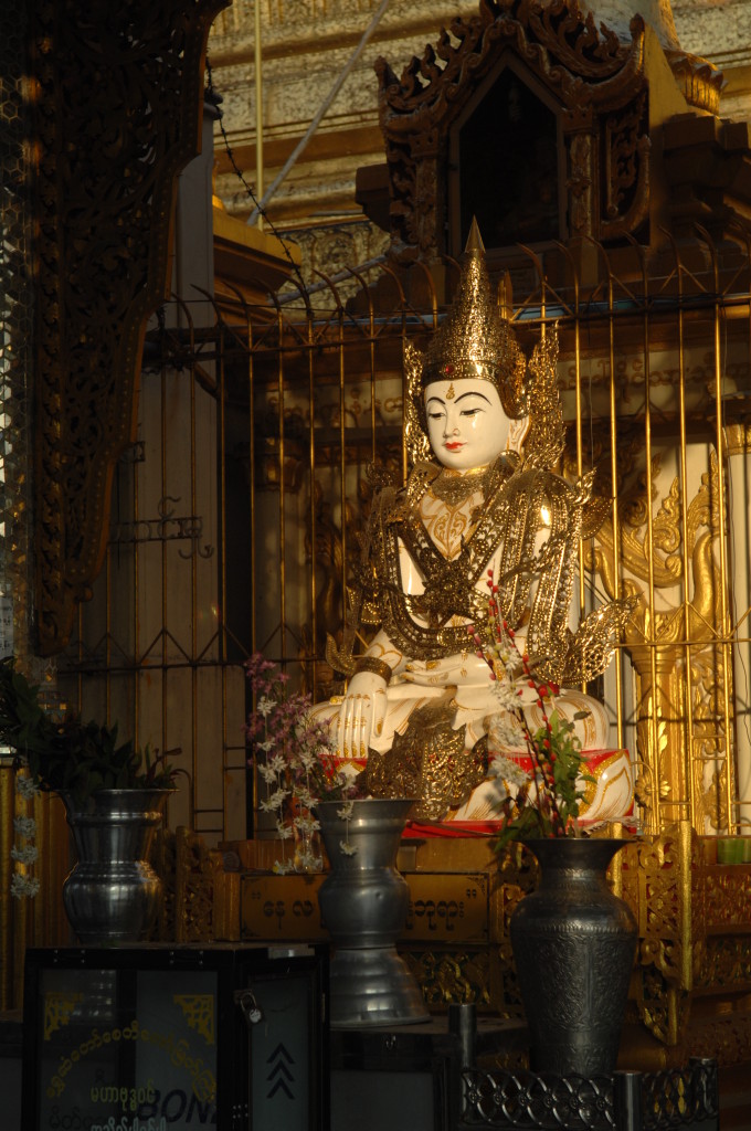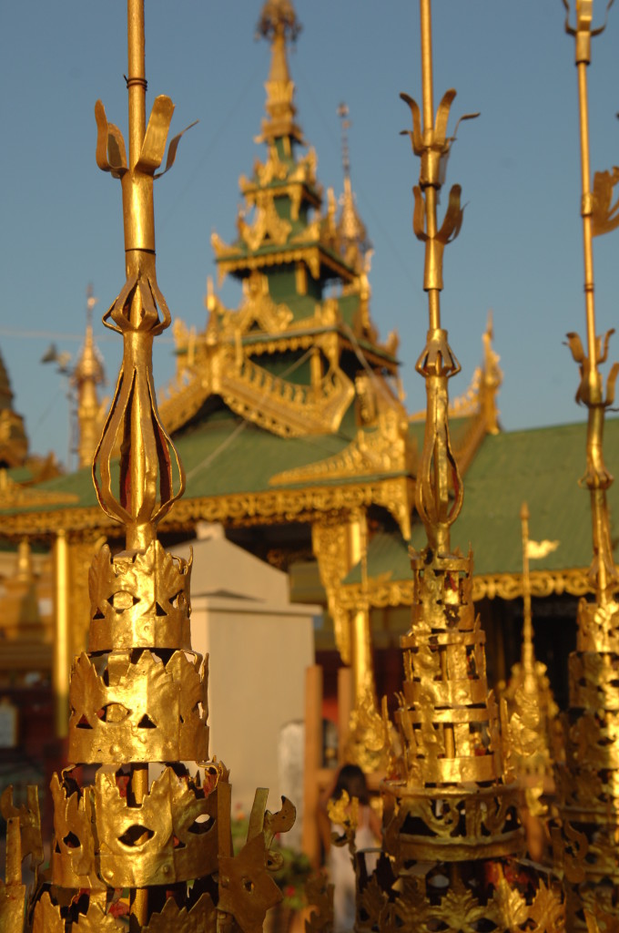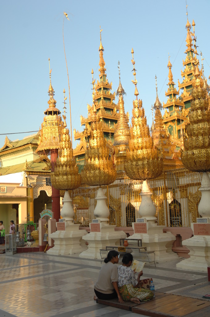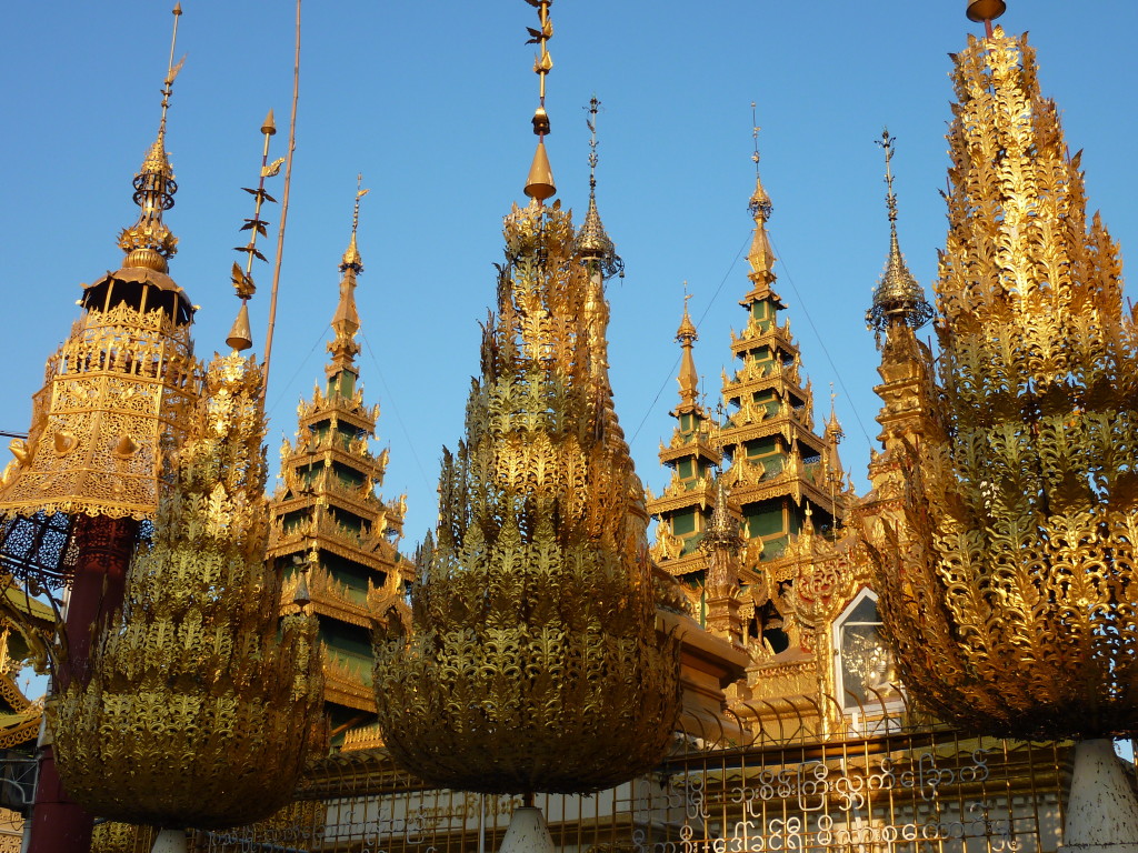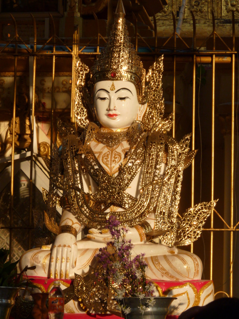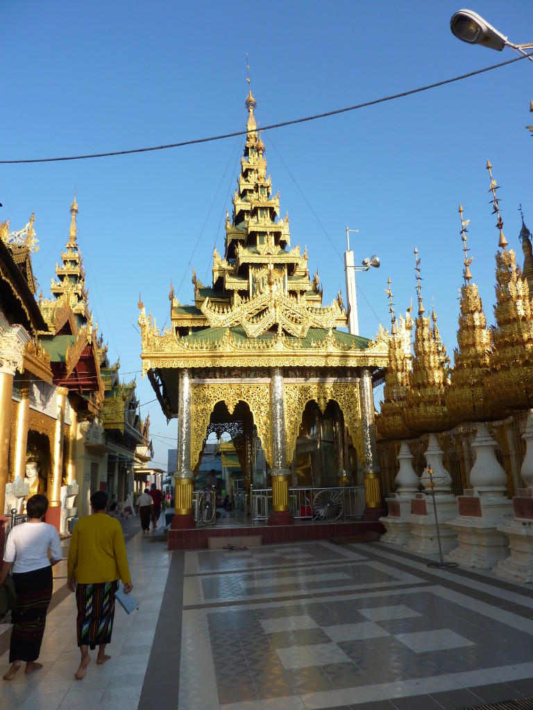 Kurz vor Sonnenuntergang sind wir wieder zurück in der Stadt und besuchen die Shwe Sandaw Pagode. Wir sparen uns den Weg zur Plattform über die vielen Stufen nach oben und leisten uns für 3.000 Kyat eine Fahrt mit dem Aufzug. Wir kommen gerade rechtzeitig, um die goldene Stupa mit den vielen kleinen Nebengebäuden im warmen Abendlicht zu erleben – einschließlich eines Blicks auf den vor dem Hügel emporragenden 10stöckigen Sehtatghy Buddha.