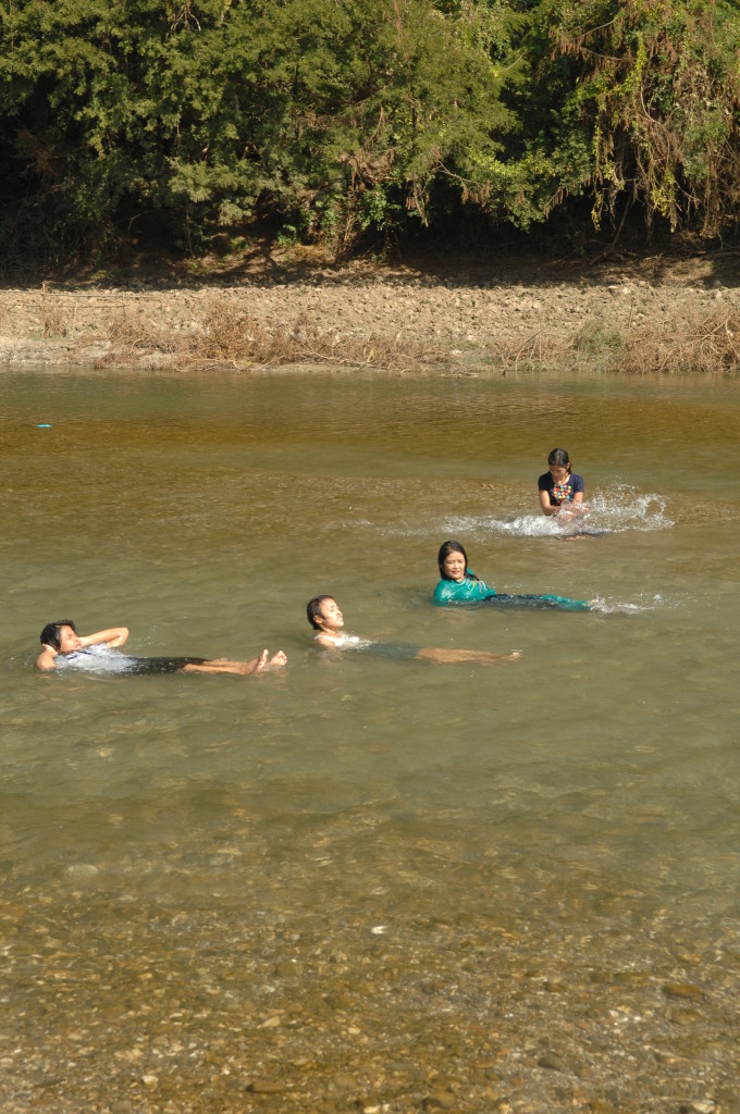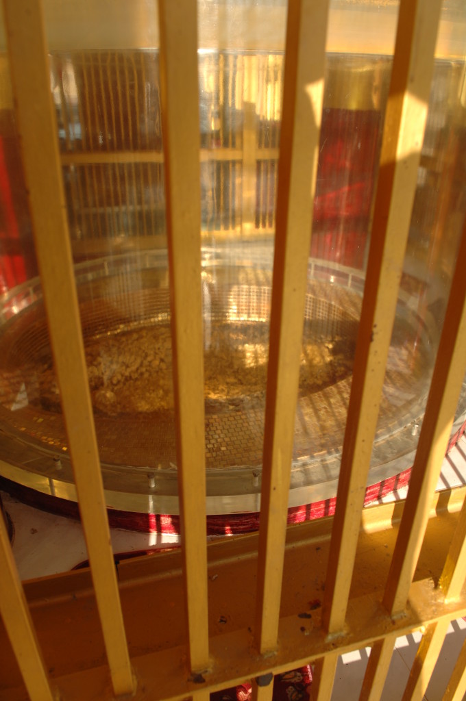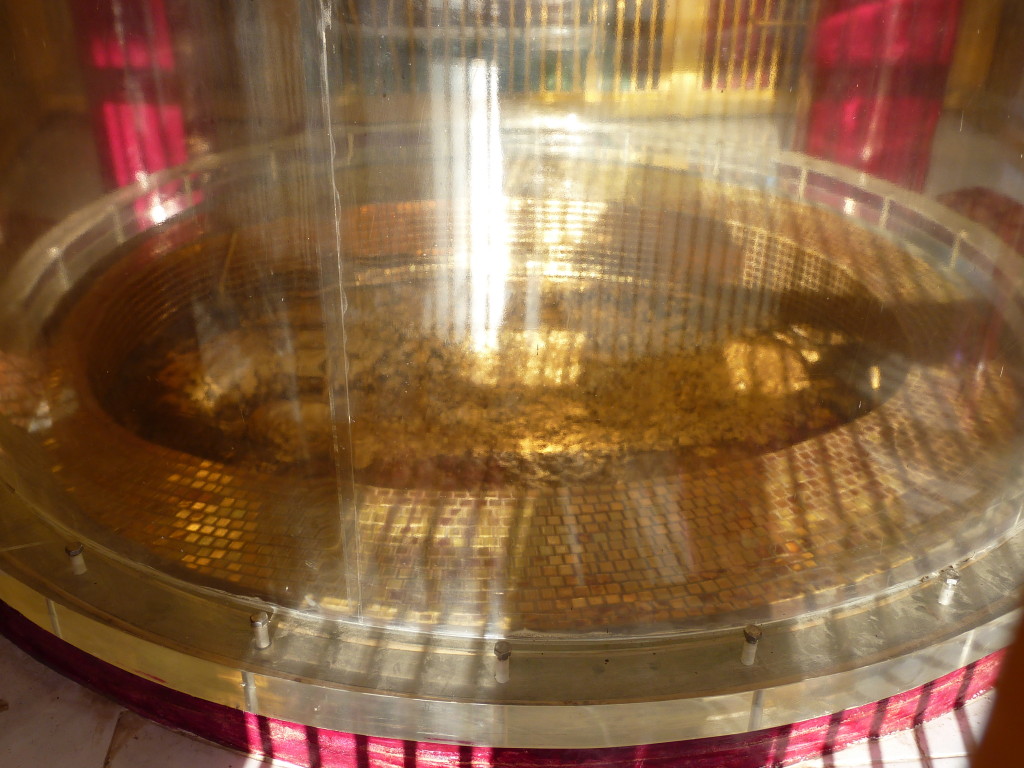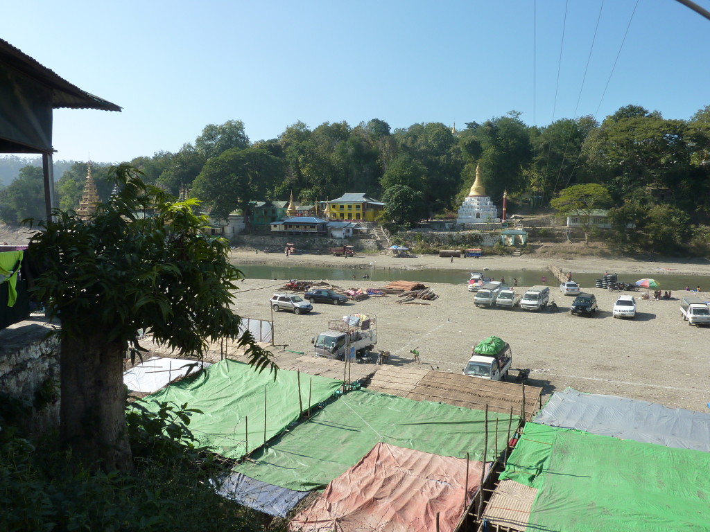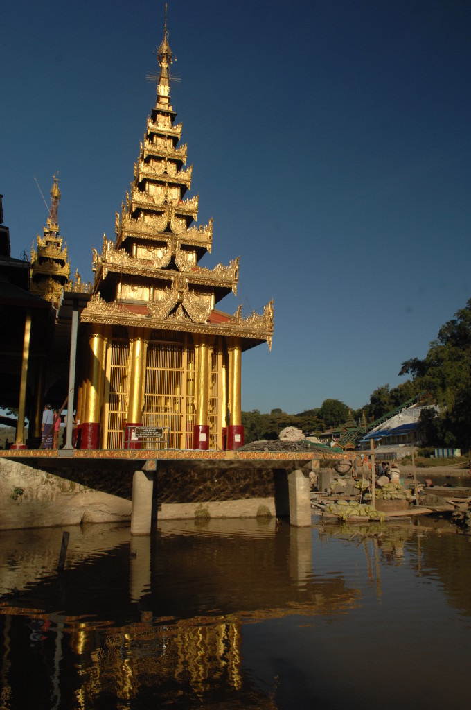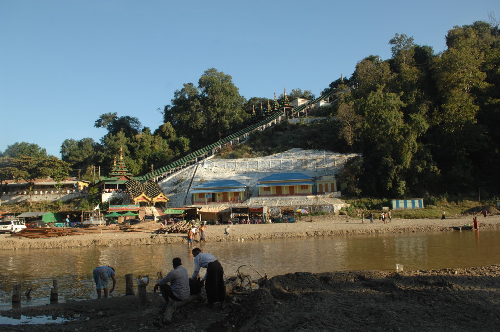 Geschafft! In einem Käfig hinter goldenen Eisenstangen verbirgt sich der dick mit Gold überzogene Fußabdruck Buddhas – übersät mit unzähligen Geldscheinen. Belohnung für den Aufstieg ist der tolle Ausblick auf den Fluss tief unten. Während der Festivalzeit ist das bestimmt noch beeindruckender, wenn er durch das temporäre Dorf der Bambushütten fließt.