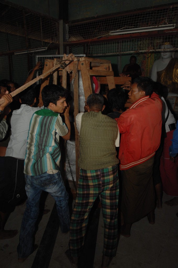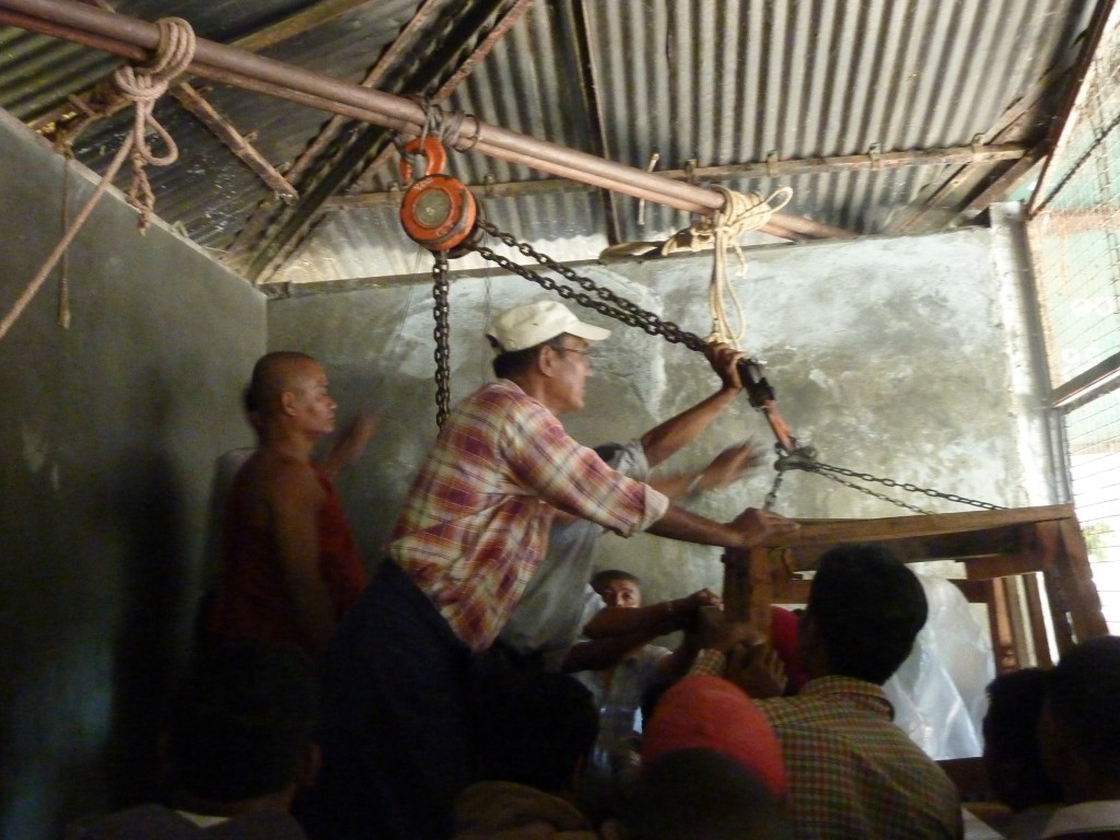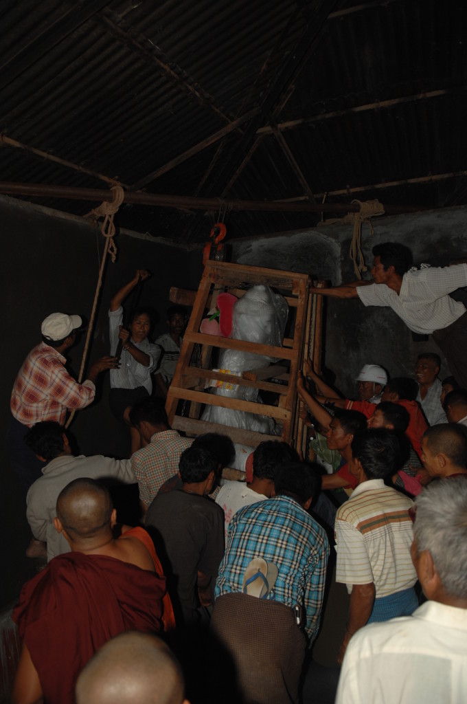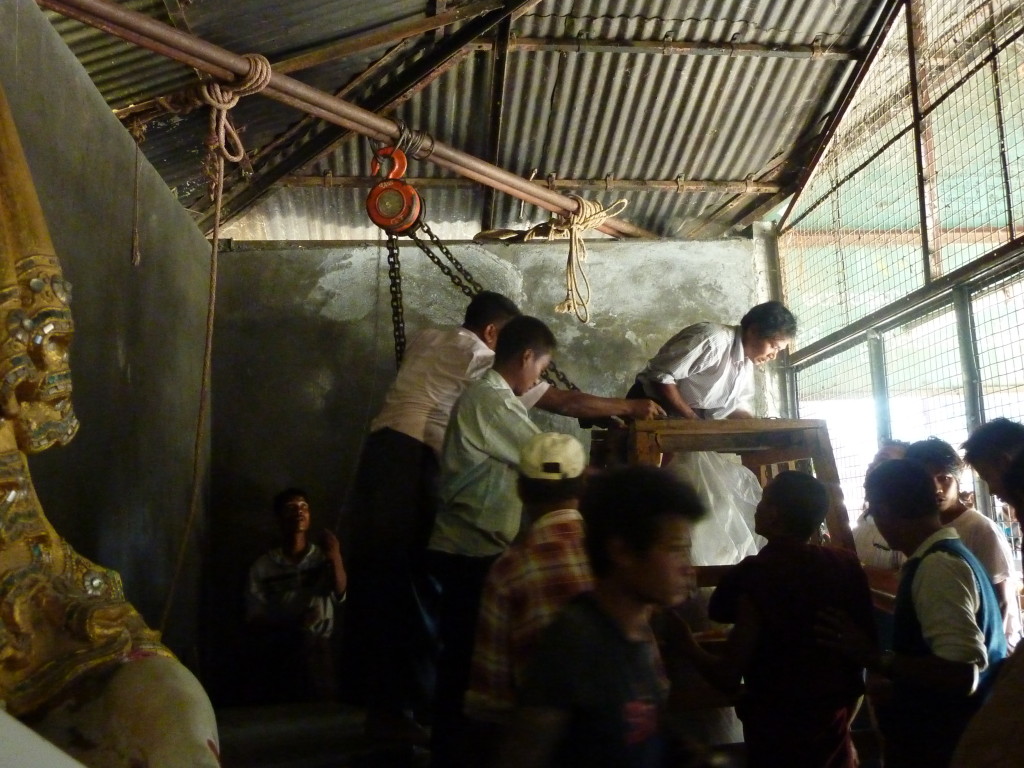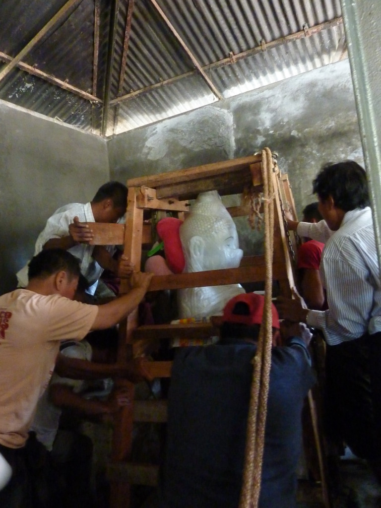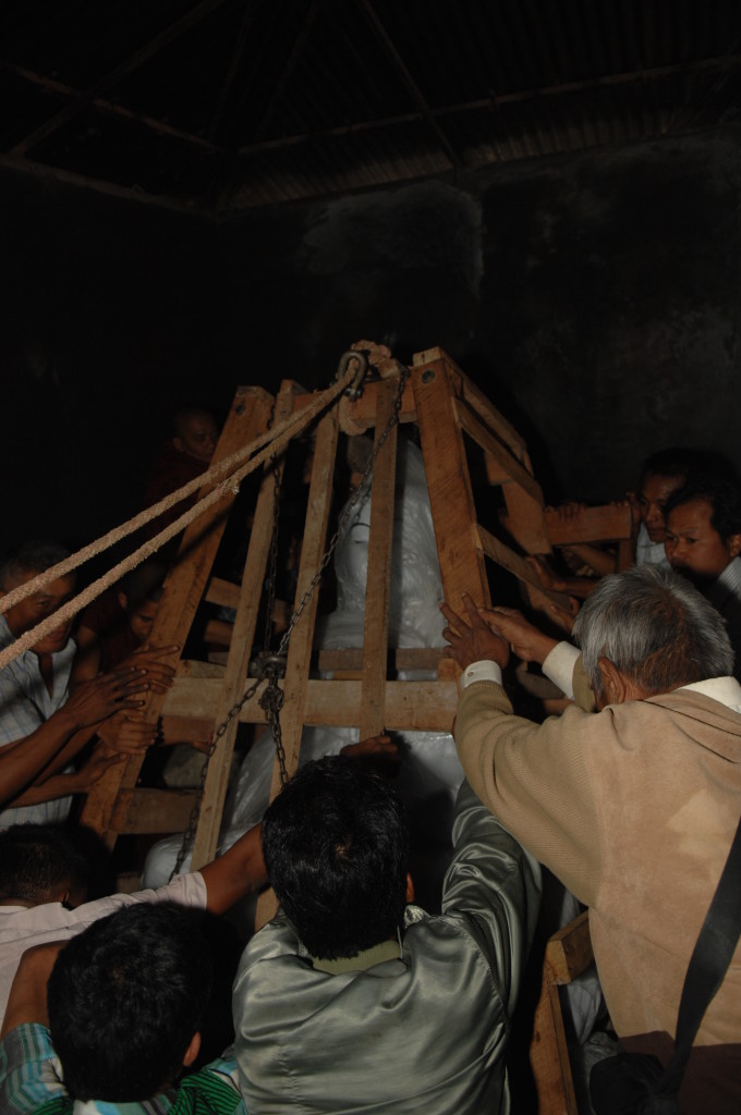 Zurück auf der ersten Plattform ist der Flaschenzug bereits im vollen Einsatz. Unter rhythmischen Rufen und dem Anfeuern der Instrumente wird der weiße Buddha auf sein Podest gehievt. Schon werden die Hände hochgerissen. Der Buddha ist an seinem Bestimmungsort angekommen.