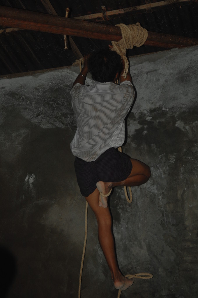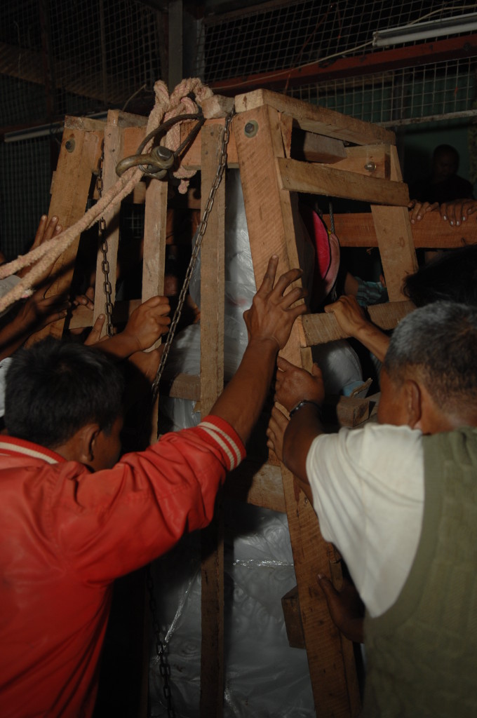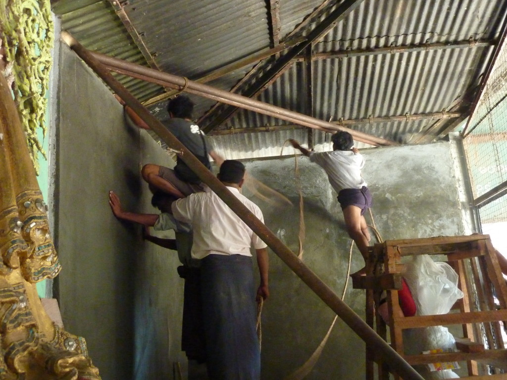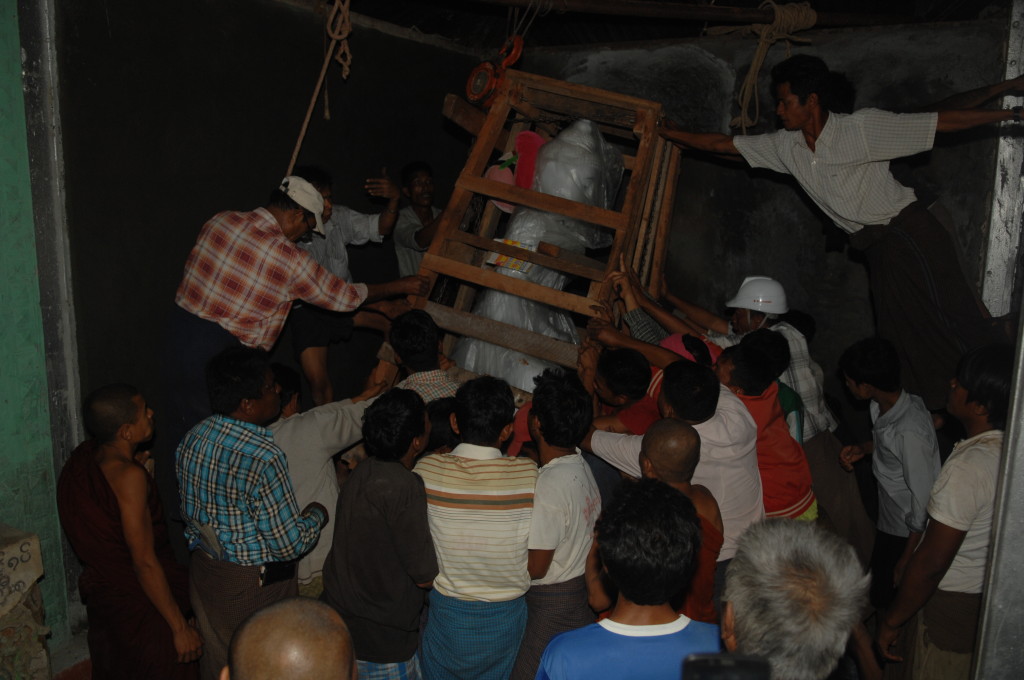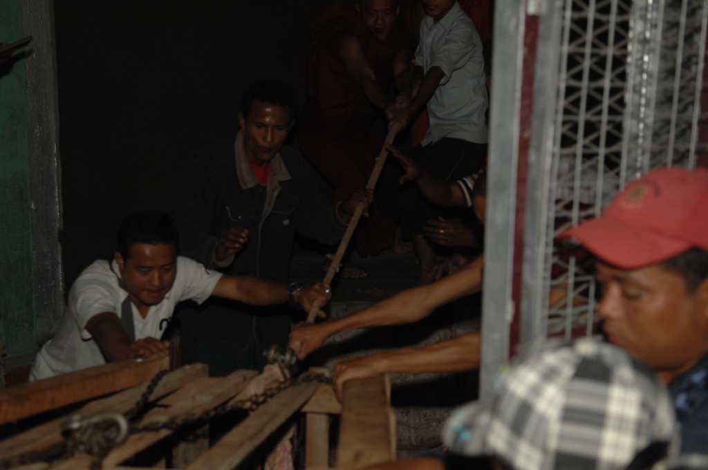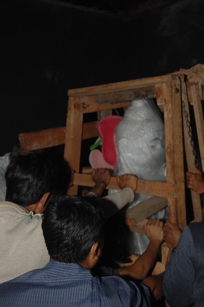 Zurück auf der ersten Plattform ist der Flaschenzug bereits im vollen Einsatz. Unter rhythmischen Rufen und dem Anfeuern der Instrumente wird der weiße Buddha auf sein Podest gehievt. Schon werden die Hände hochgerissen. Der Buddha ist an seinem Bestimmungsort angekommen.