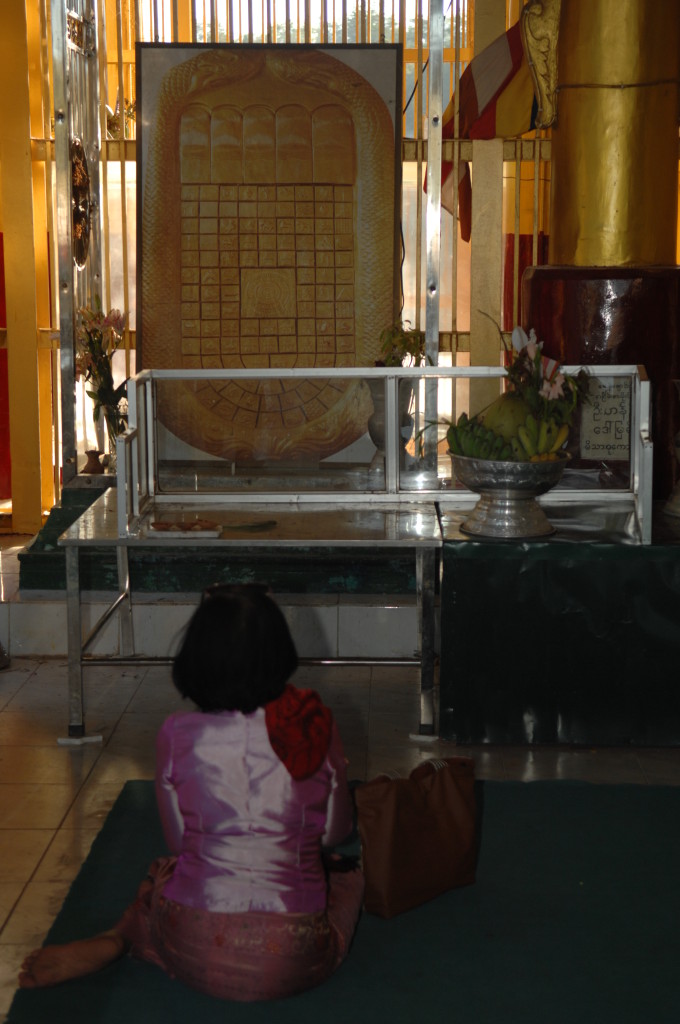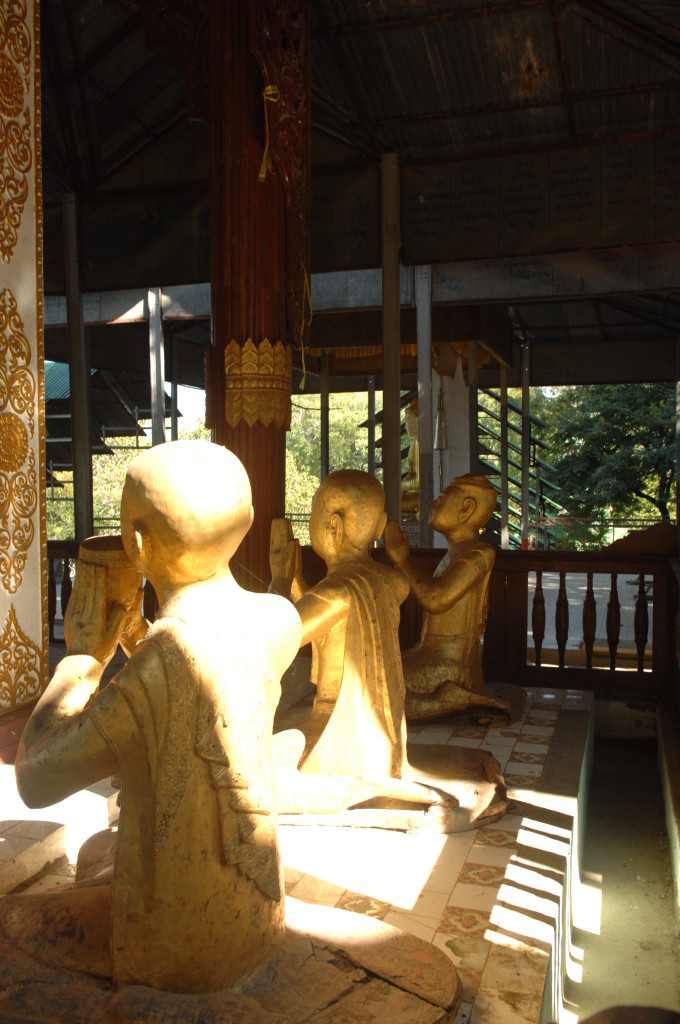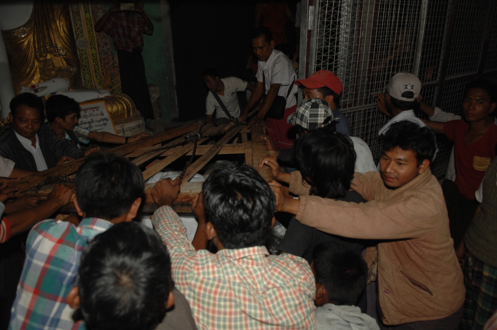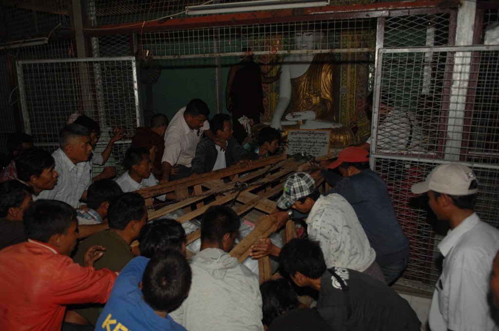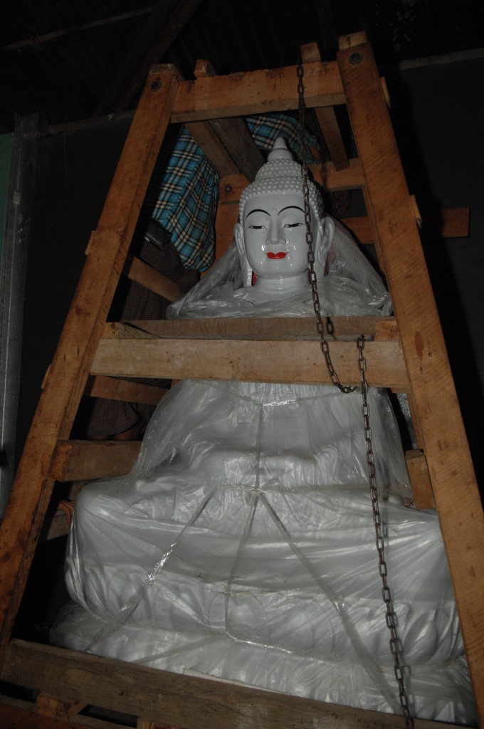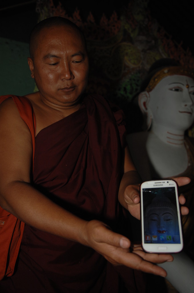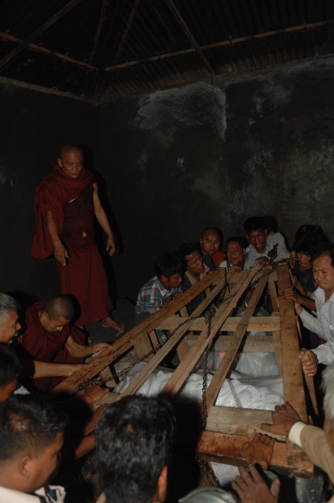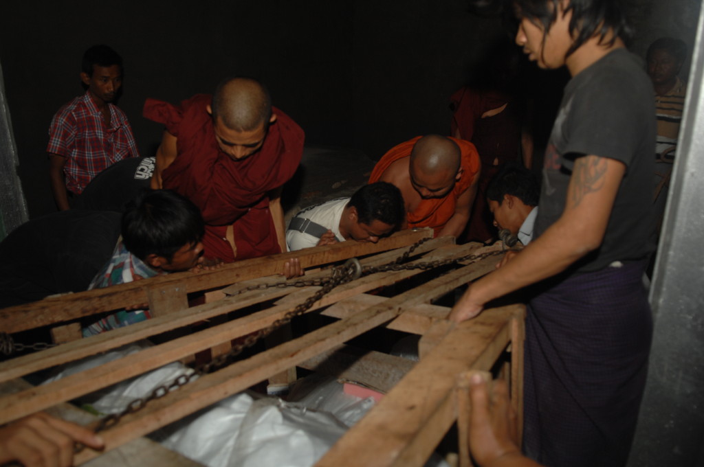 Pandita, was auf Pali so viel heißt wie „weiser Mann“, überwacht den Transport des Buddhas. Der Abt des Aung Thukha Klosters in Minbu zeigt uns auf seinem Handy stolz Bilder der Marmorstatue, die über und über mit eingravierten Reliefs weiterer Darstellungen Buddhas übersät ist.