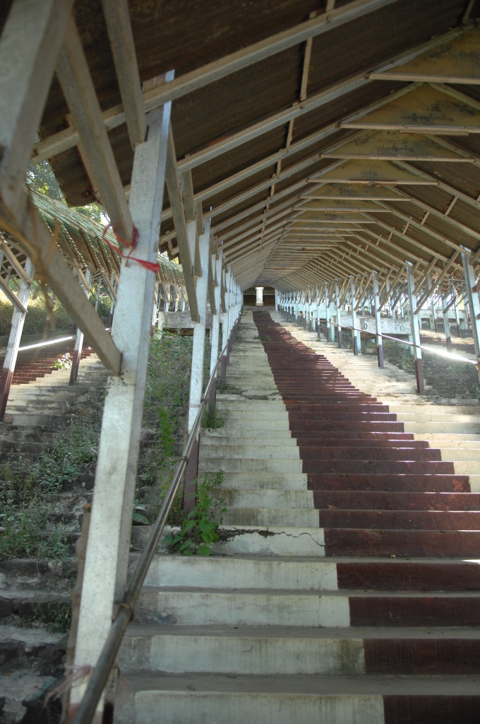 Der Weg zum höhergelegenen Fußabdruck ist beschwerlich. Eine endlos lange Treppe mit mehreren Zwischenstationen führt vom Ufer den Berg hinauf. Zum Glück wartet schon auf der ersten Plattform eine willkommene Unterbrechung. Die Musik war bereits vom Fluss her zu hören. Im Rhythmus von Trommeln, Becken und Gongs wuchtet eine Gruppe Pilger einen etwa 1,50 Meter hohen sitzenden Buddha aus Marmor über Holzplanken in Richtung seines Bestimmungsortes.