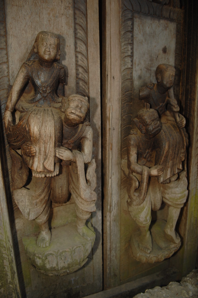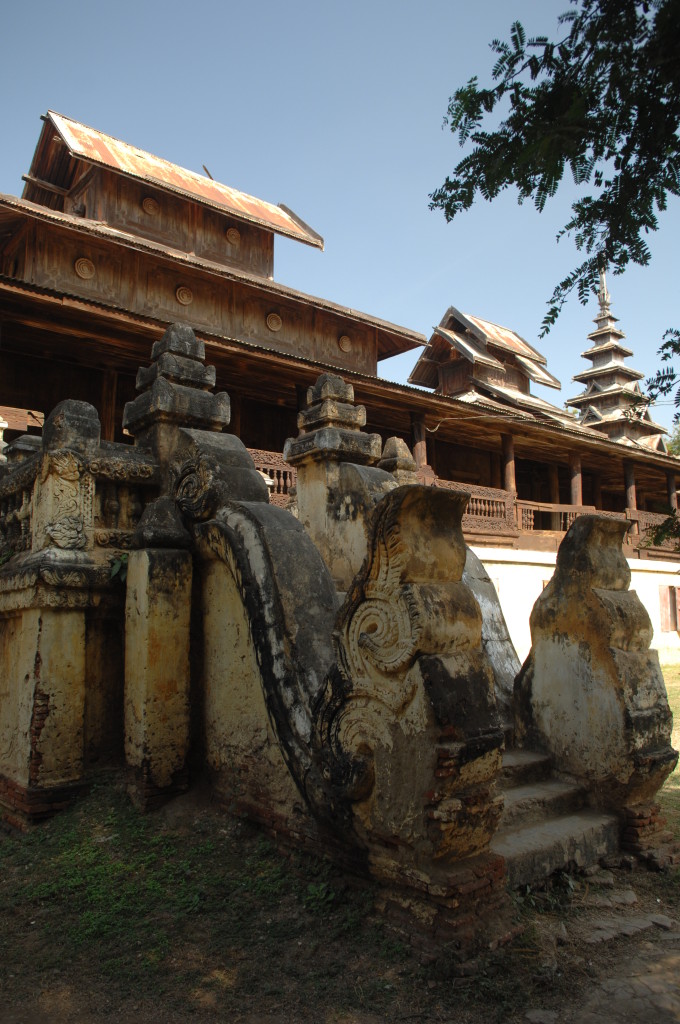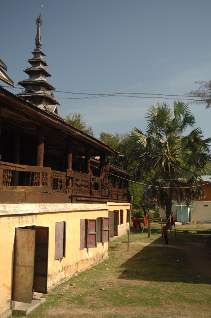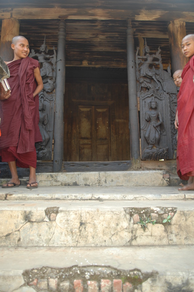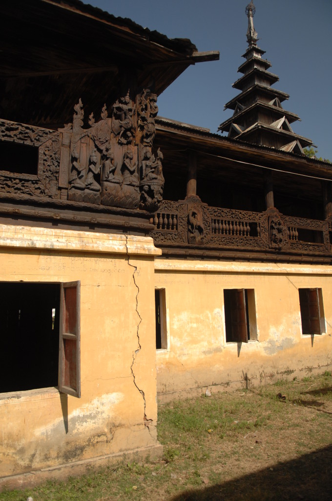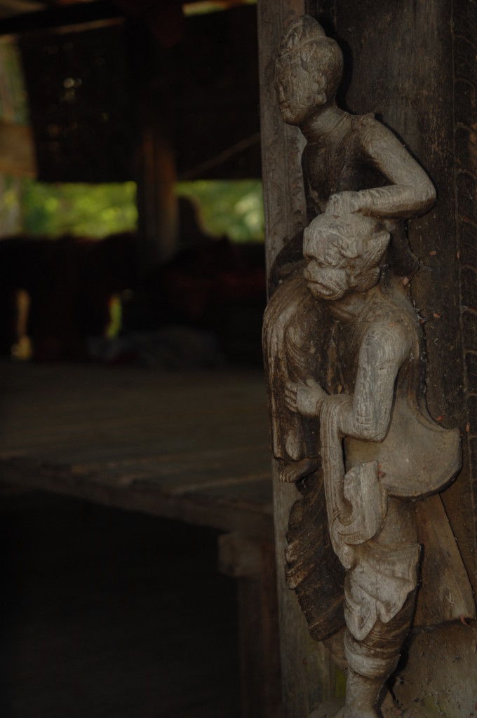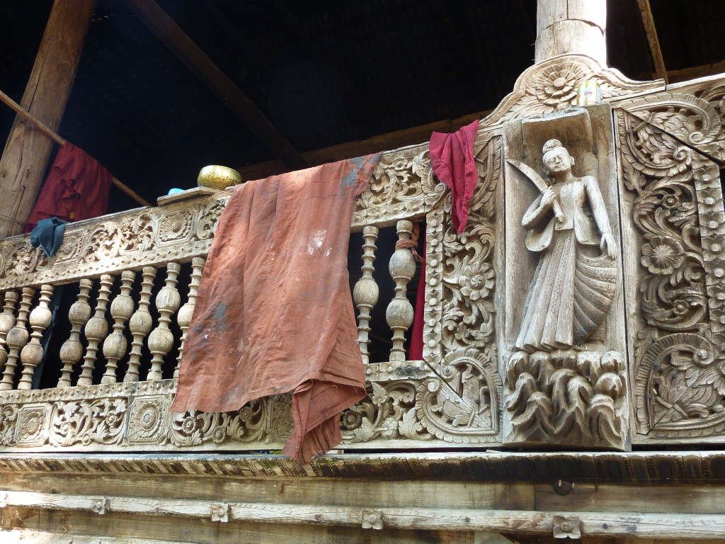 Daher bittet uns der Abt eines weiteren Klosters, keine weiteren Informationen zu Name und Lage des Gebäudes zu geben, das sich in seiner Obhut befindet. Er wurde von seinem Lehrer aus Mandalay an diesen abgelegenen Ort entsandt. Die reichhaltig verzierten Veranden sind zum Glück bislang noch unentdeckt geblieben. Man sieht ihnen den ständigen Wechsel trockener und feuchter Perioden deutlich an. Die arg mitgenommenen Holzfiguren und Ornamente lassen die Pracht früherer Zeiten vielfach nur noch erahnen.