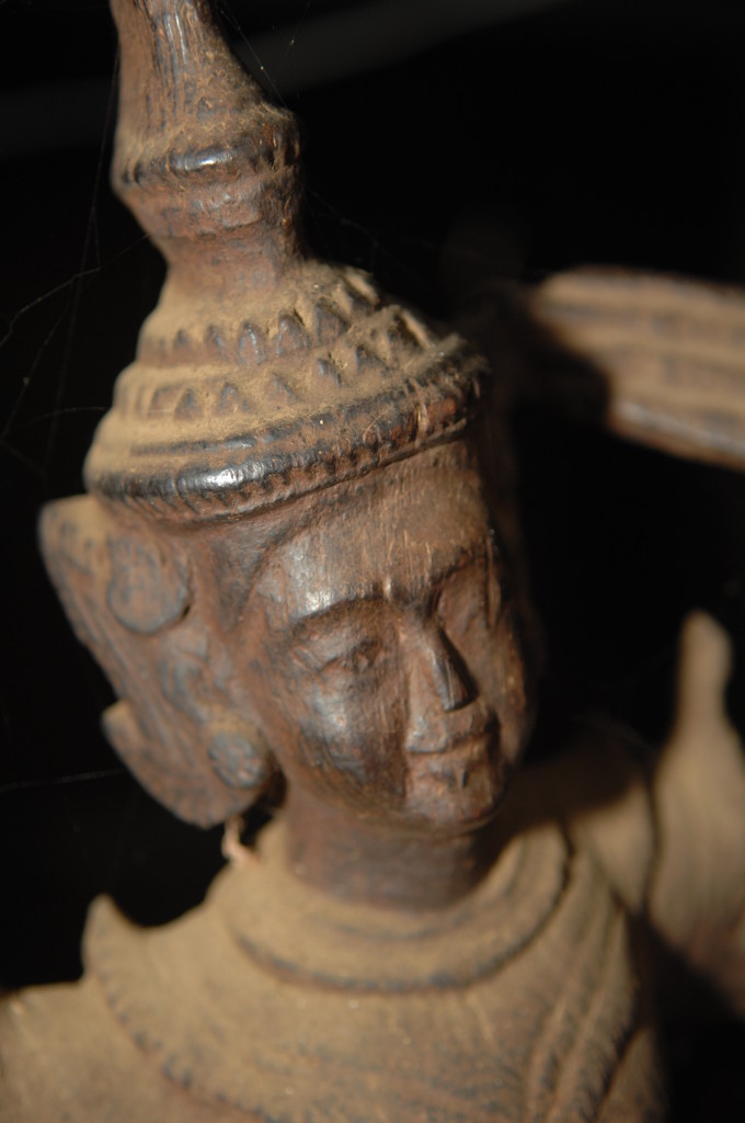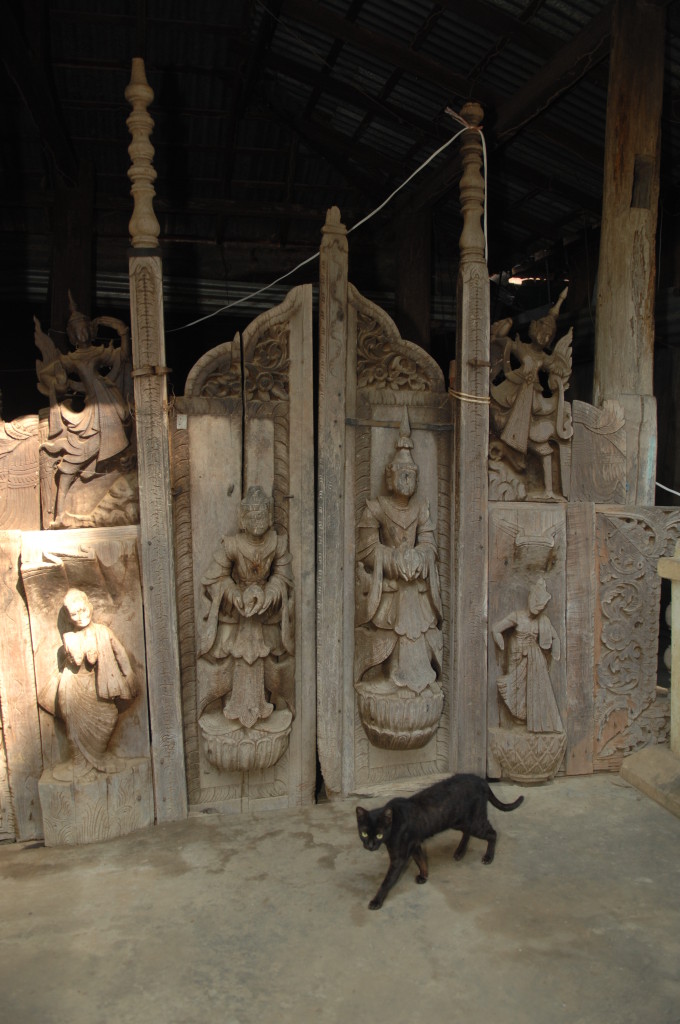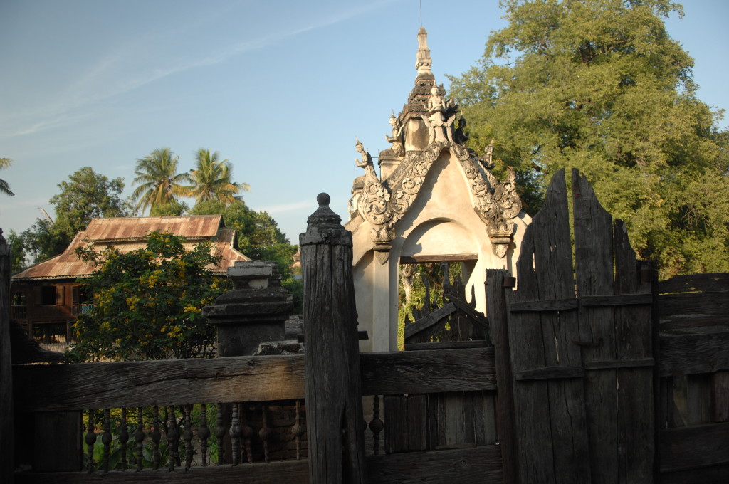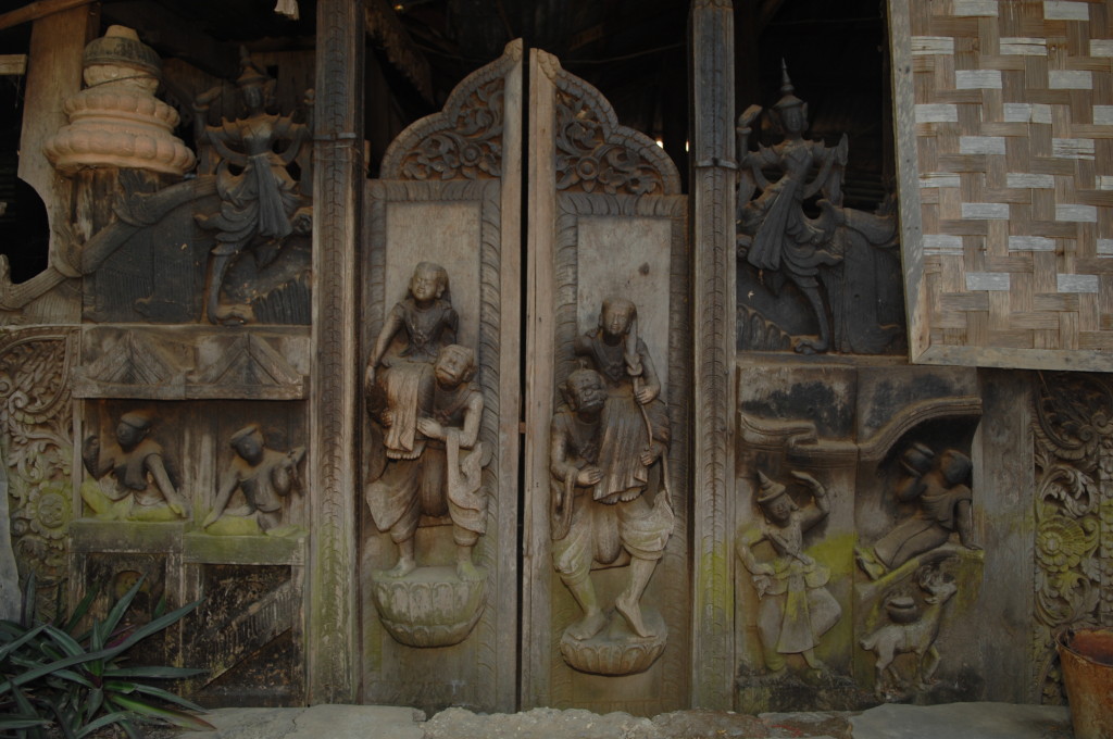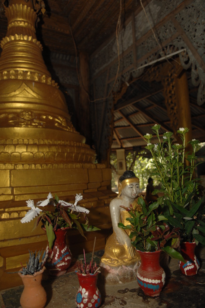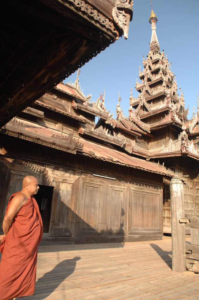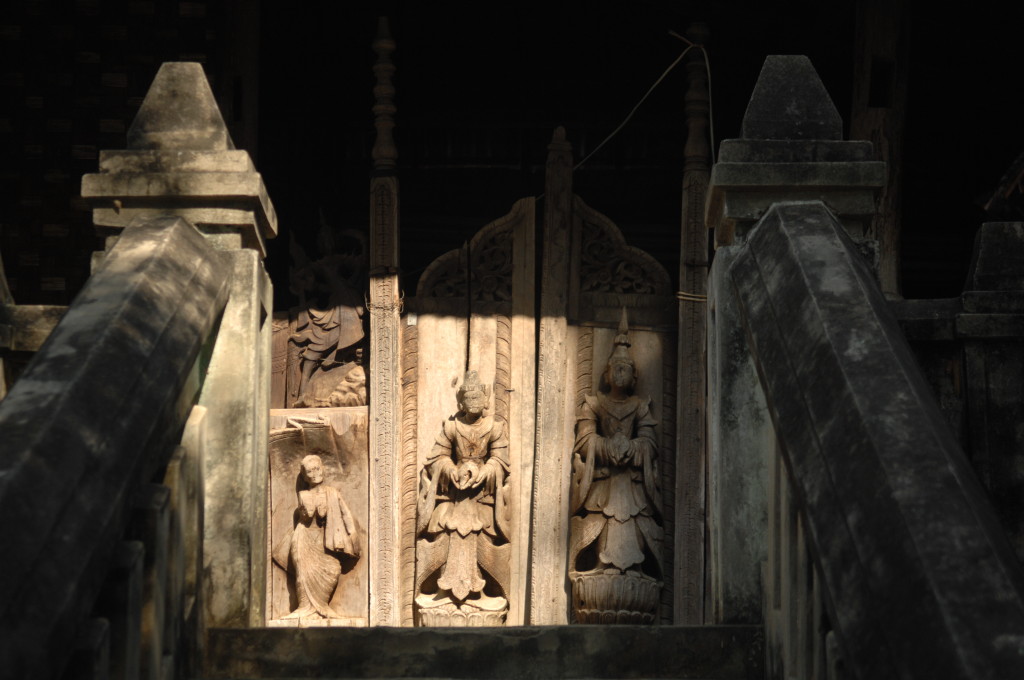 Daher bittet uns der Abt eines weiteren Klosters, keine weiteren Informationen zu Name und Lage des Gebäudes zu geben, das sich in seiner Obhut befindet. Er wurde von seinem Lehrer aus Mandalay an diesen abgelegenen Ort entsandt. Die reichhaltig verzierten Veranden sind zum Glück bislang noch unentdeckt geblieben. Man sieht ihnen den ständigen Wechsel trockener und feuchter Perioden deutlich an. Die arg mitgenommenen Holzfiguren und Ornamente lassen die Pracht früherer Zeiten vielfach nur noch erahnen.