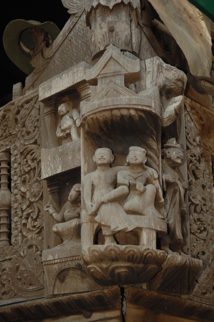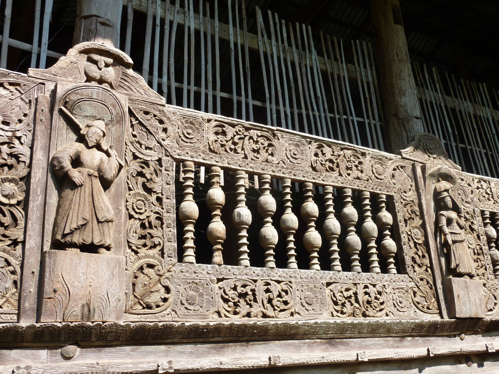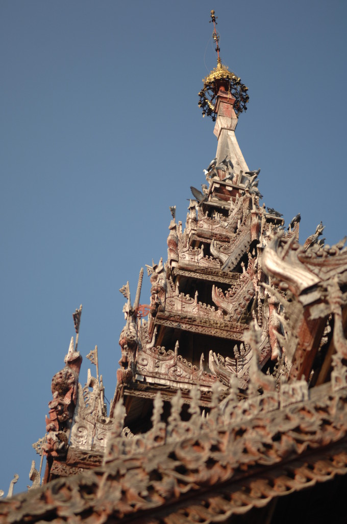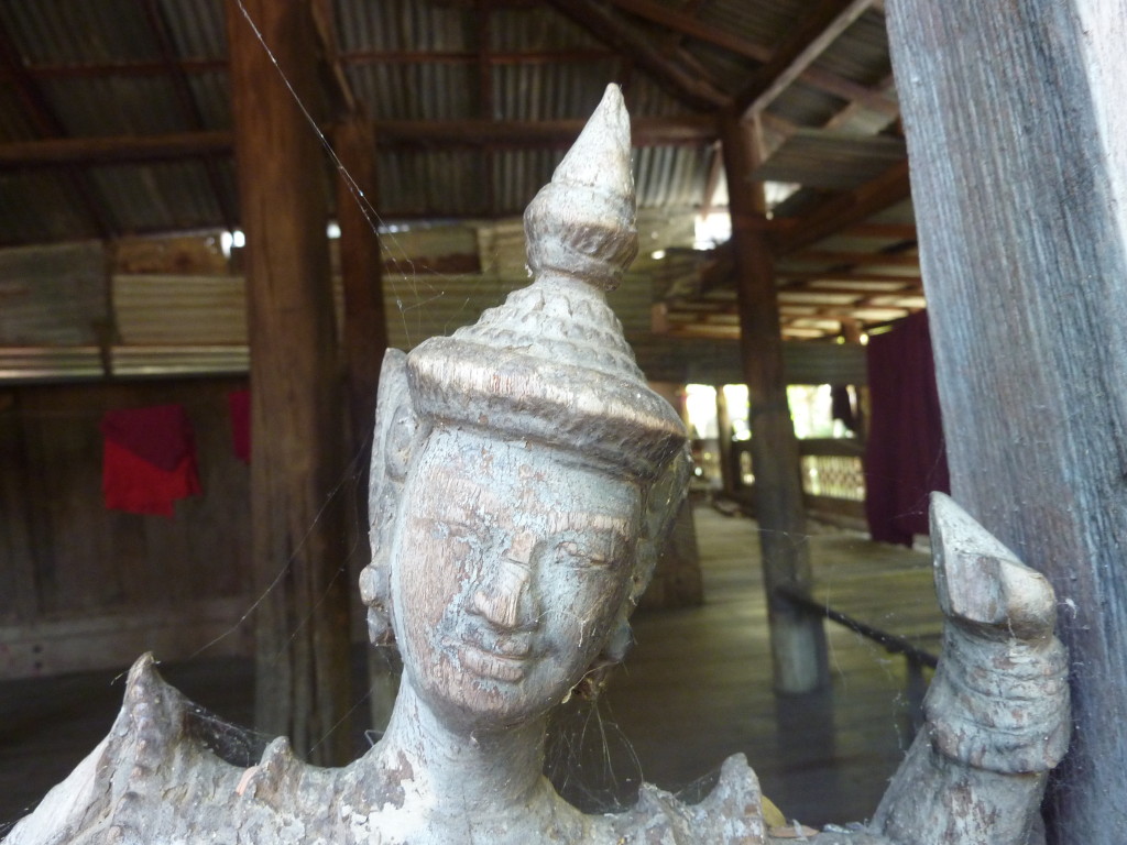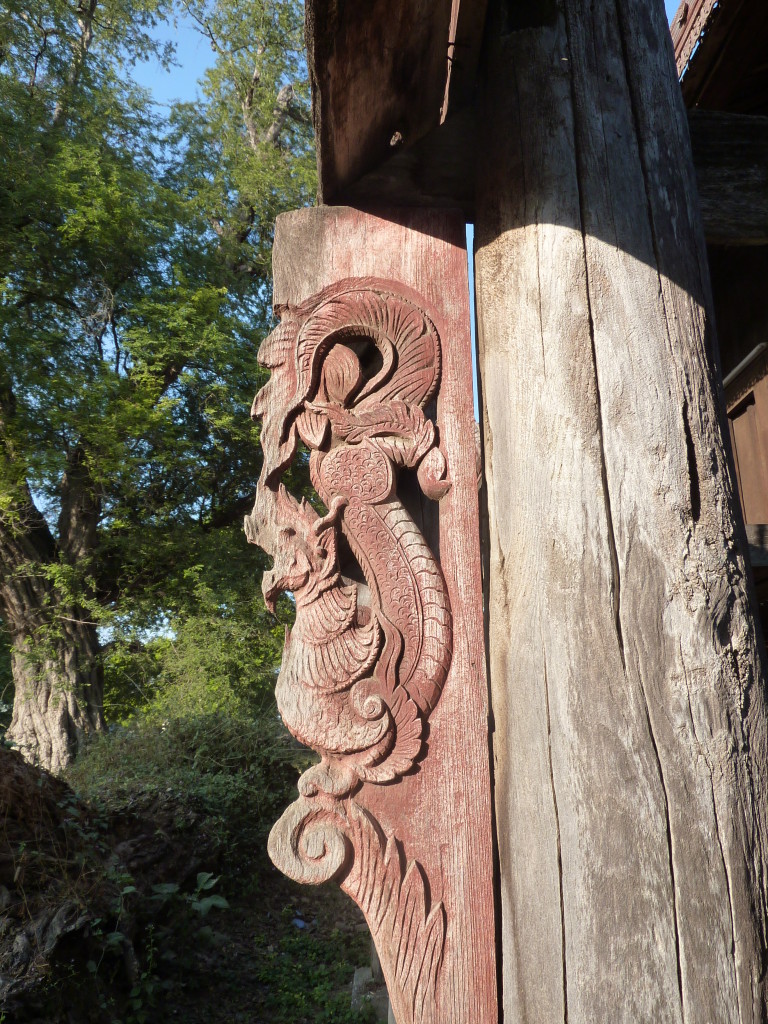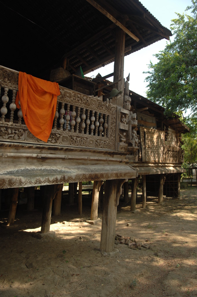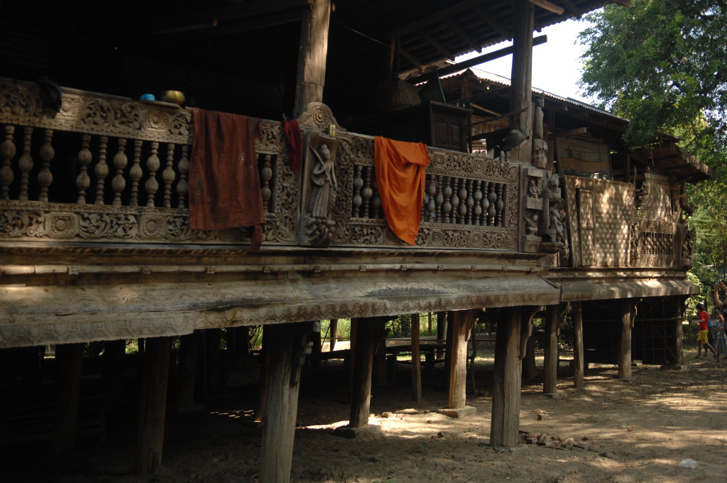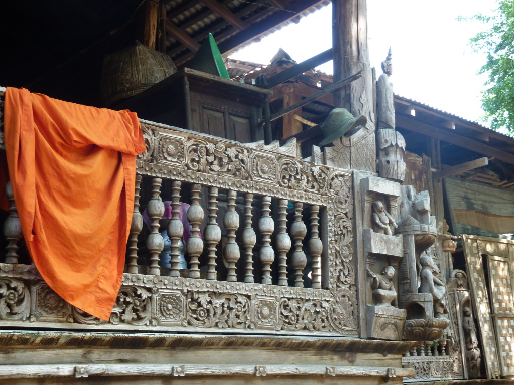 Die Schnitzereien sind weitgehend vollständig erhalten, befinden sich aber in einem deutlich schlechteren Zustand als bei dem zuvor besuchten Kloster. Was hier beeindruckt ist die Vielfalt und Menge der sich bis über die Veranda und die mehrstöckigen Dächer ausbreitenden Kunstwerke und Ornamente aus Teak.