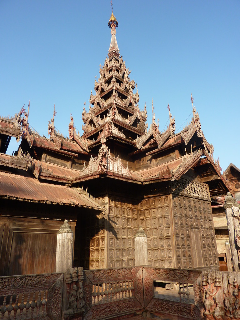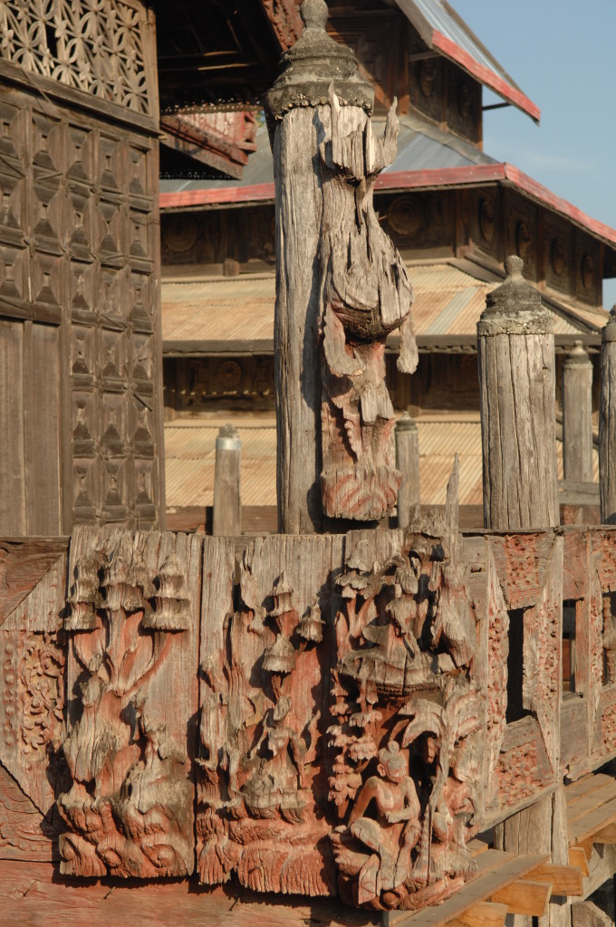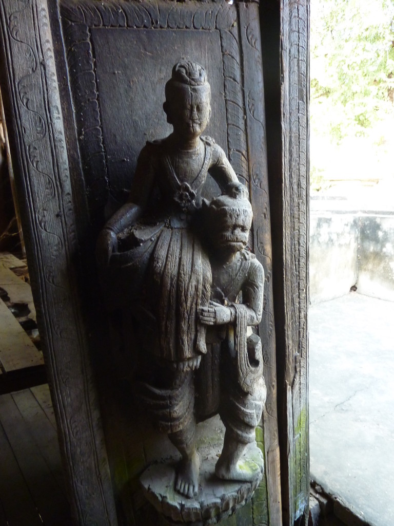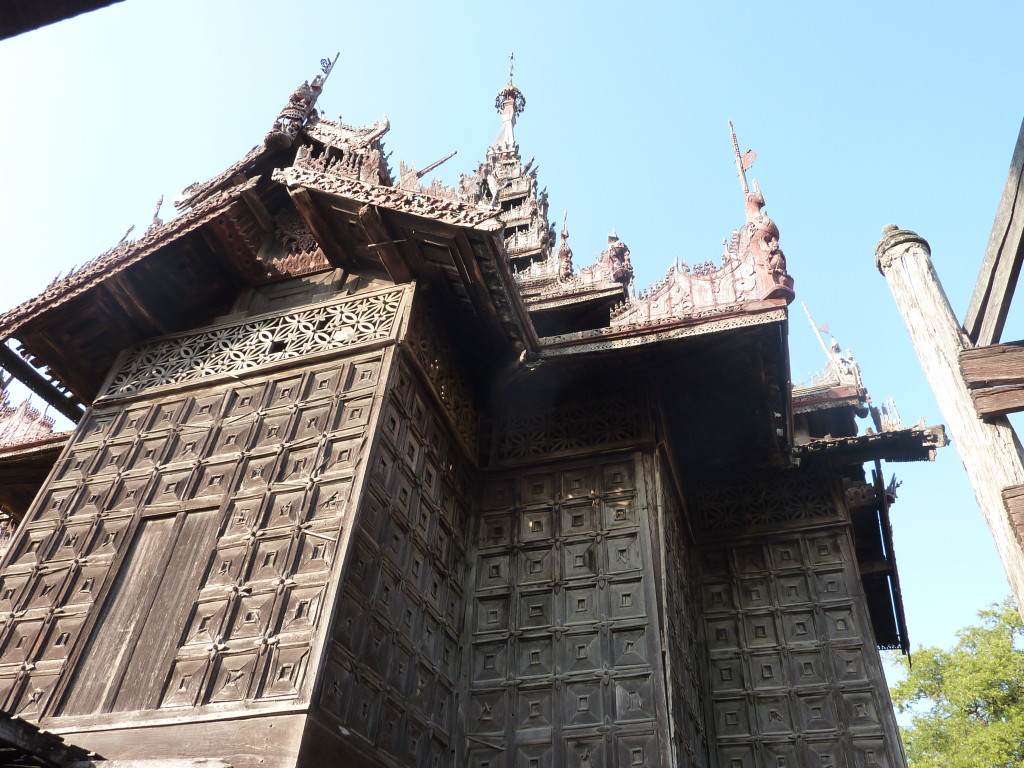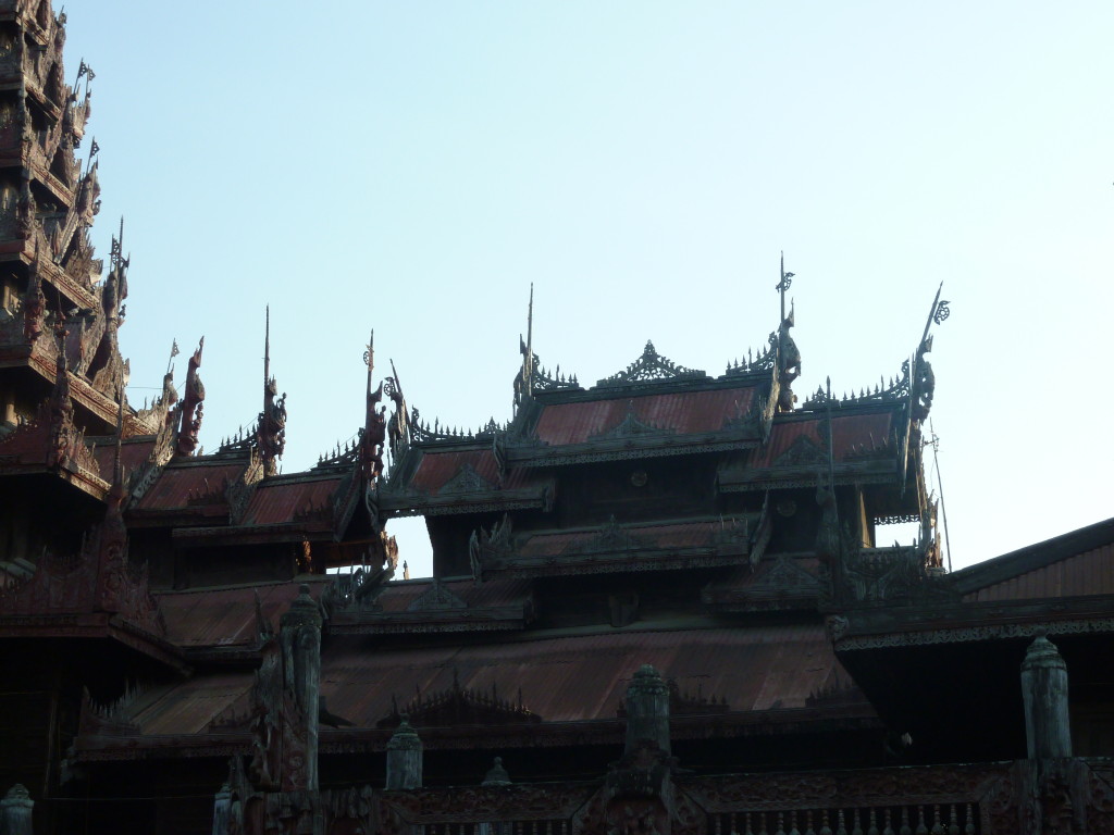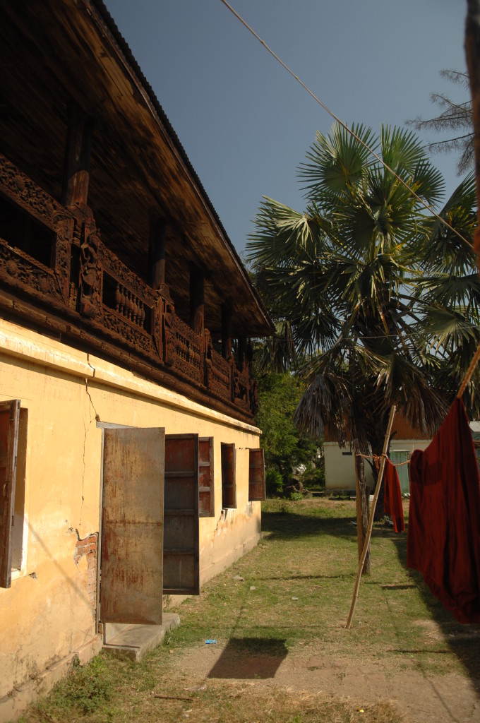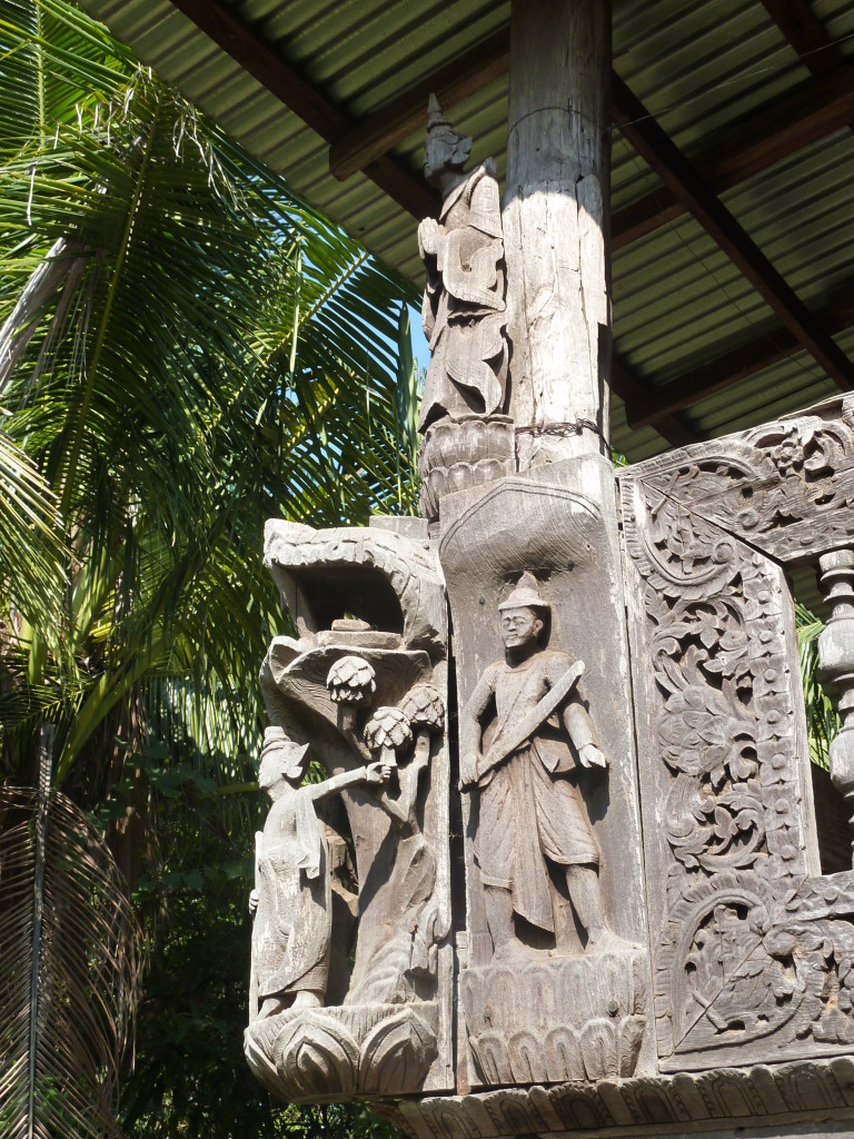 Die Schnitzereien sind weitgehend vollständig erhalten, befinden sich aber in einem deutlich schlechteren Zustand als bei dem zuvor besuchten Kloster. Was hier beeindruckt ist die Vielfalt und Menge der sich bis über die Veranda und die mehrstöckigen Dächer ausbreitenden Kunstwerke und Ornamente aus Teak.