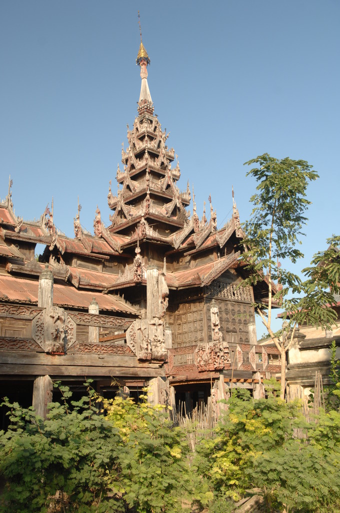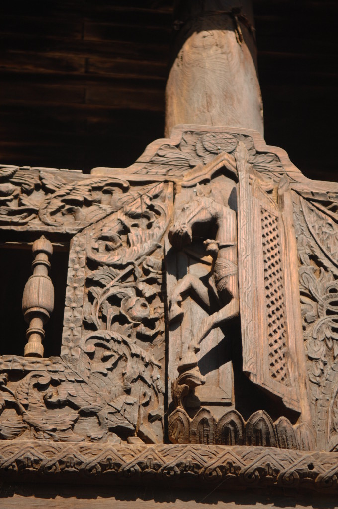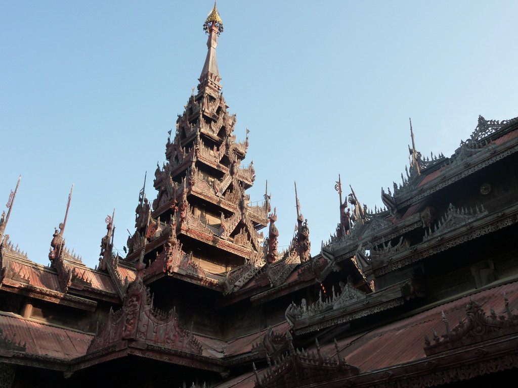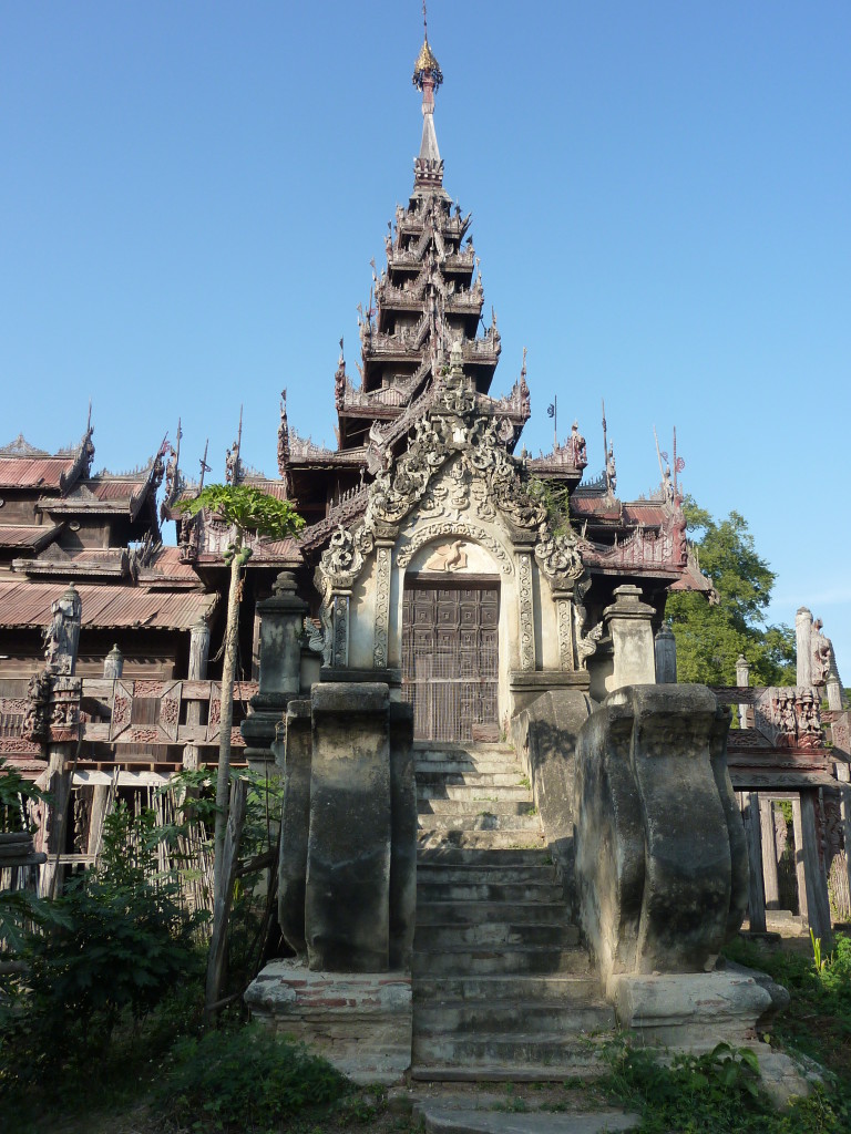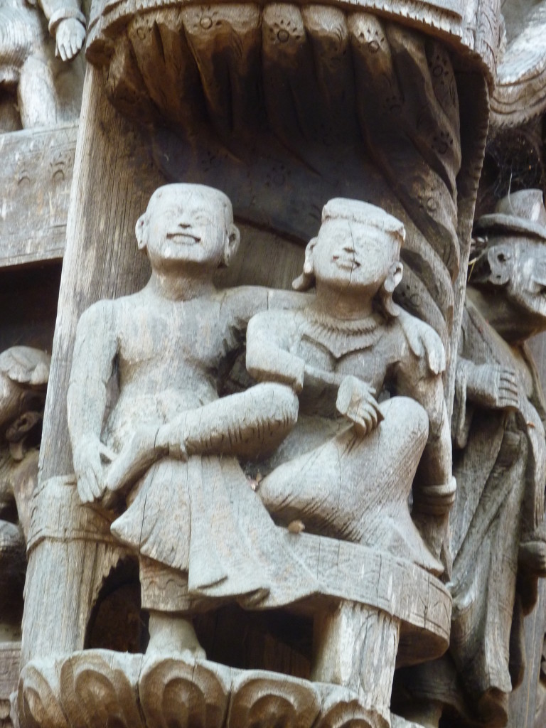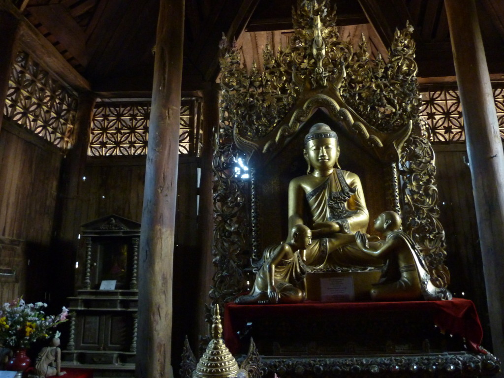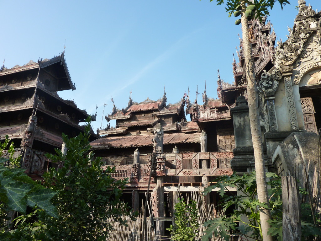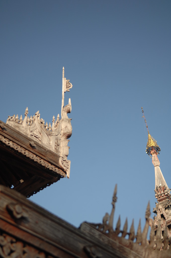 Die Schnitzereien sind weitgehend vollständig erhalten, befinden sich aber in einem deutlich schlechteren Zustand als bei dem zuvor besuchten Kloster. Was hier beeindruckt ist die Vielfalt und Menge der sich bis über die Veranda und die mehrstöckigen Dächer ausbreitenden Kunstwerke und Ornamente aus Teak.