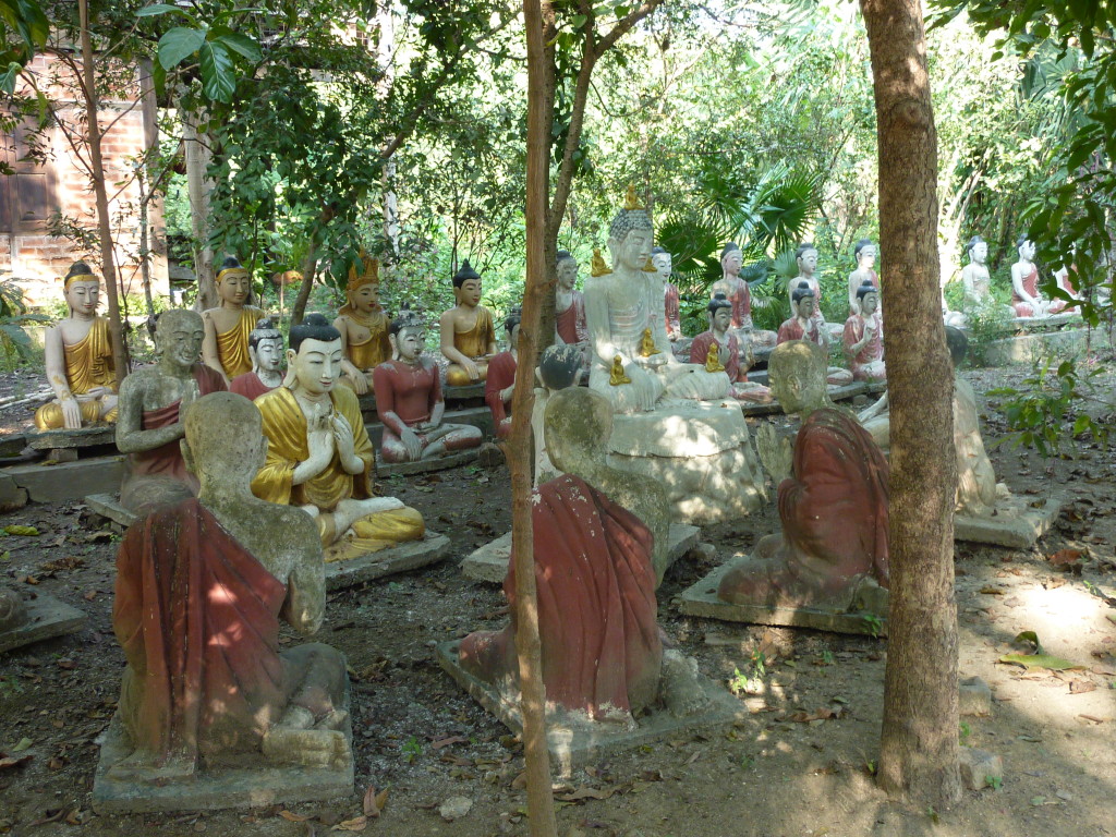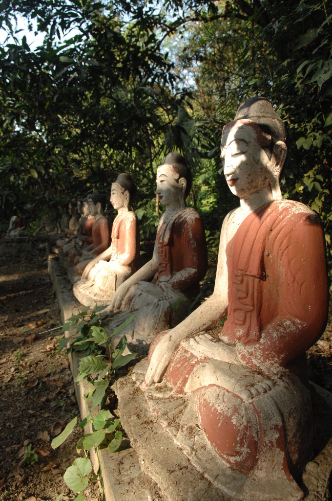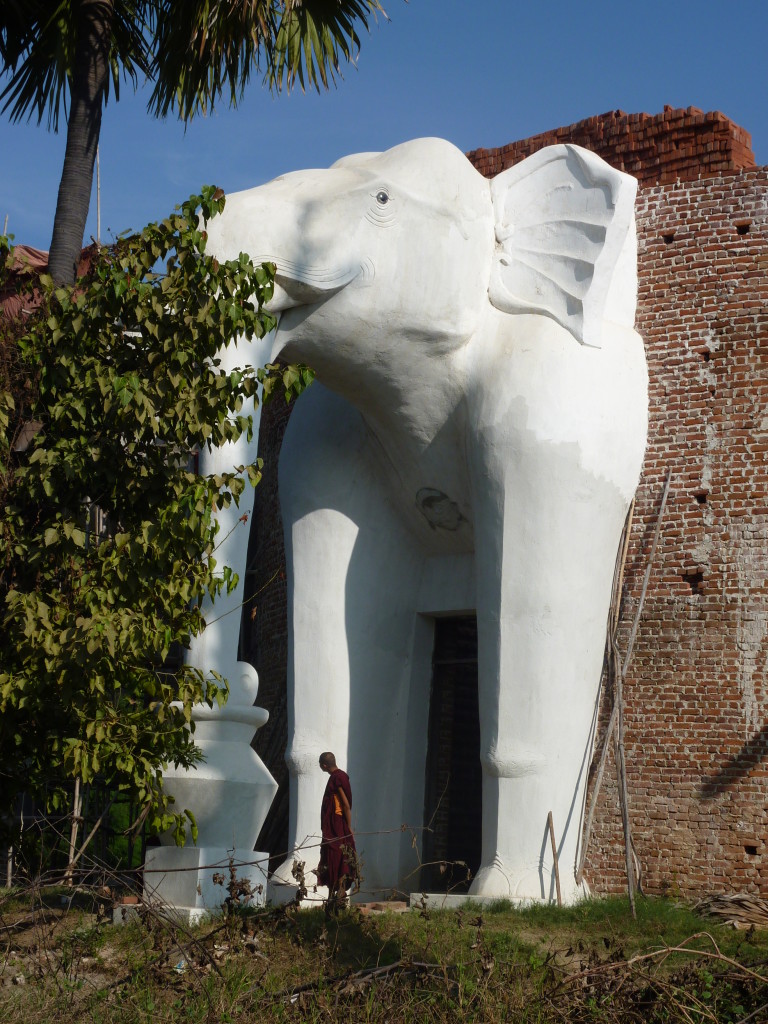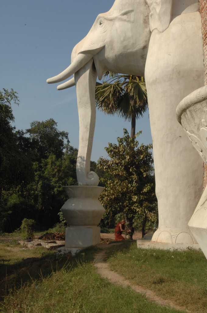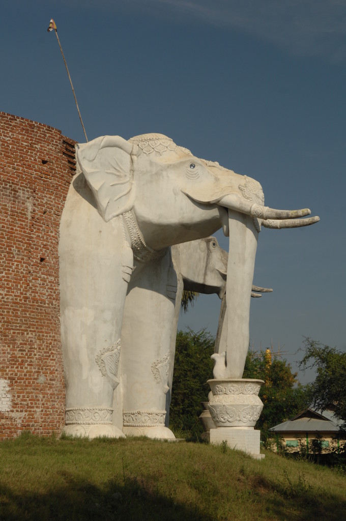 Etwa auf halber Strecke zwischen Magway und Bagan liegt Salin. Hier entsteht gerade ein neues Heiligtum. Acht Elefanten schauen in alle Himmelsrichtungen. Sieben der acht weißen Dickhäuter sind bereits vollendet. Noch ist alles eine große Baustelle. In den Nischen im Inneren des zylindrischen Baus herrscht noch gähnende Leere. Hier werden die zahlreichen Buddha-Bildnisse ihren Platz finden, die hundert Meter weiter am Wegesrand auf ihren neuen Bestimmungsort warten.