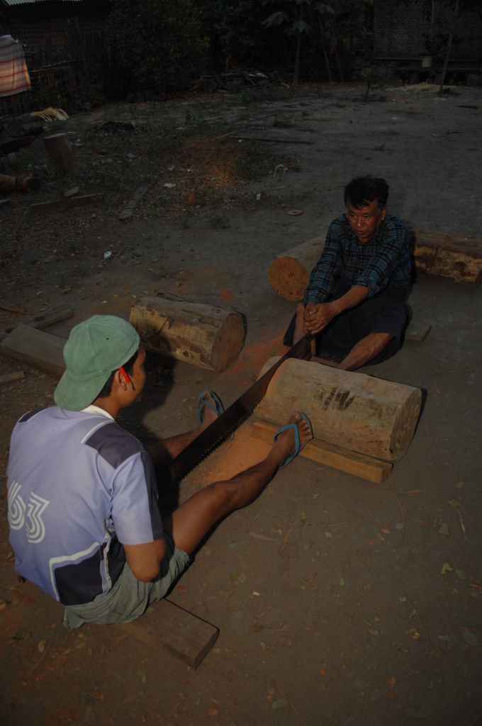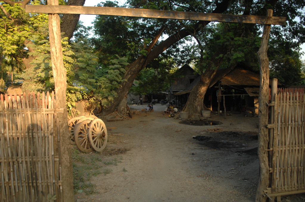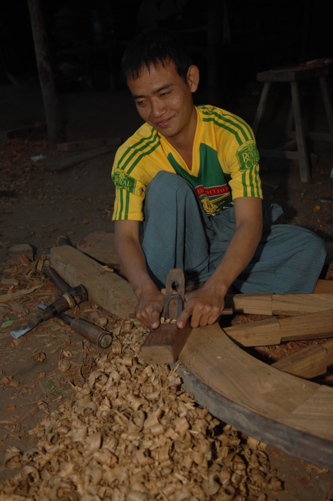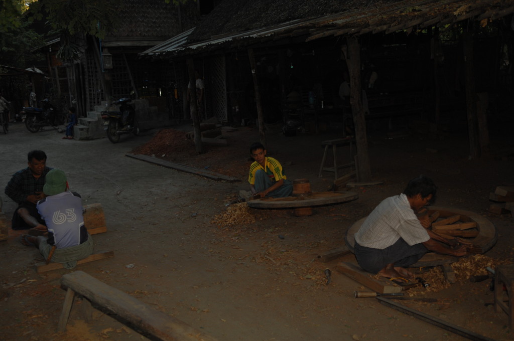 Bevor wir in der einbrechenden Dunkelheit auf einer staubigen Straße durch die Savanne entlang des Irrawaddy nach Bagan fahren, besuchen wir im Licht der Abendsonne einen traditionellen Stellmacher. Wir finden die Werkstätten etwas weiter südlich des Klosters auf dem Weg zu den Stupas von Buddha Tataung. Die Handwerker fertigen die großen Räder für die Ochsenkarren wie in alten Zeiten. Gesägt und gehobelt wird noch von Hand. Doch für das präzise Bohren der Löcher zur Befestigung der Speichen liegt bereits eine große Bohrmaschine bereit.