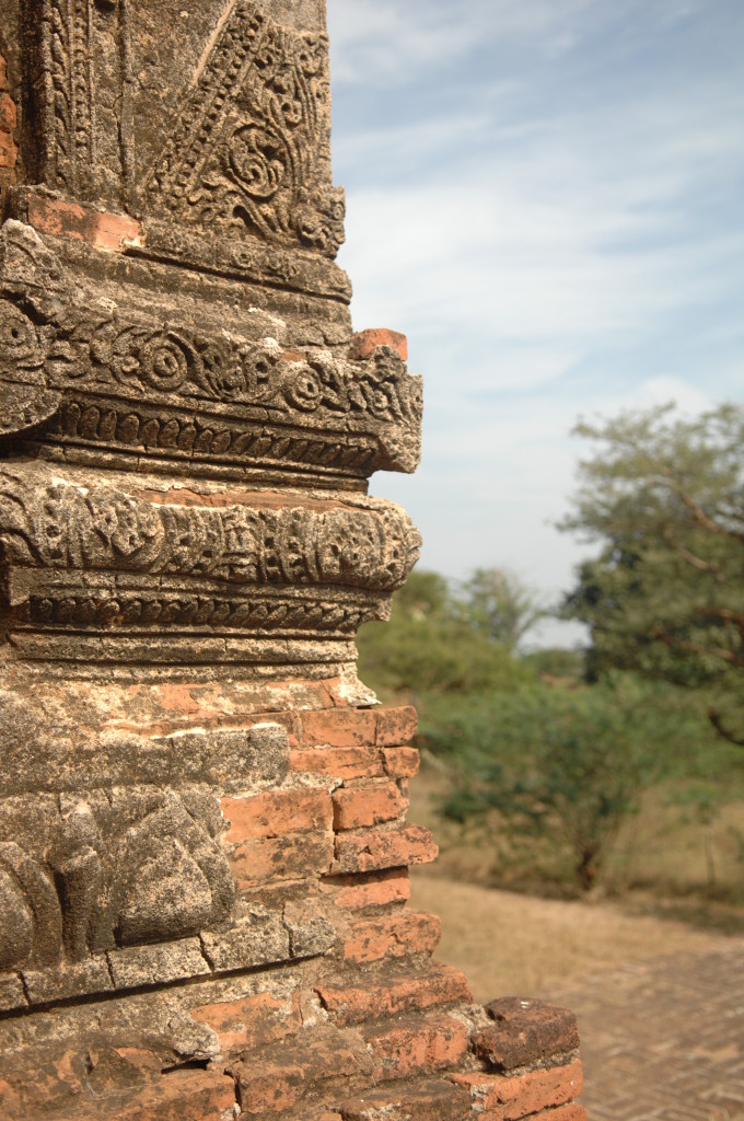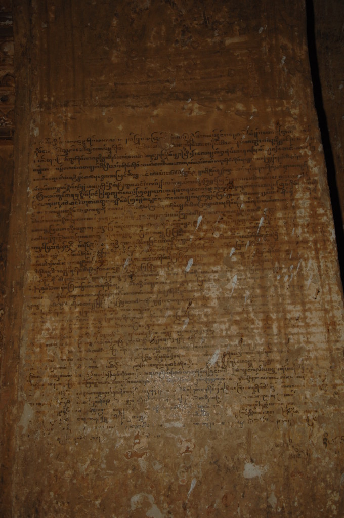 Inschriften in der Mon-Sprache im Inneren des Tempels. An den Außenwänden sind noch einige der ursprünglichen Stuckreliefs erhalten. - Shwe-leik-tu Tempel (13. Jhdt.)