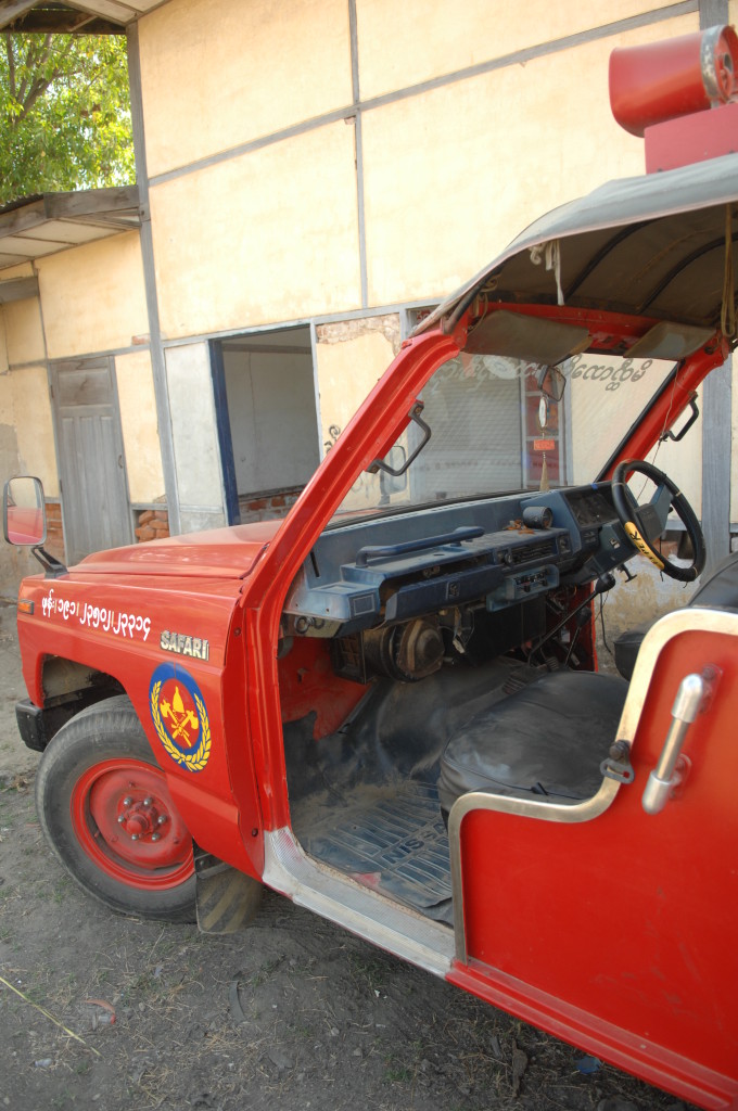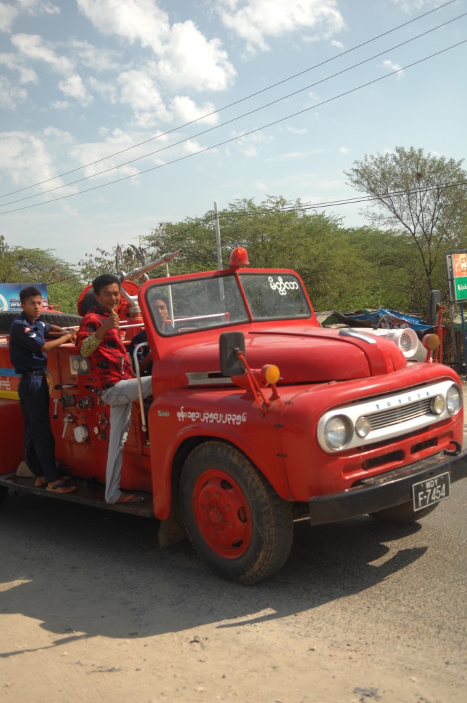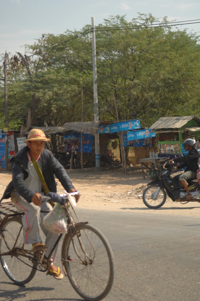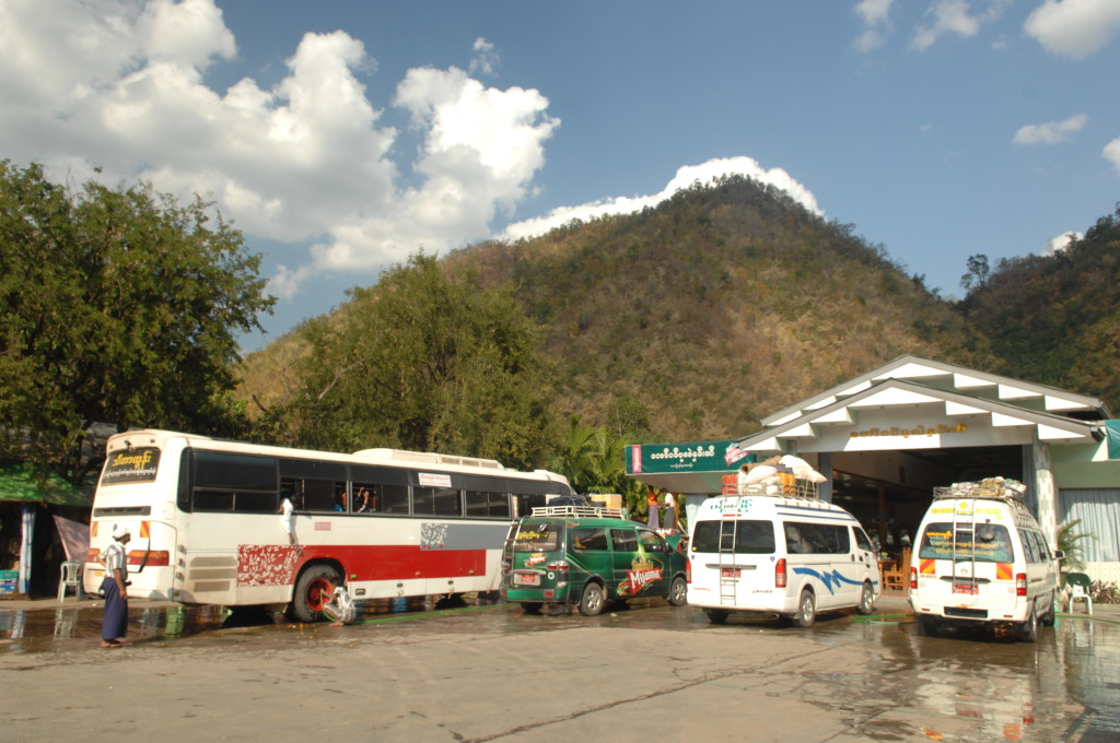 Wir passieren Payangazu, einen kleinen Ort über den ein schlanker, stehender Buddha auf einem Hügel wacht. Allmählich wird es hügeliger, Steinbrüche säumen die Straße und wir überqueren ausgetrocknete Flussbetten. Für Abwechslung sorgen die zahlreichen Tankstellen alle paar Kilometer. Vor zwei Jahren waren sie noch eine Rarität und selten zu finden. Bunte Farbtupfer in der staubig-grauen Landschaft: Myawaddy, Green Luck, Asia Energy, SBP Oil und einige mit für uns nicht zu entziffernden Namen in der hiesigen Schrift.
