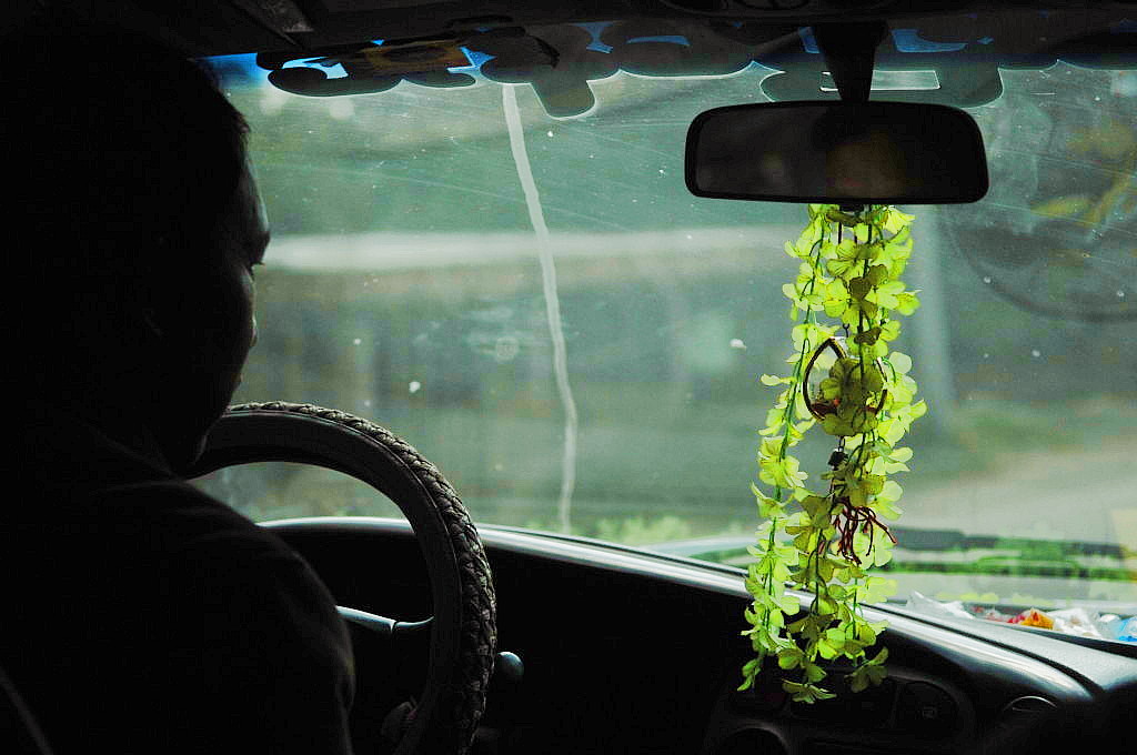 Weiter am Fluss entlang geht es vorbei an Reisterrassen und Bananen Plantagen. Erste Fachwerkhäuser kommen in Sicht, die typische Architektur dieser Gegend. Und immer wieder Buchten und Plätze mit Wasserschläuchen zum Kühlen der Bremsen. Oft riecht es beim Vorbeifahren nach verbrannten Bremsbelägen. Einige Kühlstationen später ist es dann soweit. In engen Serpentinen schraubt sich der Minivan den Berg hinauf. Nur einmal halten wir kurz an. Ein Anhalter ist der Grund. Das Geld hätte unser Fahrer sicher gern verdient, aber der Wagen ist voll. Er deutet auf das Wagendach mit den Rucksäcken. Da wäre noch Platz. Das scheint dem potentiellen zusätzlichen Passagier aber doch nicht so ganz geheuer. So stabil wie die Dachkonstruktionen der Sammel-PickUpS (Songthew) ist der Gepäckträger des Minivan nicht. Nach kurzer Diskussion fahren wir schließlich ohne einen weiteren Mitfahrer weiter den Berg hinauf.