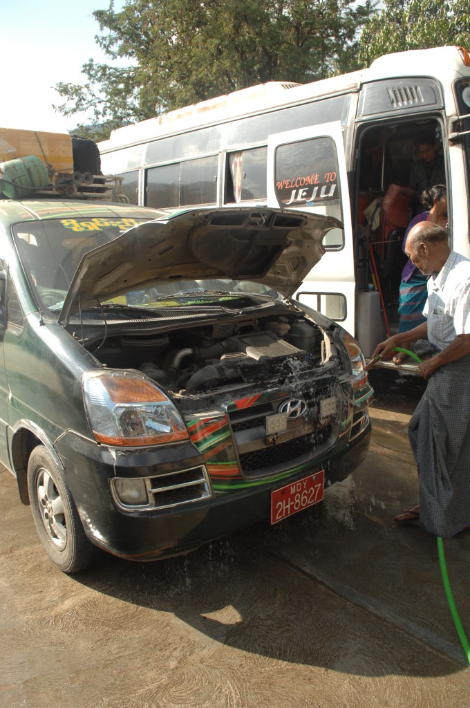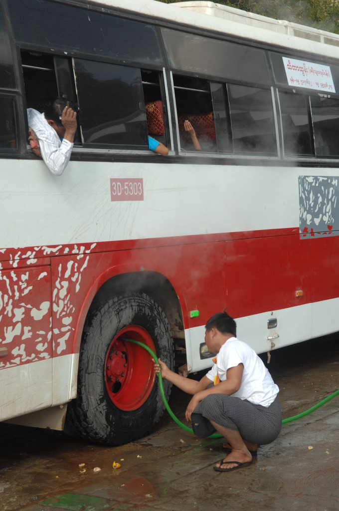 Noch 45 Straßenkilometer bis Kalaw und die Straße wird immer kurviger, dann nach einer Baustelle nur noch 1,5 spurig und deutlich holpriger als zuvor. Fünf Kilometer vor dem steilsten Streckenabschnitt mit Serpentinen legt unser Fahrer noch einen längeren Stopp ein. An der Raststätte das gewohnte Bild aus Myanmars Bergen: Gartenschläuche liegen bereit, um Kühler und Bremsen zu kühlen. Aus den Felgen des Busses neben uns zischt und qualmt es, als das Wasser hineinspritzt. Er kommt offensichtlich aus Kalaw und hat bergab hinter sich, was bergauf noch vor uns liegt.