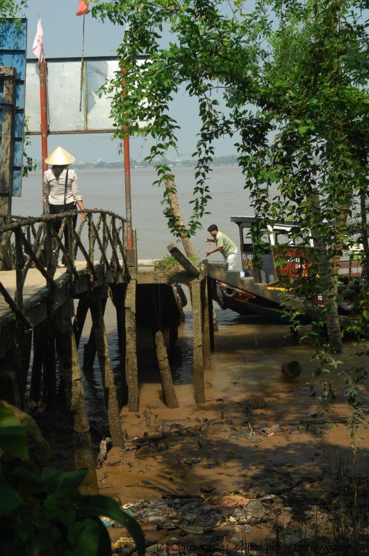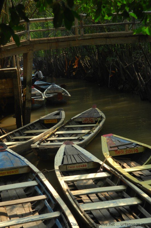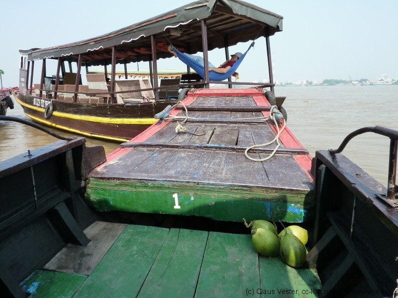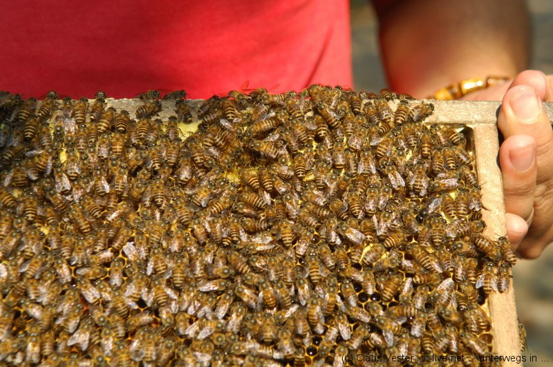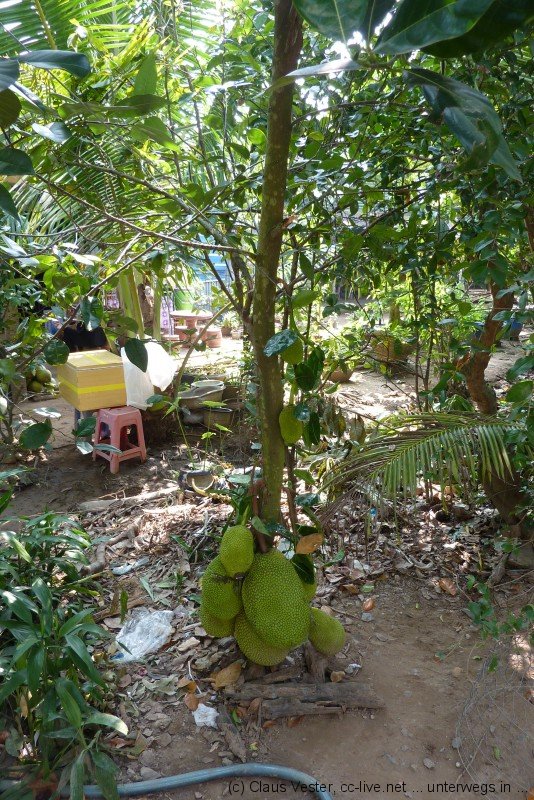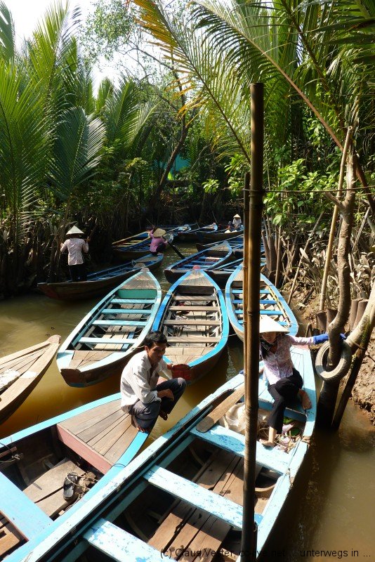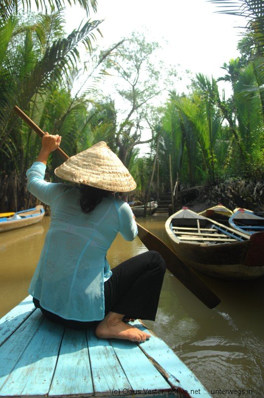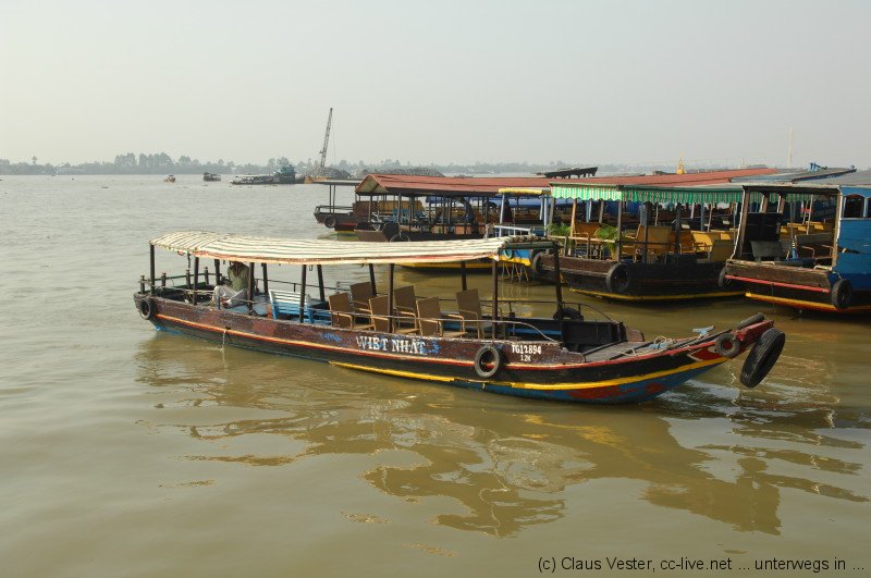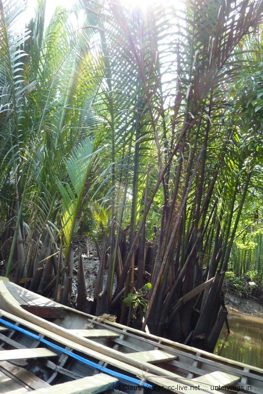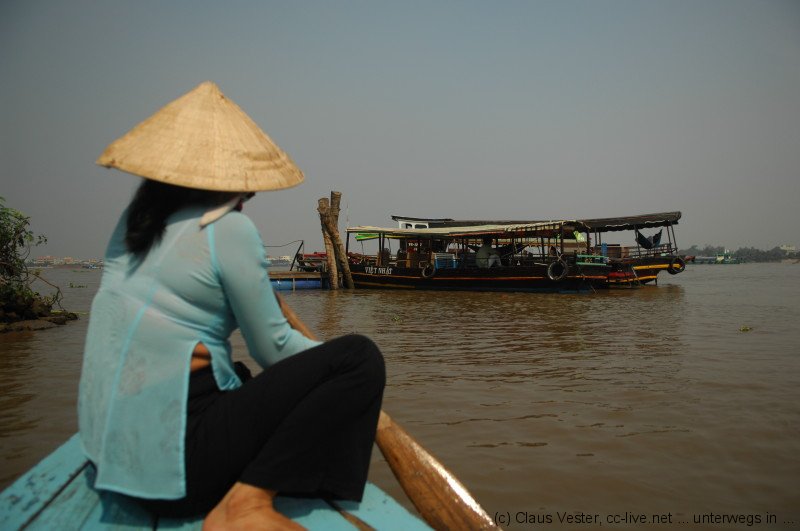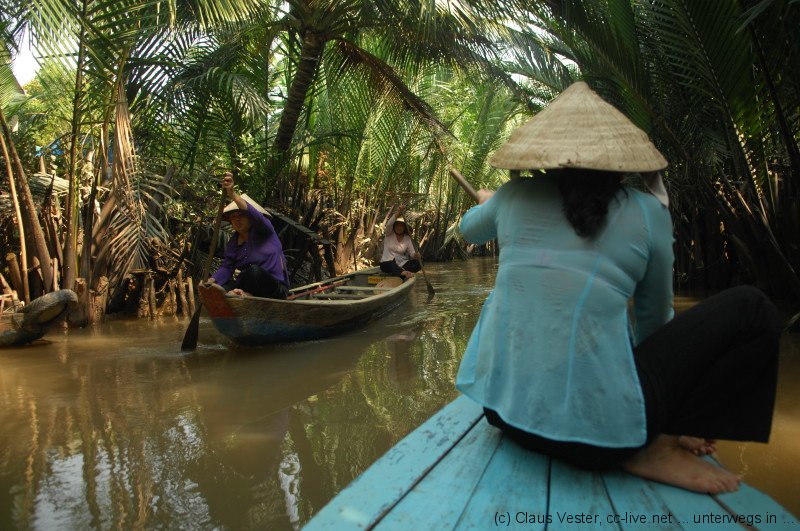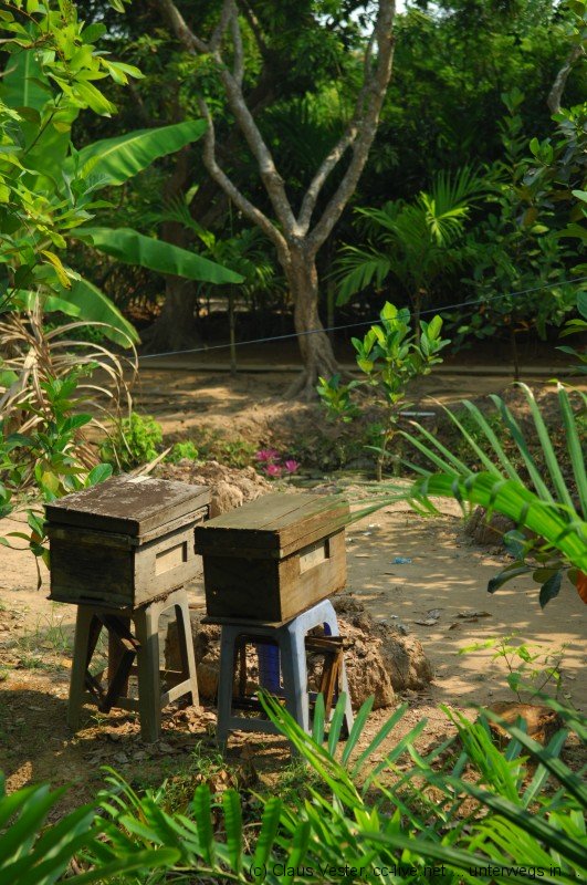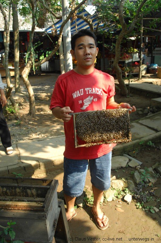 Der Zeitpunkt ist gut gewählt. Noch vor den Touristenströmen, die ab Mittag die Mekong-Inseln in der Nähe von My Tho überfallen, fahren wir gegen 9 Uhr an Bord eines kleinen Bootes in Richtung Con Lan. Die Einhorn-Insel wird erst seit rund 40 Jahren bewohnt. Heute leben hier etwa 300 Familien hauptsächlich vom Anbau zahlreicher Obstsorten und seit 10 Jahren auch von der Bienenzucht.
