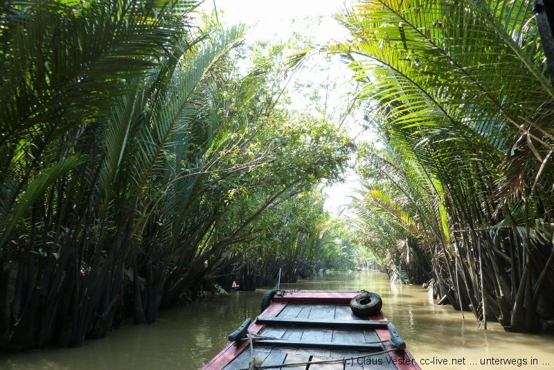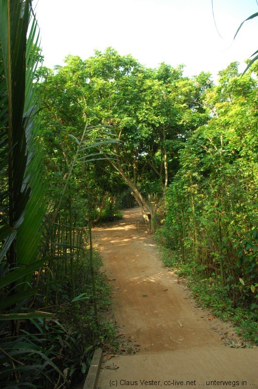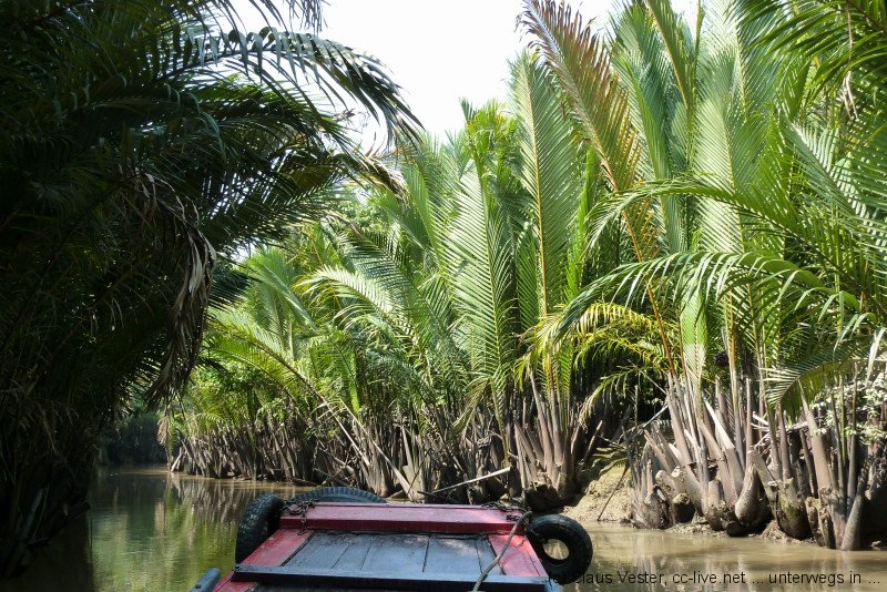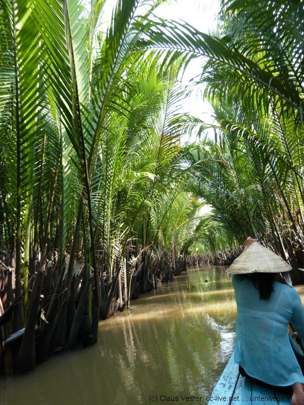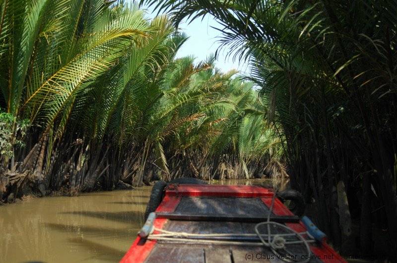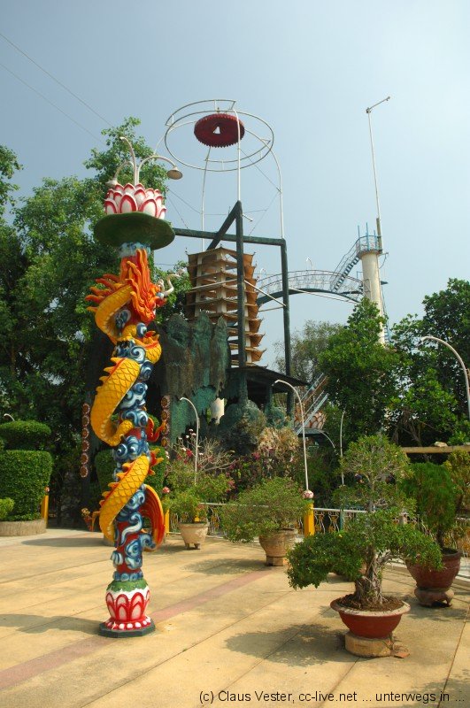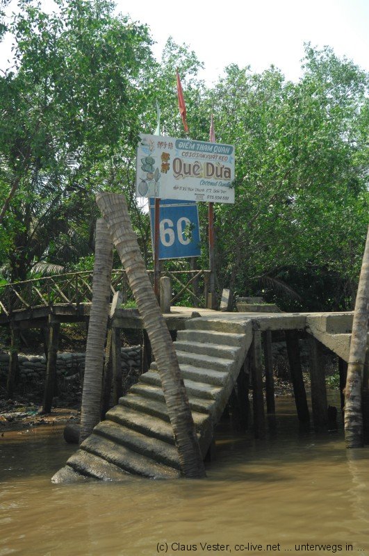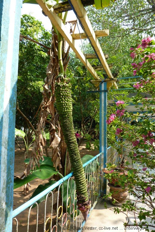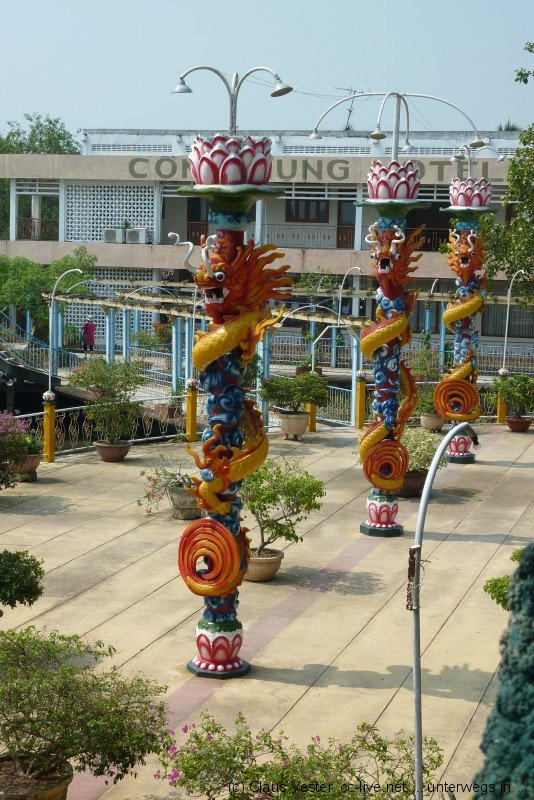 Nachdem wir auf ein kleineres Boot umgestiegen sind, fahren wir durch einen schmalen, Palmen gesäumten Kanal, bis wir wieder den Mekong erreichen. Hier wartet schon unserer größeres Boot und bringt uns zur Phönix-Insel (Con Phung). Bereits von der Anlegestelle aus sind die Reste eines skurrilen Klosters zu sehen. Sie erinnern eher an ein verrostetes Disneyland mit Cao-Dai-Einflüssen als an einen spirituellen Ort. In der Anlage lebte bis 1990 Ong Dao Dua, der Kokosnuss-Mönch. Er gründete eine Religion mit dem Namen Tinh Do Cu Si, die Elemente des Buddhismus, Taoismus und Christentum miteinander vermischte.